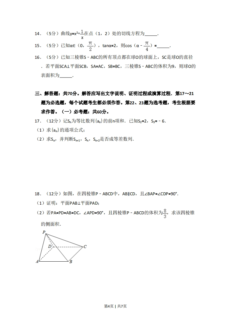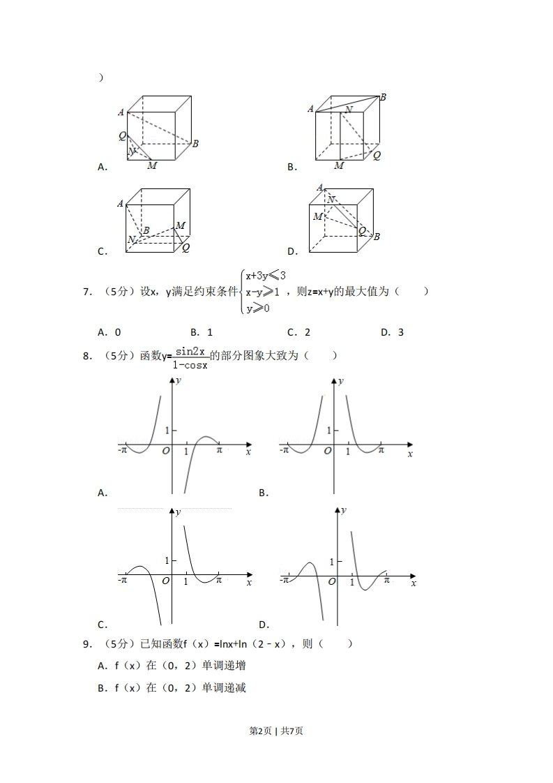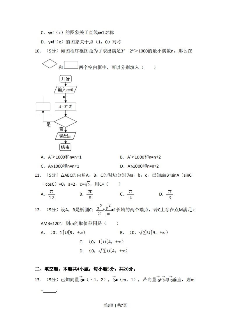 2017年全国统一高考数学试卷(文科)(新课标I)一、选择题:本大题共12小题,每小题5分,共60分。在每小题给出的四个选项中,只有一项是符合题目要求的。1.(5分)已知集合A={xx<2},B={x3-2x>0},则()A.ANB=(xlx<3)B.ANB=0C.AUB=(xlx<3)D.AUB=R2.(5分)为评估一种农作物的种植效果,选了n块地作试验田.这n块地的亩产量(单位:kg)分别是x1,2,,Xn,下面给出的指标中可以用来评估这种农作物亩产量稳定程度的是()A.X1,X2,…,Xn的平均数B.X1,X2,…,X的标准差C.X1,X2,,Xn的最大值D.X1,X2,…,X的中位数3.(5分)下列各式的运算结果为纯虚数的是()A.i(1+i)2B.i2(1-i)C.(1+i)2D.i(1+i)4.(5分)如图,正方形ABCD内的图形来自中国古代的太极图.正方形内切圆中的黑色部分和白色部分关于正方形的中心成中心对称.在正方形内随机取一点,则此点取自黑色部分的概率是()A.1B.π8c.2D.45.(5分)已知F是双曲线C:心-y21的右焦点,P是C上一点,且PF与x轴垂直,点A的坐标是(1,3),则△APF的面积为()A吉B.c号o昌6.(5分)如图,在下列四个正方体中,A,B为正方体的两个顶点,M,N,Q为所在棱的中点,则在这四个正方体中,直线AB与平面MNQ不平行的是(第1页1共7页Dx+3y≤37.(5分)设x,y满足约束条件xy>1,则z=x+y的最大值为()y0A.0B.1C.2D.38.(5分)函数yin2x的部分图象大致为()1-cosx0C.9.(5分)已知函数f(x)=nx+Hn(2-x),则()A.f(x)在(0,2)单调递增B.f(x)在(0,2)单调递减第2页1共7页C.y=f(x)的图象关于直线x=1对称D.y=f(x)的图象关于点(1,0)对称10.(5分)如图程序框图是为了求出满足3n-2n>1000的最小偶数n,那么在和两个空白框中,可以分别填入()开始输入=0A=3-2”输出n结束A.A>1000和n=n+1B.A>1000和n=n+2C.A≤1000和n=n+1D.A≤1000和n=n+211,(5分)△ABc的内角A,B,C的对边分别为a,b,c,已知sinB+sinA(sinC-cosC)=0,a=2,c=√2,则C=()A.12B.6c.π4D罗12.(5分)设A,B是椭圆C:2y21长轴的两个端点,若C上存在点M满足∠3 mAMB=120°,则m的取值范围是()A.(0,1]U[9,+oo)B.(0,√3U[9,+o)C.(0,1]U[4,+o)D.(0,√]U[4,+oo)二、填空题:本题共4小题,每小题5分,共20分。13.(5分)已知向量(-1,2),=(m,1),若向量tb与垂直,则m第3页1共7页