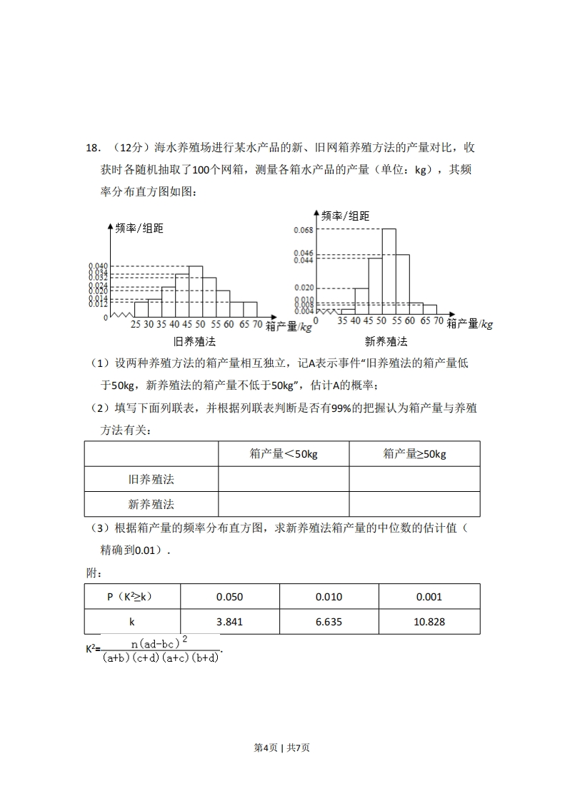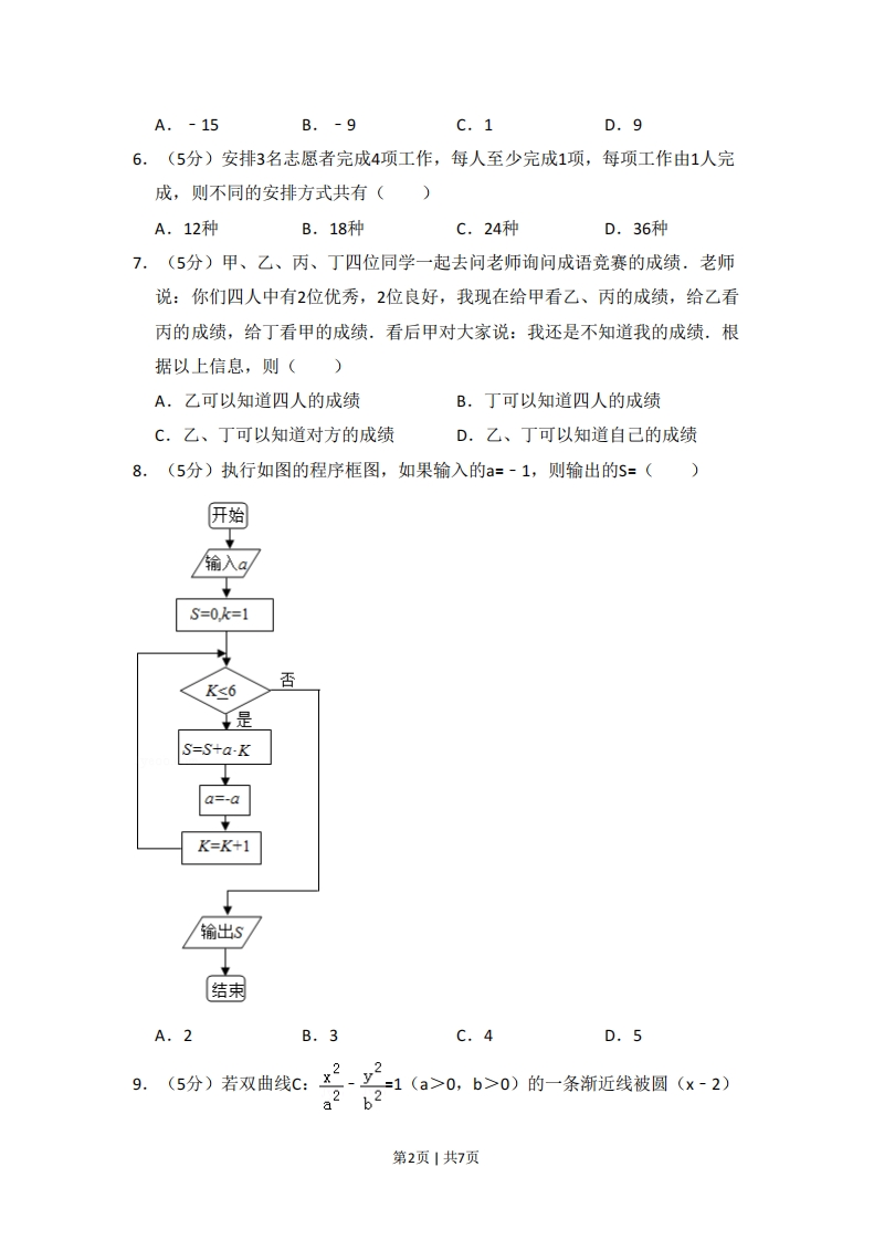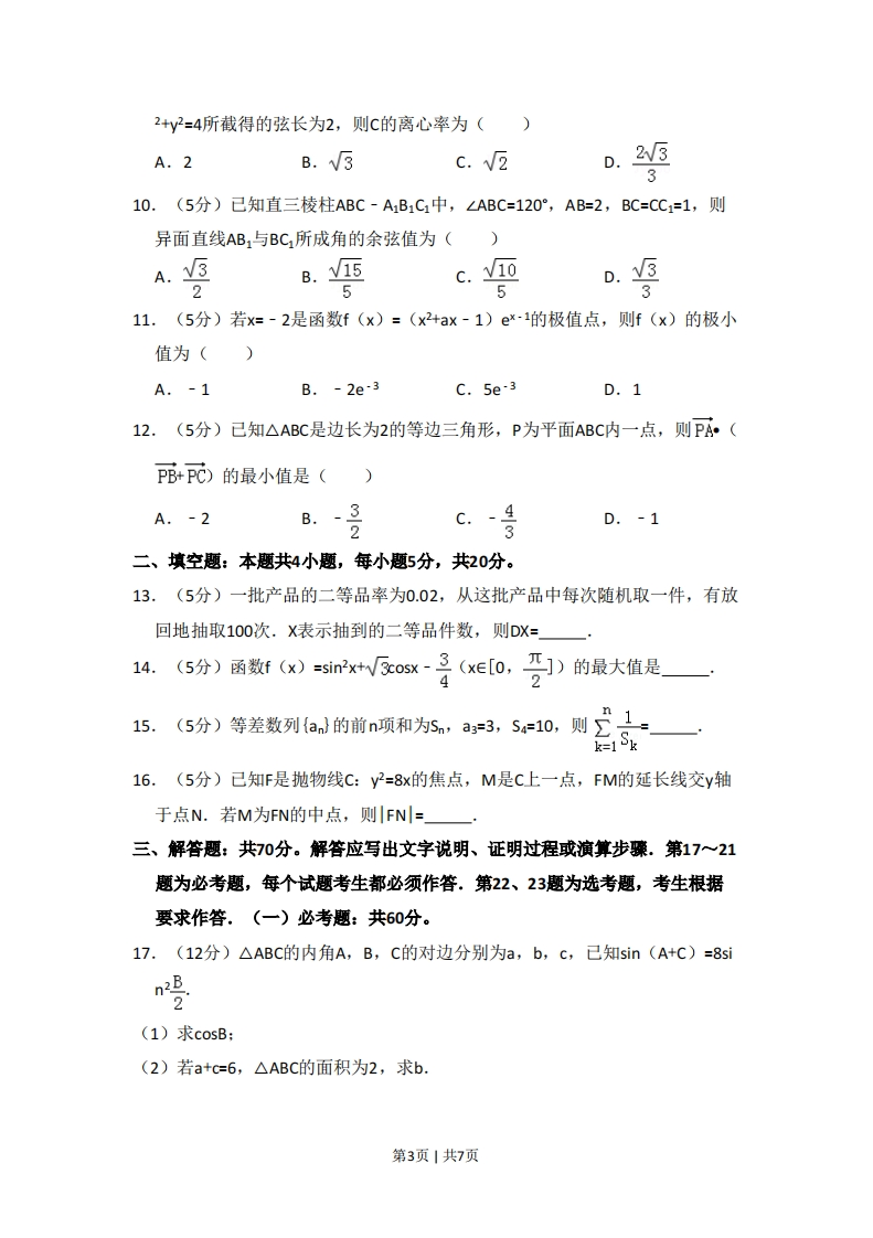 2017年全国统一高考数学试卷(理科)(新课标Ⅱ)一、选择题:本题共12小题,每小题5分,共60分。在每小题给出的四个选项中,只有一项是符合题目要求的。1.(5分)3+i=()1+iA.1+2iB.1-2iC.2+iD.2-i2.(5分)设集合A={1,2,4},B={xx2-4x+m=0}.若AnB={1},则B=(八A.{1,-3}B.{1,0}C.{1,3}D.{1,5}3.(5分)我国古代数学名著《算法统宗》中有如下问题:“远看巍巍塔七层,红光点点倍加增,共灯三百八十一,请问尖头几盏灯?”意思是:一座7层塔共挂了381盏灯,且相邻两层中的下一层灯数是上一层灯数的2倍,则塔的顶层共有灯()A.1盏B.3盏C.5盏D.9盏4.(5分)如图,网格纸上小正方形的边长为1,粗实线画出的是某几何体的三视图,该几何体由一平面将一圆柱截去一部分后所得,则该几何体的体积为()A.90mB.63πC.42πD.36π2x+3y-3≤05.(5分)设x,y满足约束条件2x-3y+3>0,则z=2x+y的最小值是()y+30第1页1共7页A.-15B.-9C.1D.96.(5分)安排3名志愿者完成4项工作,每人至少完成1项,每项工作由1人完成,则不同的安排方式共有()A.12种B.18种C.24种D.36种7.(5分)甲、乙、丙、丁四位同学一起去问老师询问成语竞赛的成绩.老师说:你们四人中有2位优秀,2位良好,我现在给甲看乙、丙的成绩,给乙看丙的成绩,给丁看甲的成绩.看后甲对大家说:我还是不知道我的成绩.根据以上信息,则()A.乙可以知道四人的成绩B.丁可以知道四人的成绩C.乙、丁可以知道对方的成绩D.乙、丁可以知道自己的成绩8.(5分)执行如图的程序框图,如果输入的a=-1,则输出的S=()开始输入aS=0k=1否、K≤6是S=S+a-Ka=-aK=K+1输出S结束A.2B.3C.4D.5239.(5分)若双曲线C:x221(a>0,b>0)的一条渐近线被圆(x-2)第2页1共7页2+y2=4所截得的弦长为2,则c的离心率为()A.2B.√3c.2D.23310.(5分)已知直三棱柱ABC-A1B1C1中,∠ABC=120°,AB=2,BC=CC1=1,则异面直线AB1与BC所成角的余弦值为()A.2B.V15c.10D.5311.(5分)若x=-2是函数f(x)=(x2+ax-1)e×-1的极值点,则f(x)的极小值为()A.-1B.-2e-3C.5e-3D.112.(5分)已知△ABC是边长为2的等边三角形,P为平面ABC内一点,则PA(P+PC)的最小值是()A.-2B.-3C.-D.-13二、填空题:本题共4小题,每小题5分,共20分。13.(5分)一批产品的二等品率为0.02,从这批产品中每次随机取一件,有放回地抽取100次.X表示抽到的二等品件数,则DX=14.(5分)函数f(x)=sin2x+V3osx-三(xe[0,罗])的最大值是15.(5分)等差数列a的前n项和为5a3,510,则定k=18k16.(5分)已知F是抛物线C:y2=8x的焦点,M是C上一点,FM的延长线交y轴于点N.若M为FN的中点,则|FN=三、解答题:共70分。解答应写出文字说明、证明过程或演算步骤.第17~21题为必考题,每个试题考生都必须作答。第22、23题为选考题,考生根据要求作答.(一)必考题:共60分。17.(12分)△ABC的内角A,B,C的对边分别为a,b,c,已知sin(A+C)=8sin2B(1)求cosB:(2)若a+c=6,△ABC的面积为2,求b.第3页1共7页