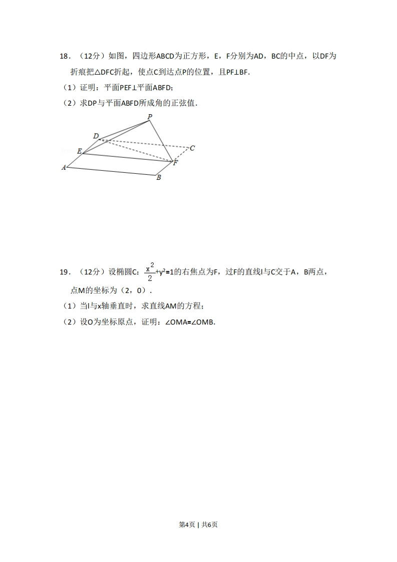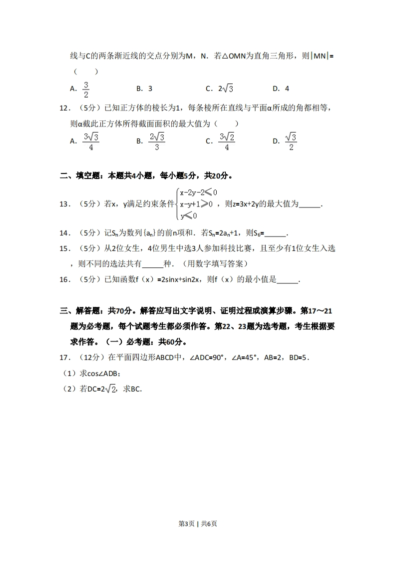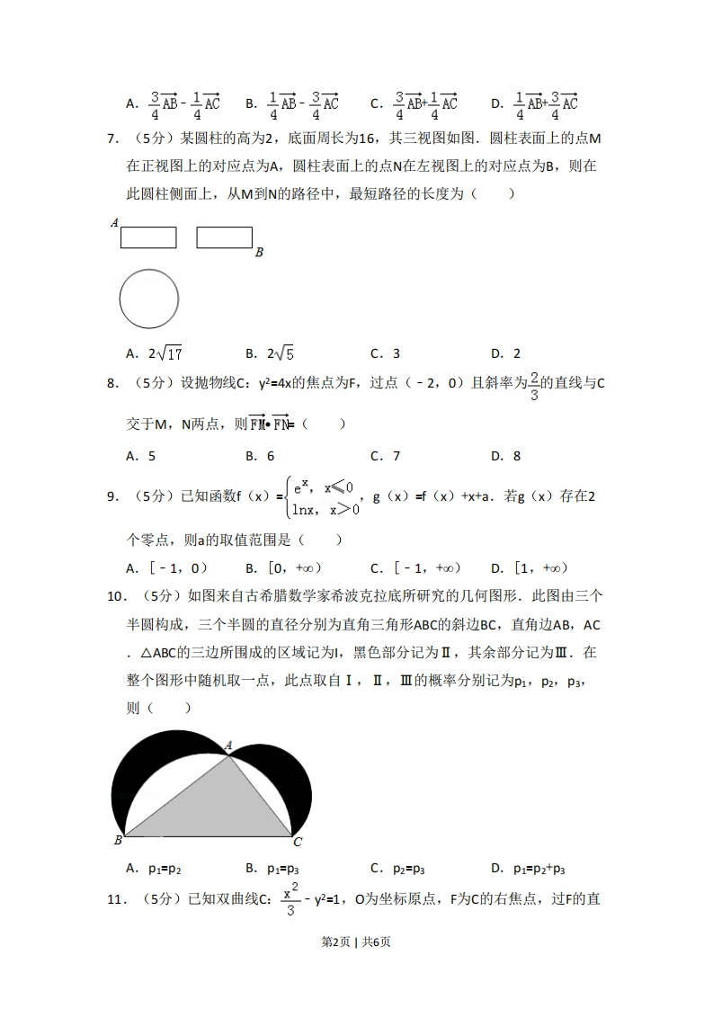 2018年全国统一高考数学试卷(理科)(新课标I)一、选择题:本题共12小题,每小题5分,共60分。在每小题给出的四个选项中,只有一项是符合题目要求的。1.(5分)设z=1-主+2i,则z=()1+iA.0C.1D.22.(5分)已知集合A={xx2-X-2>0},则CA=()A.{x-12}D.{xx≤-1}U{xx之2}3.(5分)某地区经过一年的新农村建设,农村的经济收入增加了一倍,实现翻番.为更好地了解该地区农村的经济收入变化情况,统计了该地区新农村建设前后农村的经济收入构成比例,得到如下饼图:第三产业收入第三产业收入28%种植收入60%6%种植收入4%其他收入37%5%其他收入30%30%养殖收入养殖收入建设前经济收入构成比例建设后经济收入构成比例则下面结论中不正确的是()A.新农村建设后,种植收入减少B.新农村建设后,其他收入增加了一倍以上C.新农村建设后,养殖收入增加了一倍D.新农村建设后,养殖收入与第三产业收入的总和超过了经济收入的一半4.(5分)记Sn为等差数列{an}的前n项和.若3S3=S2+S4,a1=2,则a5=()A.-12B.-10C.10D.125.(5分)设函数f(x)=x3+(a-1)x2+ax.若f(x)为奇函数,则曲线y=f(x)在点(0,0)处的切线方程为()A.y=-2xB.y=-xC.y=2xD.y=x6.(5分)在△ABC中,AD为BC边上的中线,E为AD的中点,则EB=()第1页1共6页A.3AB-1AC B.1AB-3AC C.3AB+1ACD.1AB+3AC4444447.(5分)某圆柱的高为2,底面周长为16,其三视图如图.圆柱表面上的点M在正视图上的对应点为A,圆柱表面上的点N在左视图上的对应点为B,则在此圆柱侧面上,从M到N的路径中,最短路径的长度为()A.2W17B.2W5C.3D.28.(5分)设抛物线C:y2=4x的焦点为F,过点(-2,0)且斜率为2的直线与C交于M,N两点,则F()A.5B.6C.7D.89.(5分)已知函数f(x)=e*,x0个零点,则a的取值范围是()A.[-1,0)B.[0,+o0)C.[-1,+0)D.[1,+oo)10,(5分)如图来自古希腊数学家希波克拉底所研究的几何图形.此图由三个半圆构成,三个半圆的直径分别为直角三角形ABC的斜边BC,直角边AB,AC·△ABC的三边所围成的区域记为,黑色部分记为Ⅱ,其余部分记为Ⅲ.在整个图形中随机取一点,此点取自I,Ⅱ,Ⅲ的概率分别记为P1,p2,p3,则()A.p1=p2B.p1=p3C.p2=p3D.p1=p2+p311.《(5分)已知双曲线c:=1,0为坐标原点,F为c的右焦点,过F的直3第2页1共6页线与C的两条渐近线的交点分别为M,N.若△OMN为直角三角形,则MN=()AB.3c.23D.412.(5分)已知正方体的棱长为1,每条棱所在直线与平面α所成的角都相等,则α截此正方体所得截面面积的最大值为()4.33B.2W3c.32D.34342二、填空题:本题共4小题,年小题5分,共20分。x-2y-2≤013.(5分)若x,y满足约束条件{xy+10,则z=3x+2y的最大值为014.(5分)记Sn为数列{an}的前n项和.若Sn=2an+1,则S6=15.(5分)从2位女生,4位男生中选3人参加科技比赛,且至少有1位女生入选,则不同的选法共有种.(用数字填写答案)16.(5分)已知函数f(x)=2sinx+sin2x,则f(x)的最小值是三、解答题:共70分。解答应写出文字说明、证明过程或演算步骤。第17~21题为必考题,每个试题考生都必须作答。第22、23题为选考题,考生根据要求作答。(一)必考题:共60分。17.(12分)在平面四边形ABCD中,∠ADC=90°,∠A=45°,AB=2,BD=5.(1)求cos∠ADB:(2)若DC=2V2,求BC.第3页1共6页