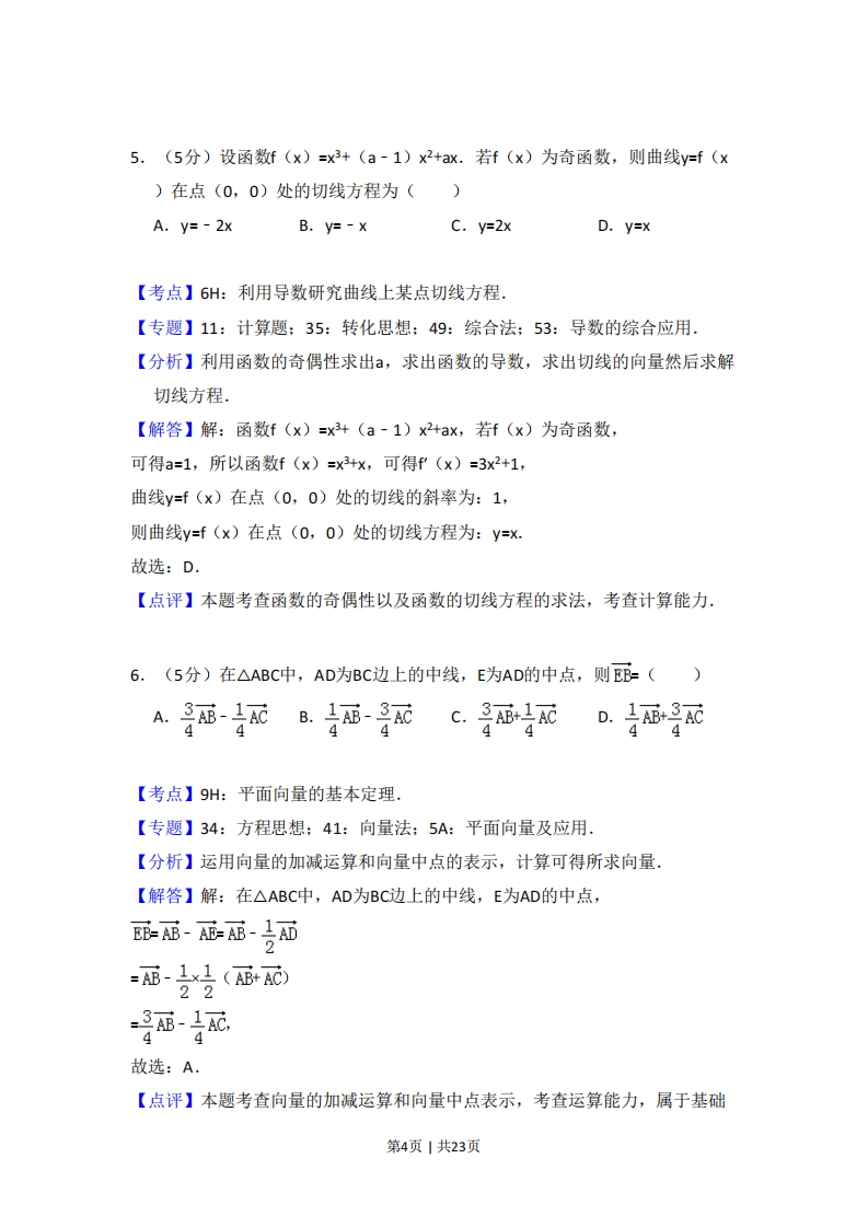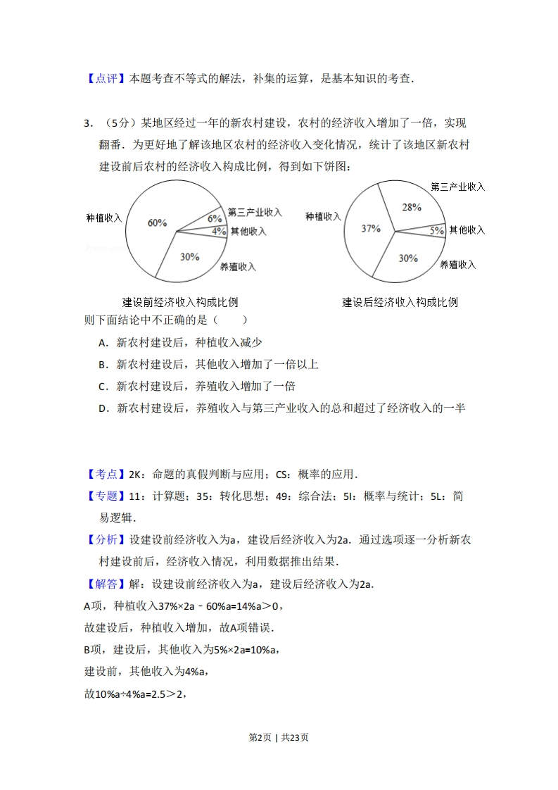 2018年全国统一高考数学试卷(理科)(新课标I)事考答案与试题佩折一、选择题:本题共12小题,每小题5分,共60分。在每小题给出的四个选项中,只有一项是符合题目要求的。1.(5分)设2=1-三+2i,则|z=()1+iA.0C.1D.√2【考点】A8:复数的模.【专题】11:计算题;35:转化思想:49:综合法:5N:数系的扩充和复数.【分析】利用复数的代数形式的混合运算化简后,然后求解复数的模。【解答】解:2=1+2=1--+2i=-1+2,1+i(1-i)(1+i)则川z=1.故选:C【点评】本题考查复数的代数形式的混合运算,复数的模的求法,考查计算能力2.(5分)已知集合A={xx2-X-2>0},则CA=()A.{x|-12}D.{xx≤-1}U{xx22【考点】1F:补集及其运算.【专题】11:计算题:35:转化思想;49:综合法:5:集合:5T:不等式.【分析】通过求解不等式,得到集合A,然后求解补集即可.【解答】解:集合A={xx2-x-2>0},可得A={xx<-1或x>2},则:CA={x-1≤2}.故选:B.第1页1共23页【点评】本题考查不等式的解法,补集的运算,是基本知识的考查.3.(5分)某地区经过一年的新农村建设,农村的经济收入增加了一倍,实现翻番.为更好地了解该地区农村的经济收入变化情况,统计了该地区新农村建设前后农村的经济收入构成比例,得到如下饼图:第三产业收入种植收入第三产业收入28%60%6%种植收入4网其他收入37%5%其他收入30%30%养殖收入养殖收入建设前经济收入构成比例建设后经济收入构成比例则下面结论中不正确的是()A.新农村建设后,种植收入减少B.新农村建设后,其他收入增加了一倍以上C.新农村建设后,养殖收入增加了一倍D.新农村建设后,养殖收入与第三产业收入的总和超过了经济收入的一半【考点】2K:命题的真假判断与应用:CS:概率的应用【专题】11:计算题:35:转化思想:49:综合法:5引:概率与统计:5L:简易逻辑。【分析】设建设前经济收入为a,建设后经济收入为2a.通过选项逐一分析新农村建设前后,经济收入情况,利用数据推出结果【解答】解:设建设前经济收入为a,建设后经济收入为2a.A项,种植收入37%×2a-60%a=14%a>0,故建设后,种植收入增加,故A项错误.B项,建设后,其他收入为5%×2a=10%a,建设前,其他收入为4%a,故10%a÷4%a=2.5>2,第2页1共23页故B项正确.C项,建设后,养殖收入为30%×2a=60%a,建设前,养殖收入为30%a,故60%a÷30%a=2,故C项正确.D项,建设后,养殖收入与第三产业收入总和为(30%+28%)×2a=58%×2a,经济收入为2a,故(58%×2a)÷2a=58%>50%,故D项正确,因为是选择不正确的一项,故选:A.【点评】本题主要考查事件与概率,概率的应用,命题的真假的判断,考查发现问题解决问题的能力,4.(5分)记Sn为等差数列{an}的前n项和.若3S3=52+S4,a1=2,则a5=()A.-12B.-10C.10D.12【考点】83:等差数列的性质,【专题】11:计算题:34:方程思想:40:定义法:54:等差数列与等比数列【分析】利用等差数列的通项公式和前n项和公式列出方程,能求出a5的值,【解答】解:Sn为等差数列{an}的前n项和,3S3=S2+S4,a1=2,3×3a,320aad4a4a.2把a1=2,代入得d=-3a5=2+4×(-3)=-10.故选:B.【点评】本题考查等差数列的第五项的求法,考查等差数列的性质等基础知识,考查运算求解能力,考查函数与方程思想,是基础题第3页|共23页