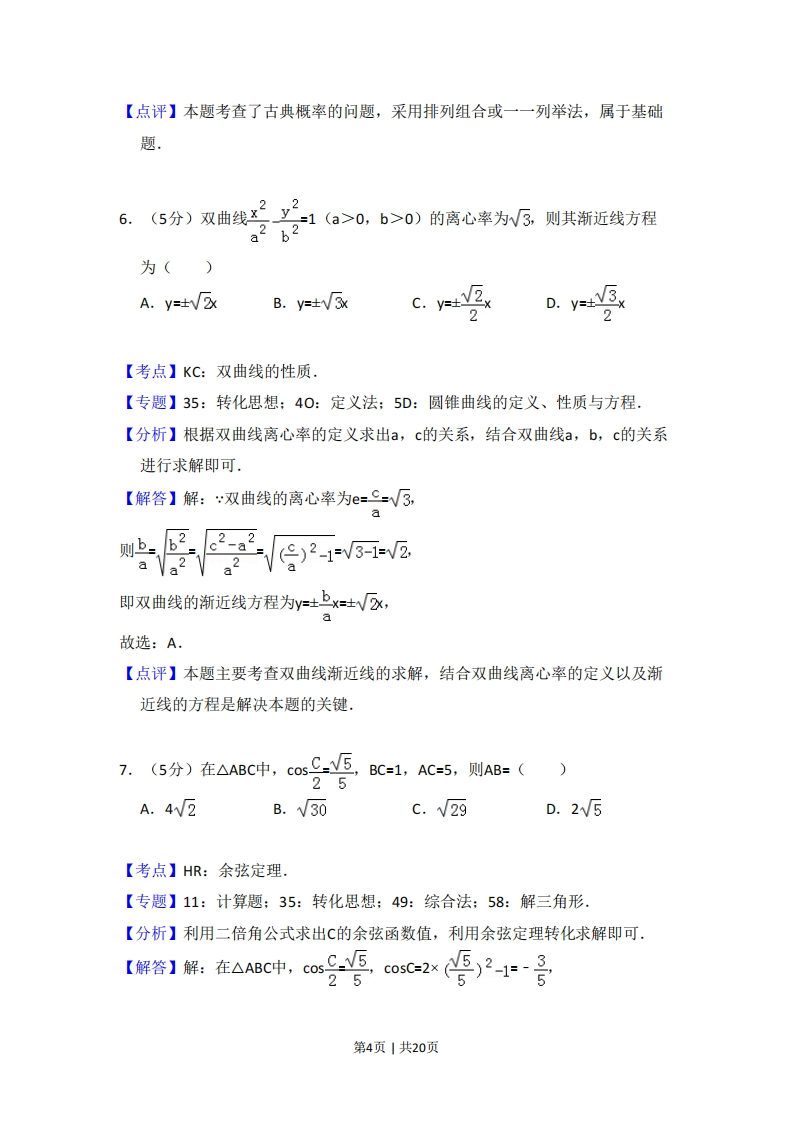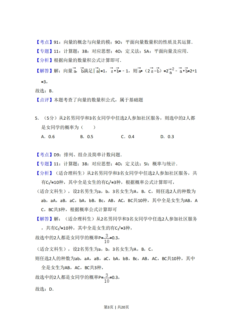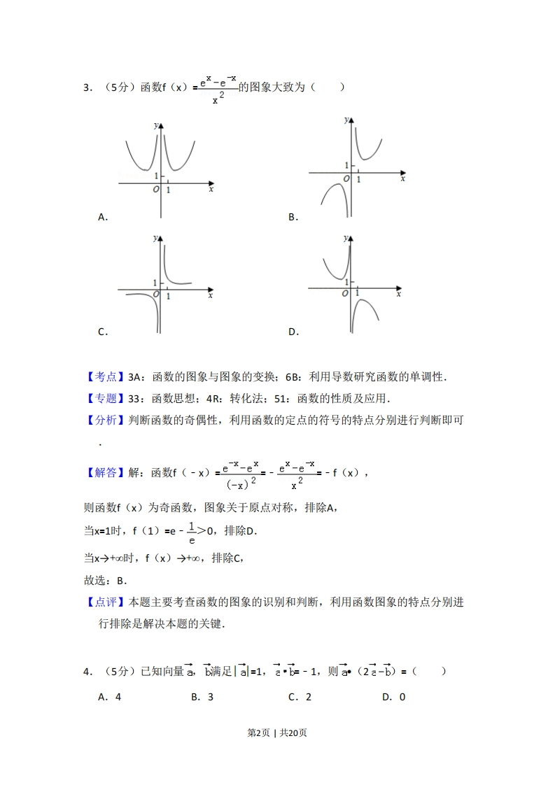 2018年全国统一高考数学试卷(文科)(新课标Ⅱ)事考答案与试题佩折一、选择题:本题共12小题,每小题5分,共60分。在每小题给出的四个选项中,只有一项是符合题目要求的。1.(5分)i(2+3i)=()A.3-2iB.3+2iC.-3-2iD.-3+2i【考点】A5:复数的运算,【专题】11:计算题;34:方程思想:40:定义法:5N:数系的扩充和复数,【分析】利用复数的代数形式的乘除运算法则直接求解,【解答】解:i(2+3i)=2i+32=-3+2i.故选:D.【点评】本题考查复数的求法,考查复数的代数形式的乘除运算法则等基础知识,考查运算求解能力,考查函数与方程思想,是基础题2.(5分)已知集合A={1,3,5,7},B={2,3,4,5},则A∩B=()A.{3}B.{5}C.{3,5}D.{1,2,3,4,5,7}【考点】1E:交集及其运算.【专题】11:计算题:37:集合思想:40:定义法;5引:集合【分析】利用交集定义直接求解,【解答】解:集合A={1,3,5,7},B={2,3,4,5},AnB={3,5}.故选:C.【点评】本题考查交集的求法,考查交集定义等基础知识,考查运算求解能力,考查函数与方程思想,是基础题,第1页|共20页(5分)函数f(×)=。一2—的图象大致为()【考点】3A:函数的图象与图象的变换:6B:利用导数研究函数的单调性.【专题】33:函数思想:4R:转化法:51:函数的性质及应用.【分析】判断函数的奇偶性,利用函数的定点的符号的特点分别进行判断即可【解答】解:函数f(-X--6-g-f(x),(x)2x2则函数f(x)为奇函数,图象关于原点对称,排除A,当x=1时,f(1)=e-上>0,排除D.当x→+oo时,f(x)→+o0,排除C,故选:B.【点评】本题主要考查函数的图象的识别和判断,利用函数图象的特点分别进行排除是解决本题的关键.4.(5分)已知向量a,b满足Ia=1,云=-1,则a(2a-b)=()A.4B.3C.2D.0第2页|共20页【考点】91:向量的概念与向量的模:90:平面向量数量积的性质及其运算.【专题】11:计算题:38:对应思想:40:定义法:5A:平面向量及应用.【分析】根据向量的数量积公式计算即可.【解答】解:向量a,b满足a=1,6-1,则a(2a-b)=2a2-a=2+1=3,故选:B.【点评】本题考查了向量的数量积公式,属于基础题5.(5分)从2名男同学和3名女同学中任选2人参加社区服务,则选中的2人都是女同学的概率为()A.0.6B.0.5c.0.4D.0.3【考点】D9:排列、组合及简单计数问题.【专题】11:计算题:38:对应思想:40:定义法:5引:概率与统计.【分析】(适合理科生)从2名男同学和3名女同学中任选2人参加社区服务,共有C2=10种,其中全是女生的有C32=3种,根据概率公式计算即可,(适合文科生),设2名男生为a,b,3名女生为A,B,C,则任选2人的种数为ab,aA,aB,aC,bA,bB,Bc,AB,AC,BC共10种,其中全是女生为AB,AC,BC共3种,根据概率公式计算即可【解答】解:(适合理科生)从2名男同学和3名女同学中任选2人参加社区服务,共有C52=10种,其中全是女生的有C32=3种,故选中的2人都是女同学的概率P=30.3,10(适合文科生),设2名男生为a,b,3名女生为A,B,C,则任选2人的种数为ab,aA,aB,aC,bA,bB,Bc,AB,AC,BC共10种,其中全是女生为AB,AC,BC共3种,故选中的2人都是女同学的概率P=3=0.3,10故选:D.第3页|共20页