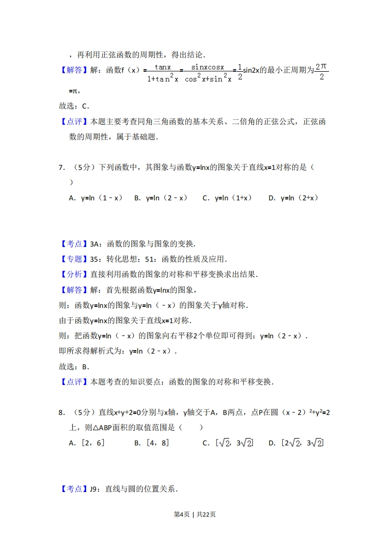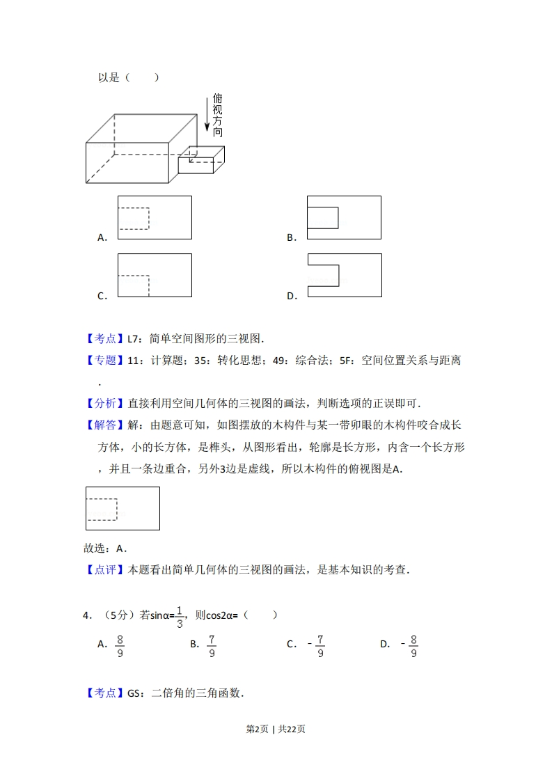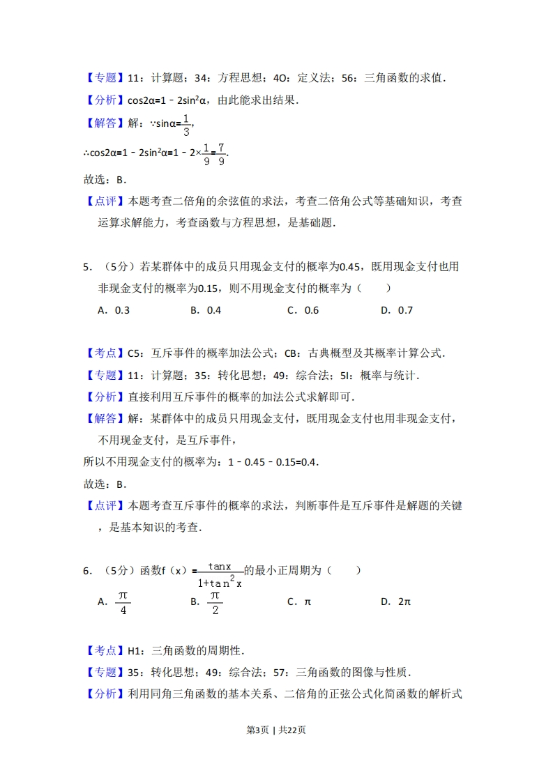 2018年全国统一高考数学试卷(文科)(新课标Ⅲ)事考答案与试题佩折一、选择题:本题共12小题,每小题5分,共60分。在每小题给出的四个选项中,只有一项是符合题目要求的。1.(5分)已知集合A={xx-1≥0},B={0,1,2},则A∩B=()A.{o}B.{1}C.{1,2}D.{0,1,2}【考点】1E:交集及其运算.【专题】37:集合思想;4A:数学模型法:5:集合.【分析】求解不等式化简集合A,再由交集的运算性质得答案.【解答】解:A={xx-1≥0}={xx之1},B={0,1,2},AnB={xx21}∩{0,1,2}={1,2}.故选:C【点评】本题考查了交集及其运算,是基础题,2.(5分)(1+i)(2-i)=()A.-3-iB.-3+iC.3-iD.3+i【考点】A5:复数的运算.【专题】38:对应思想:4A:数学模型法:5N:数系的扩充和复数.【分析】直接利用复数代数形式的乘除运算化简得答案,【解答】解:(1+i)(2-i)=3+i.故选:D.【点评】本题考查了复数代数形式的乘除运算,是基础题.3.(5分)中国古建筑借助榫卯将木构件连接起来.构件的凸出部分叫榫头,凹进部分叫卯眼,图中木构件右边的小长方体是榫头.若如图摆放的木构件与某一带卯眼的木构件咬合成长方体,则咬合时带卯眼的木构件的俯视图可第1页|共22页以是()视方向B.【考点】L7:简单空间图形的三视图.【专题】11:计算题:35:转化思想:49:综合法:5F:空间位置关系与距离【分析】直接利用空间几何体的三视图的画法,判断选项的正误即可.【解答】解:由题意可知,如图摆放的木构件与某一带卯眼的木构件咬合成长方体,小的长方体,是榫头,从图形看出,轮廓是长方形,内含一个长方形,并且一条边重合,另外3边是虚线,所以木构件的俯视图是A.故选:A【点评】本题看出简单几何体的三视图的画法,是基本知识的考查,4.(5分)若sina=13则cos2a=()A.89B.7C.-D.-999【考点】GS:二倍角的三角函数.第2页|共22页【专题】11:计算题:34:方程思想;40:定义法:56:三角函数的求值.【分析】cos2a=1-2sin2a,由此能求出结果.【解答】解:sina=cos2a=1-2sin2a=1-2x1-799故选:B【点评】本题考查二倍角的余弦值的求法,考查二倍角公式等基础知识,考查运算求解能力,考查函数与方程思想,是基础题.5.(5分)若某群体中的成员只用现金支付的概率为0.45,既用现金支付也用非现金支付的概率为0.15,则不用现金支付的概率为()A.0.3B.0.4Cc.0.6D.0.7【考点】C5:互斥事件的概率加法公式:CB:古典概型及其概率计算公式.【专题】11:计算题:35:转化思想:49:综合法:5引:概率与统计.【分析】直接利用互斥事件的概率的加法公式求解即可·【解答】解:某群体中的成员只用现金支付,既用现金支付也用非现金支付,不用现金支付,是互斥事件,所以不用现金支付的概率为:1-0.45-0.15=0.4.故选:B.【点评】本题考查互斥事件的概率的求法,判断事件是互斥事件是解题的关键,是基本知识的考查.6.(5分)函数f(x)=tanx。的最小正周期为()1+tanxA.48.r2C.πD.2π【考点】H1:三角函数的周期性,【专题】35:转化思想:49:综合法:57:三角函数的图像与性质.【分析】利用同角三角函数的基本关系、二倍角的正弦公式化简函数的解析式第3页|共22页