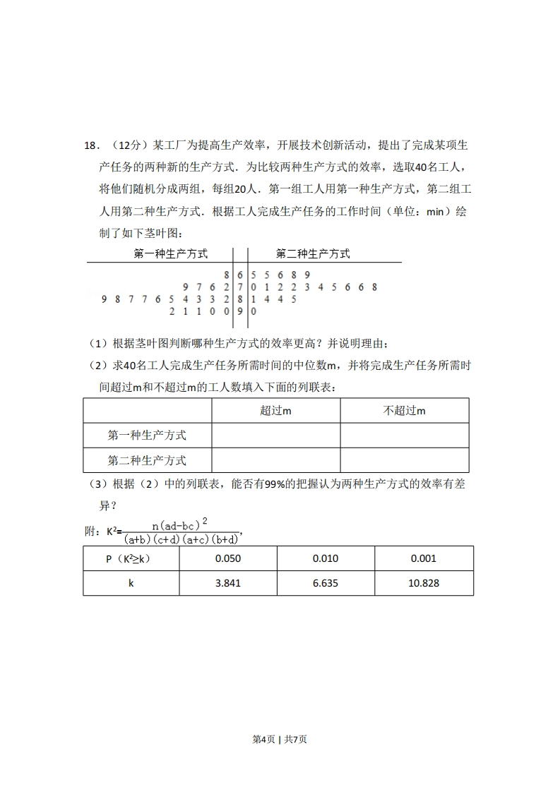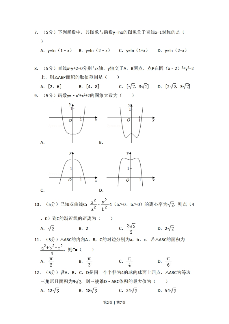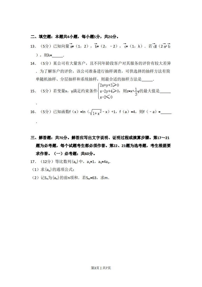 2018年全国统一高考数学试卷(文科)(新课标Ⅲ)一、选择题:本题共12小题,每小题5分,共60分。在每小题给出的四个选项中,只有一项是符合题目要求的。1.(5分)已知集合A={xx-1≥0},B={0,1,2},则A∩B=()A.(0}B.{1C.{1,2}D.{0,1,2}2.(5分)(1+i)(2-i)=(A.-3-iB.-3+iC.3-iD.3+i3.(5分)中国古建筑借助榫卯将木构件连接起来.构件的凸出部分叫榫头,凹进部分叫卯眼,图中木构件右边的小长方体是榫头,若如图摆放的木构件与某一带卯眼的木构件咬合成长方体,则咬合时带卯眼的木构件的俯视图可以是()视方B.C.4.(5分)若sina=1,则cos2a=(3A昌C.-D.-85.(5分)若某群体中的成员只用现金支付的概率为0.45,既用现金支付也用非现金支付的概率为0.15,则不用现金支付的概率为()A.0.3B.0.4c.0.6D.0.76.(5分)函数f(x)=tamx的最小正周期为()21+tanxA8.2C.πD.2π第1页1共7页7.(5分)下列函数中,其图象与函数y=nx的图象关于直线x=1对称的是()A.y=In (1-x)B.y=In (2-x)C.y=In (1+x)D.y=In (2+x)8.(5分)直线xy+2=0分别与x轴,y轴交于A,B两点,点P在圆(x-2)2+y2=2上,则△ABP面积的取值范围是()A.[2,6]B.[4,8]C.[√2,3WD.[2√2,3W②9.(5分)函数y=-x4+x242的图象大致为()05分)已狗双自线c等总1白>0,6>0)的高心率为NE则点4、23,0)到C的渐近线的距离为()A.√2B.2C.32D.2√2211.(5分)△ABC的内角A,B,C的对边分别为a,b,c.若△ABC的面积为2+62-62,则c=()4。号c晋D晋12.(5分)设A,B,C,D是同一个半径为4的球的球面上四点,△ABC为等边三角形且面积为9W3,则三棱锥D-ABC体积的最大值为()A.12V3B.18W3C.24W3D.54W3第2页1共7页二、填空题:本题共4小题,每小题5分,共20分。13.(5分)已知向量(1,2),=(2,-2),C=(1,λ).若C(2b),则入=14,(5分)某公司有大量客户,且不同年龄段客户对其服务的评价有较大差异·为了解客户的评价,该公司准备进行抽样调查,可供选择的抽样方法有简单随机抽样、分层抽样和系统抽样,则最合适的抽样方法是2x+y+3015.(5分)若变量x,y满足约束条件x-2y+4>0,则z=x+y的最大值是】x-2≤016.(5分)已知函数f(x)=ln(√1+x2-x)+1,f(a)=4,则f(-a)=一三、解答题:共70分。解答应写出文字说明、证明过程或演算步骤。第17~21题为必考题,每个试题考生都必须作答。第22、23题为选考题,考生根据要求作答。(一)必考题:共60分。17.(12分)等比数列{an}中,a1=1,as=4a3(1)求{an}的通项公式:(2)记Sn为{an}的前n项和.若Sm=63,求m.第3页1共7页