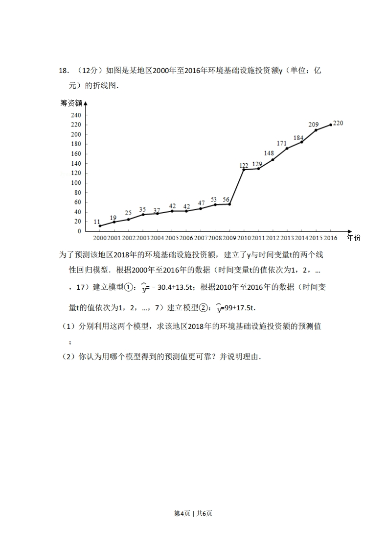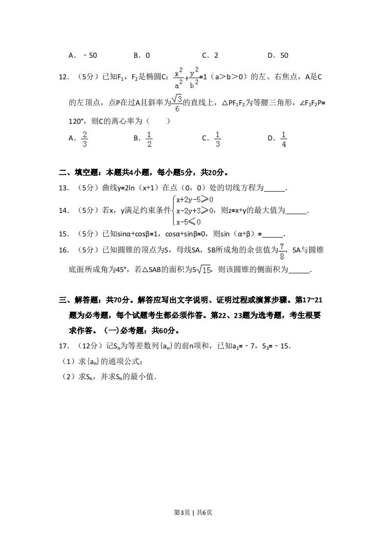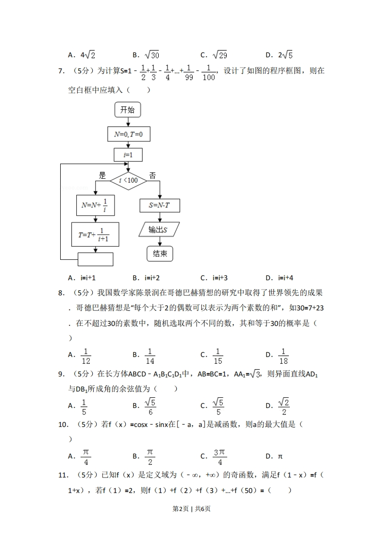 2018年全国统一高考数学试卷(理科)(新课标Ⅱ)一、选择题:本题共12小题,每小题5分,共60分。在每小题给出的四个选项中,只有一项是符合题目要求的。1.(5分)1+2i-(1-2iA号c号0.号2.(5分)已知集合A={(x,y)|x2+y2≤3,EZ,yEZ},则A中元素的个数为(A.9B.8C.5D.43.(5分)函数f(x):-g严的图象大致为(4.(5分)已知向量a,b满足|a=1,=-1,则(2a-b)=()A.4B.3C.2D.05、5分》双线写子1a>0b>0)的高心率为E则先南近线方程为()A.y=+V2B.y=+V3xC.y-V2xD.y-V3x26.(5分)在△ABC中,cosC=,BC=1,AC=5,则AB=()25第1页1共6页A.4W2B.√30C.√29D.2W57.(5分)为计算S=1-1+1-上+…+1-1,设计了如图的程序框图,则在23499100空白框中应填入(开始N=0,T=0=1是否i<100S=N-T输出Sf+1结束A.i=i+1B.i=i+2C.i=i+3D.i=i+48.(5分)我国数学家陈景润在哥德巴赫猜想的研究中取得了世界领先的成果·哥德巴赫猜想是“每个大于2的偶数可以表示为两个素数的和”,如30=7+23,在不超过30的素数中,随机选取两个不同的数,其和等于30的概率是()A立c9.(5分)在长方体ABCD-A1B1C1D1中,AB=BC=1,AA1=V3,则异面直线AD1与DB所成角的余弦值为()A吉B.c.⑤D.②610.(5分)若f(x)=cosx-sinx在[-a,a]是减函数,则a的最大值是()A.C.3π4B.I2D.π411.(5分)已知f(x)是定义域为(-0,+0)的奇函数,满足f(1-x)=f(1+x),若f(1)=2,则f(1)f(2)f(3)+.+f(50)=()第2页1共6页A.-50B.0C.2D.50卫《5分)已知,是椭圆C:支21(a>b>0)的左,右焦点,A是的左顶点,点P在过A且斜率为⑤的直线上,△PF,F2为等腰三角形,∠FF2P=120°,则c的离心率为()3A.B.1c.二、填空题:本题共4小题,每小题5分,共20分。13.(5分)曲线y=2n(x+1)在点(0,0)处的切线方程为一x+2y-5014.(5分)若×,y满足约束条件{x-2y+30,则z=x+y的最大值为x-54015.(5分)已知sina+cosB=1,cosa+sinB=0,则sin(a+B)=.16.(5分)已知圆锥的顶点为S,母线SA,SB所成角的余弦值为二,SA与圆锥底面所成角为45°,若△SAB的面积为5√5,则该圆锥的侧面积为一·三、解答题:共70分。解答应写出文字说明、证明过程或演算步骤。第17~21题为必考题,每个试题考生都必须作答。第22、23题为选考题,考生根要求作答。(一)必考题:共60分。17.(12分)记S为等差数列{an}的前n项和,已知a=-7,S-15.(1)求{an}的通项公式:(2)求Sn,并求Sn的最小值.第3页1共6页