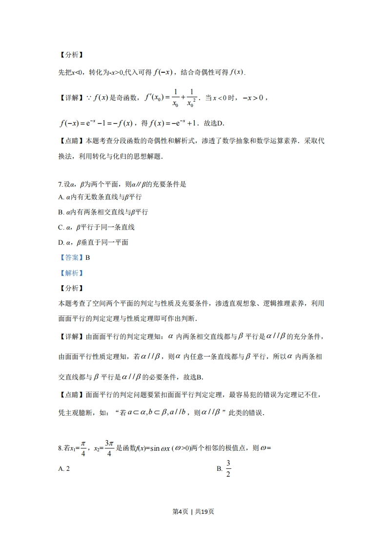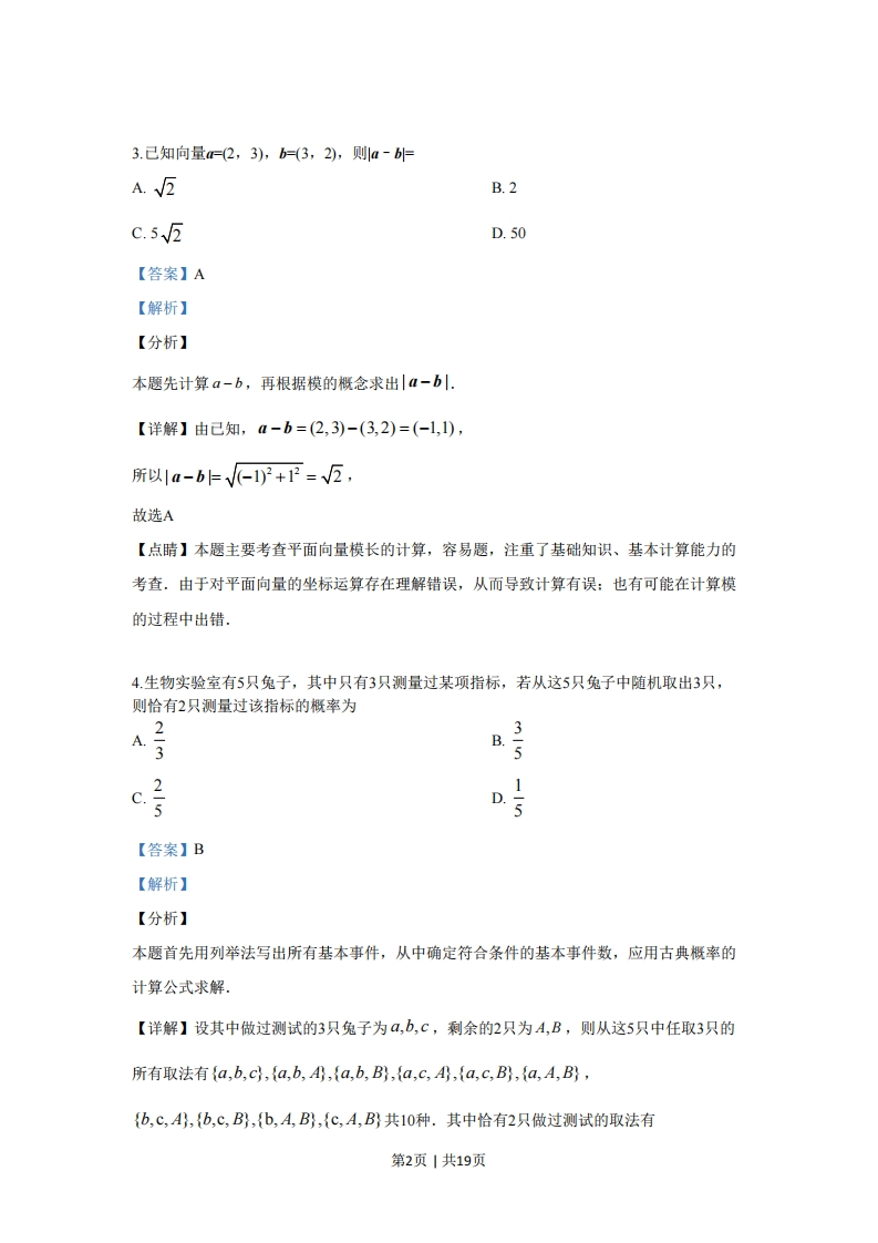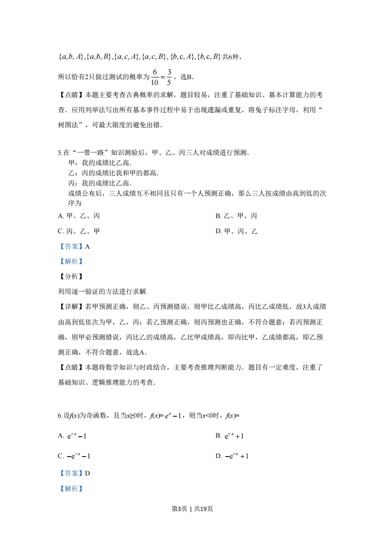 绝密★启用前2019年全国统一高考数学试卷(文科)(新课标Ⅱ)答案解析版一、选择题:本题共12小题,每小题5分,共60分.在每小题给出的四个选项中,只有一项是符合题目要求的.1.己知集合A={x|x>-1},B={x|x<2},则AnB=A.(-1,+o)B.(-c∞,2)C.-1,2)D.【答案】C【解析】【分析】本题借助于数轴,根据交集的定义可得.【详解】由题知,A∩B=(-1,2),故选C.【点睛】本题主要考查交集运算,容易题,注重了基础知识、基本计算能力的考查.易错点是理解集合的概念及交集概念有误,不能借助数轴解题.2.设=i(2+i),则三=A.1+2iB.-1+21C.1-2iD.-1-21【答案】D【解析】【分析】本题根据复数的乘法运算法则先求得:,然后根据共轭复数的概念,写出三.【详解】z=i(2+i)=2i+i2=-1+2i,所以三=-1-2i,选D【点睛】本题主要考查复数的运算及共轭复数,容易题,注重了基础知识、基本计算能力的考查.理解概念,准确计算,是解答此类问题的基本要求.部分考生易出现理解性错误第1页1共19页3.己知向量=(2,3),b=(3,2),则1a-=A.√互B.2c.55D.50【答案】A【解析】【分析】本题先计算a-b,再根据模的概念求出|a-b.【详解】由己知,a-b=(2,3)-(3,2)=(-1,1),所以a-b卡V-1)2+1P=√2,故选A【点睛】本题主要考查平面向量模长的计算,容易题,注重了基础知识、基本计算能力的考查.由于对平面向量的坐标运算存在理解错误,从而导致计算有误:也有可能在计算模的过程中出错.4.生物实验室有5只兔子,其中只有3只测量过某项指标,若从这5只兔子中随机取出3只,则恰有2只测量过该指标的概率为3A.B.2c.30.5【答案】B【解析】【分析】本题首先用列举法写出所有基本事件,从中确定符合条件的基本事件数,应用古典概率的计算公式求解.【详解】设其中做过测试的3只兔子为a,b,c,剩余的2只为A,B,则从这5只中任取3只的所有取法有{a,b,c,{a,b,A,{a,b,B},{a,C,A},{a,C,B},{a,A,B},{b,C,A,{b,C,B;,{b,A,B;,{C,A,B;共10种.其中恰有2只做过测试的取法有第2页|共19页{a,b,A,{a,b,B;,{a,c,A,{a,c,B,{b,C,A,{b,C,B共6种,所以恰有2只做过测试的概率为6305选B。【点睛】本题主要考查古典概率的求解,题目较易,注重了基础知识、基本计算能力的考查.应用列举法写出所有基本事件过程中易于出现遗漏或重复,将兔子标注字母,利用“树图法”,可最大限度的避免出错.5.在“一带一路”知识测验后,甲、乙、丙三人对成绩进行预测.甲:我的成绩比乙高.乙:丙的成绩比我和甲的都高。丙:我的成绩比乙高.成绩公布后,三人成绩互不相同且只有一个人预测正确,那么三人按成绩由高到低的次序为A.甲、乙、丙B.乙、甲、丙C.丙、乙、甲D.甲、丙、乙【答案】A【解析】【分析】利用逐一验证的方法进行求解,【详解】若甲预测正确,则乙、丙预测错误,则甲比乙成绩高,丙比乙成绩低,故3人成绩由高到低依次为甲,乙,丙:若乙预测正确,则丙预测也正确,不符合题意:若丙预测正确,则甲必预测错误,丙比乙的成绩高,乙比甲成绩高,即丙比甲,乙成绩都高,即乙预测正确,不符合题意,故选A【点睛】本题将数学知识与时政结合,主要考查推理判断能力.题目有一定难度,注重了基础知识、逻辑推理能力的考查。6.设x)为奇函数,且当之0时,xFe-1,则当r<0时,xFA.e-*-1B.e*+1C.-e-*-1D.-e+1【答案】D【解析】第3页1共19页