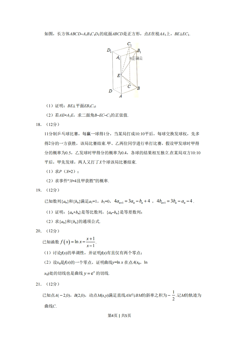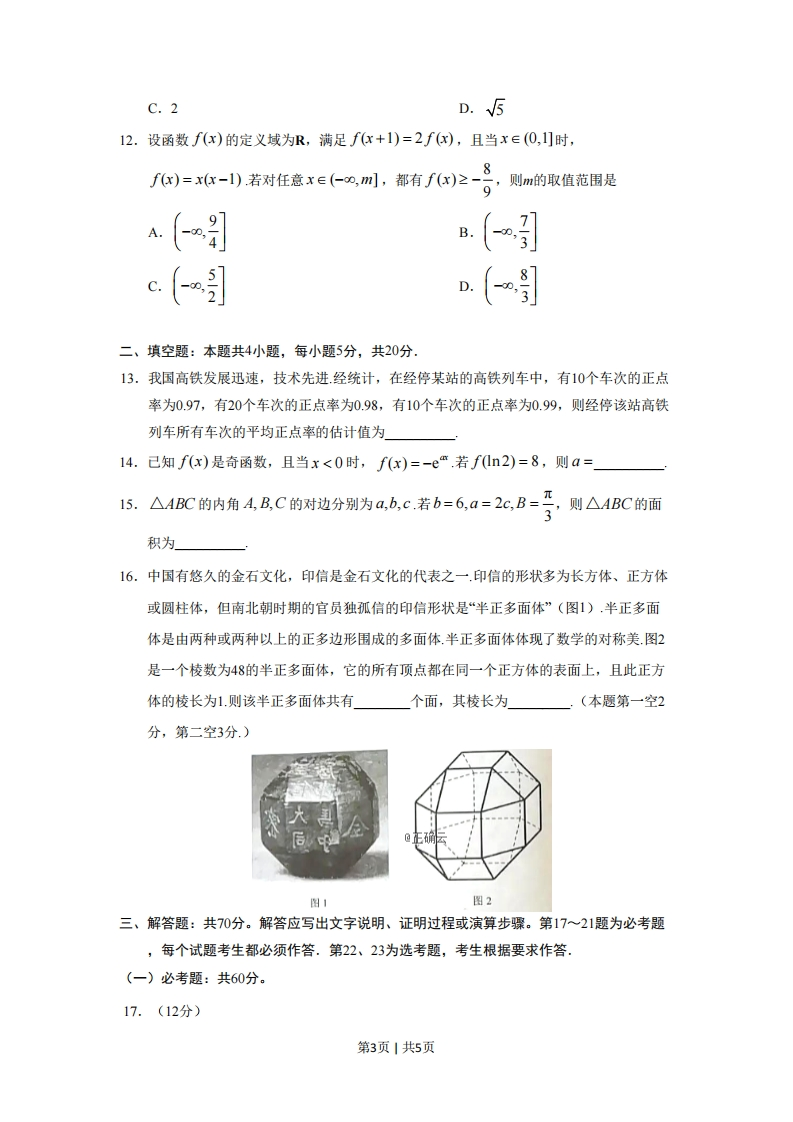 绝密★启用前2019年全国统一高考数学试卷(理科)(新课标Ⅱ)一、选择题:本题共12小题,每小题5分,共60分.在每小题给出的四个选项中,只有一项是符合题目要求的,1.设集合A={x25x+6>0},B={xt-1<0},则AnB=A.(-0,1)B.(-2,1)C.(3,-1)D.(3,+o)2.设:=3+2i,则在复平面内:对应的点位于A.第一象限B.第二象限C.第三象限D.第四象限3.己知AB=(2,3),AC=(3,),BC=1,则AB.BC=A.-3B.-2C.2D.34.2019年1月3日嫦娥四号探测器成功实现人类历史上首次月球背面软着陆,我国航天事业取得又一重大成就,实现月球背面软着陆需要解决的一个关键技术问题是地面与探测器的通讯联系.为解决这个问题,发射了嫦娥四号中继星“鹊桥”,鹊桥沿着围绕地月拉格朗日L2点的轨道运行.L2点是平衡点,位于地月连线的延长线上.设地球质量为M,月球质量为M2,地月距离为R,L2点到月球的距离为r,根据牛顿运动定律和万有引力定律,r满足方程:Rn+=R+n0(R+r)23a3+3a+设0=由于Q的值很小,因此在近似计算中-≈3α3,则的近似值(1+)2为BM2M第1页1共5页3M-RM2RM3M5.演讲比赛共有9位评委分别给出某选手的原始评分,评定该选手的成绩时,从9个原始评分中去掉1个最高分、1个最低分,得到7个有效评分.7个有效评分与9个原始评分相比,不变的数字特征是A.中位数B.平均数C.方差D.极差6.若a心b,则A.In(a-b)>0B.3a<3bC.a2-b>0D.a b7.设a,B为两个平面,则aB的充要条件是A.a内有无数条直线与B平行B.a内有两条相交直线与B平行C.a,平行于同一条直线D.a,垂直于同一平面8.若抛物线2-2px(p>0)的焦点是椭圆2一+=1的一个焦点,则p3p pA.2B.3C.4D.89.下列函数中,以?为周期且在区间(无,工)单调递增的是4”2A.Ax)=cos 2xB.Ax)=sin 2xC.fx)=cos|xD.Ax)=sin x10.已知ae0,T),2sin2a=cos2a+l,则sine2A.5B.5c.3D.2w5311.设F为双曲线C:京示=1(a>0,b>0)的右焦点,0为坐标原点,以0F为直径的x2 y2圆与圆x2+y2=a2交于P,Q两点.若PQ=|OF,则C的离心率为A.√2B.5第2页1共5页C.2D.512.设函数f(x)的定义域为R,满足f(心+1)=2f(x),且当x∈(0,1]时,)=xx-)若对任意x∈(-0,m,都有fx)之一。,则m的取值范围是c.二、填空题:本题共4小题,每小题5分,共20分13.我国高铁发展迅速,技术先进.经统计,在经停某站的高铁列车中,有10个车次的正点率为0.97,有20个车次的正点率为0.98,有10个车次的正点率为0.99,则经停该站高铁列车所有车次的平均正点率的估计值为14.己知f(x)是奇函数,且当x<0时,f(x)=-e“.若fn2)=8,则a=15.△4BC的内角A,B,C的对边分别为a,b,c.若b=6,a=2c,B=元,则△ABC的面积为16.中国有悠久的金石文化,印信是金石文化的代表之一.印信的形状多为长方体、正方体或圆柱体,但南北朝时期的官员独孤信的印信形状是“半正多面体”(图1).半正多面体是由两种或两种以上的正多边形围成的多面体半正多面体体现了数学的对称美.图2是一个棱数为48的半正多面体,它的所有顶点都在同一个正方体的表面上,且此正方体的棱长为1.则该半正多面体共有个面,其棱长为·(本题第一空2分,第二空3分.)后图1图2三、解答题:共70分。解答应写出文字说明、证明过程或演算步骤。第17~21题为必考题,每个试题考生都必须作答.第22、23为选考题,考生根据要求作答(一)必考题:共60分。17.(12分)第3页1共5页