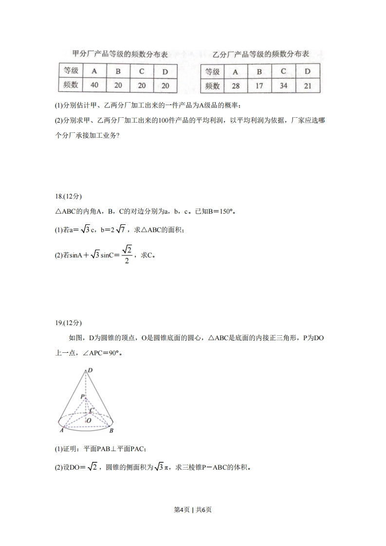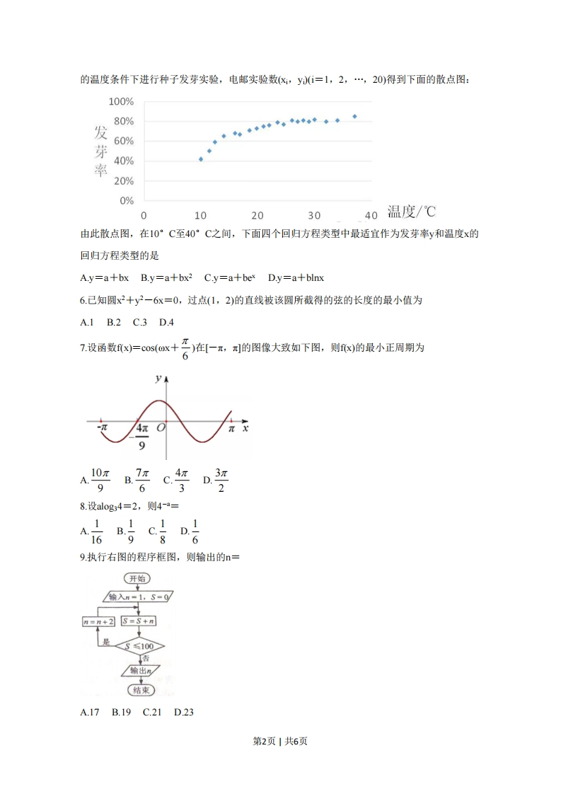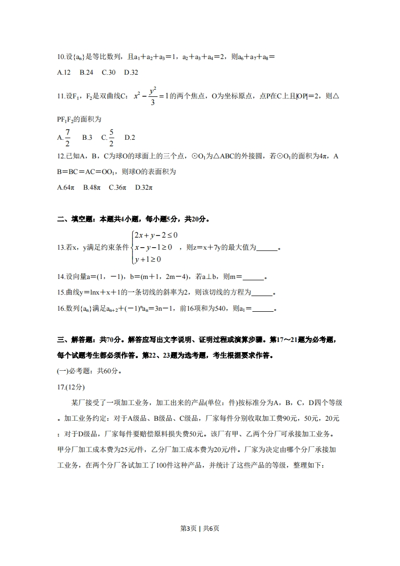 2020年普通高等学校招生全国统一考试文科数学注意事项:1.答卷前,考生务必将自己的姓名、准考证号填写在答题卡上。2.回答选择题时,选出每小题答案后,用铅笔把答题卡,上对应题目的答案标号涂黑。如需改动,用橡皮擦干净后,再选涂其他答案标号。回答非选择题时,将答案写在答题卡上。写在本试卷上无效。3.考试结束后,将本试卷和答题卡一并交回。一、选择题:本题共12小题,每小题5分,共60分。在每小题给出的四个选项中,只有一项是符合题目要求的。1.己知集合A={xx2-3x-4<0},B={-4,1,3,5},则A∩B=A.{-4,1}B.{1,5}C.{3,5}D.{1,3}2.若z=1+2i+i3,则☑=A.0 B.1 C.2 D.23埃及胡夫金字塔是古代世界建筑奇迹之一,它的形状可视为一个正四棱锥。以该四棱锥的高为边长的正方形面积等于该四棱锥一个侧面三角形的面积,则其侧面三角形底边上的高与底面正方形的边长的比值为A5-1B.5-lc5+1D.5+1424.设O为正方形ABCD的中心,在O,A,B,C,D中任取3点,则取到的3点共线的概率为45某校一个课外学习小组为研究某作物种子的发芽率y和温度x(单位:℃)的关系,在20个不同第1页1共6页的温度条件下进行种子发芽实验,电邮实验数k,y(=1,2,…,20)得到下面的散点图:100%80%发60%芽40%率20%0%010203040温度/℃由此散点图,在10°C至40°C之间,下面四个回归方程类型中最适宜作为发芽率y和温度x的回归方程类型的是A.y=a+bx B.y=a+bx2C.y=a+bex D.y=a+blnx6.己知圆x2+y2-6x=0,过点(1,2)的直线被该圆所截得的弦的长度的最小值为A.1B.2C.3D.47.设函数x=cos(ox+严)在[一,的图像大致如下图,则x)的最小正周期为6A.107 B.πD.π96328.设al0g34=2,则4-a=1:B)C8D69.执行右图的程序框图,则输出的n=(开始输入m=1,S=0y厅=m+2S=S+月是<3≤100输出(结束A.17B.19C.21D23第2页1共6页10.设{an}是等比数列,且a1十a2十a3=1,a十a3十a=2,则a6十a7十ag=A.12B.24C.30D.321设F,F,是双曲线C:¥-二=1的两个焦点,0为坐标原点,点P在C上且OP=2,则△3PF,F2的面积为、B3CD.212.已知A,B,C为球O的球面上的三个点,⊙O1为△ABC的外接圆,若⊙O1的面积为4元,AB=BC=AC=OO1,则球O的表面积为A.64πB.48πC.36πD.32π二、填空题:本题共4小题,每小题5分,共20分。2x+y-2≤013.若x,y满足约束条件{x-y-1≥0,则z=x+7y的最大值为y+1≥014.设向量a=(1,一1),b=(m+1,2m-4),若a⊥b,则m=。15.曲线y=lnx十x十1的一条切线的斜率为2,则该切线的方程为一。16.数列{a}满足a+2十(一1)n=3n一1,前16项和为540,则a1=三、解答题:共70分。解答应写出文宇说明、证明过程或演算步骤。第17~21题为必考题,每个试题考生都必须作答。第22、23题为选考题,考生根据要求作答。(一)必考题:共60分。17.(12分)某厂接受了一项加工业务,加工出来的产品(单位:件)按标准分为A,B,C,D四个等级。加工业务约定:对于A级品、B级品、C级品,厂家每件分别收取加工费90元,50元,20元:对于D级品,厂家每件要赔偿原料损失费50元。该厂有甲、乙两个分厂可承接加工业务。甲分厂加工成本费为25元/件,乙分厂加工成本费为20元/件。厂家为决定由哪个分厂承接加工业务,在两个分厂各试加工了100件这种产品,并统计了这些产品的等级,整理如下:第3页1共6页