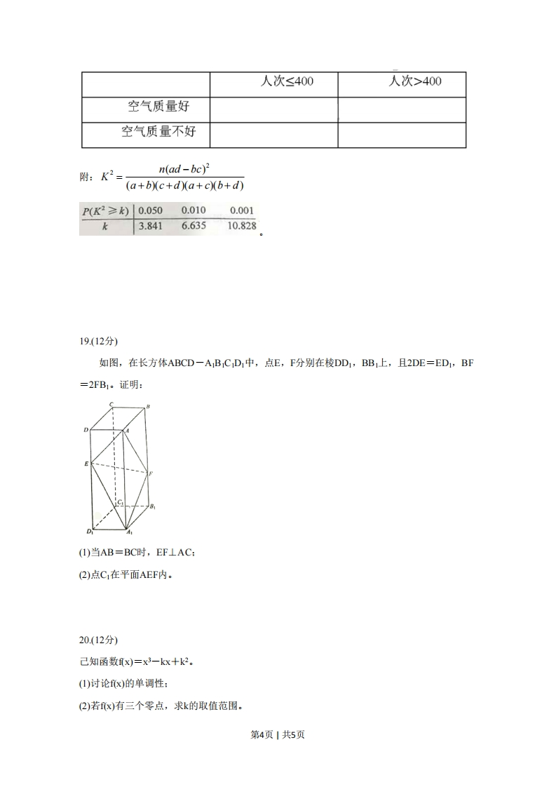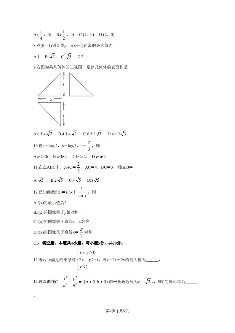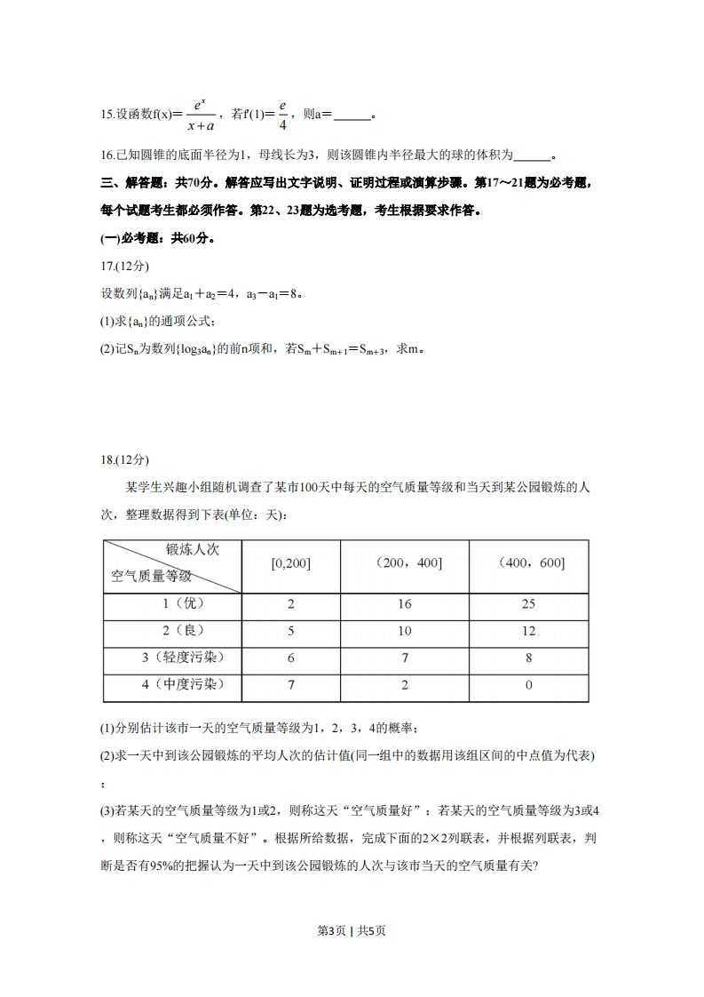 绝密★启用前2020年普通高等学校招生全国统一考试文科数学注意事项:1答卷前,考生务必将自己的姓名、准考证号填写在答题卡上。2回答选择题时,选出每小题答案后,用铅笔把答题卡上对应题目的答案标号涂黑。如需改动,用橡皮擦干净后,再选涂其他答案标号。回答非选择题时,将答案写在答题卡上。写在本试卷上无效。3考试结束后,将本试卷和答题卡一并交回。一、选释题:本题共12小题,每小题5分,共60分。在每小题给出的四个选项中,只有一项是符合题目要求的。1己知集合A={1,2,3,5,7,11},B={x30)交于D,E两点,若OD⊥OE,则C的焦点坐标为第1页1共5页.1A(,OB(G’0)CI,0)D2,O28.点(0,1)到直线y=k(x+1)距离的最大值为A1B.√5C.√5D.29右图为某几何体的三视图,则该几何体的表面积是2A.6+42B.4+4V2C.6+2V5D.4+23210.设a=log2,b=log3,c=号,则A.a0,b>0)的一条渐近线为y=V反x,则C的离心率为】x2y2第2页1共5页15.设函数fx)=e,若f(1)=ex+a则a=一16.己知圆锥的底面半径为1,母线长为3,则该圆锥内半径最大的球的体积为三、解答题:共70分。解答应写出文字说明、正明过程或演算步骤。第17~21题为必考题,每个试题考生都必须作答。第22、23题为选考题,考生根据要求作答。一)必考题:共60分。17.(12分)设数列{an}满足a1十=4,a一a1=8。(1)求{a}的通项公式:(2)记Sn为数列{log3an}的前n项和,若Sm十Sm+1=Sm+3,求m。18.(12分)某学生兴趣小组随机调查了某市100天中每天的空气质量等级和当天到某公园锻炼的人次,整理数据得到下表(单位:天):锻炼人次[0,200](200,400](400,600]空气质量等级1(优)216252(良)510123(轻度污染)6>64(中度污染)720(1)分别估计该市一天的空气质量等级为1,2,3,4的概率:(②)求一天中到该公园锻炼的平均人次的估计值(同一组中的数据用该组区间的中点值为代表)(3)若某天的空气质量等级为1或2,则称这天“空气质量好”:若某天的空气质量等级为3或4,则称这天“空气质量不好”。根据所给数据,完成下面的2×2列联表,并根据列联表,判断是否有95%的把握认为一天中到该公园锻炼的人次与该市当天的空气质量有关?第3页1共5页