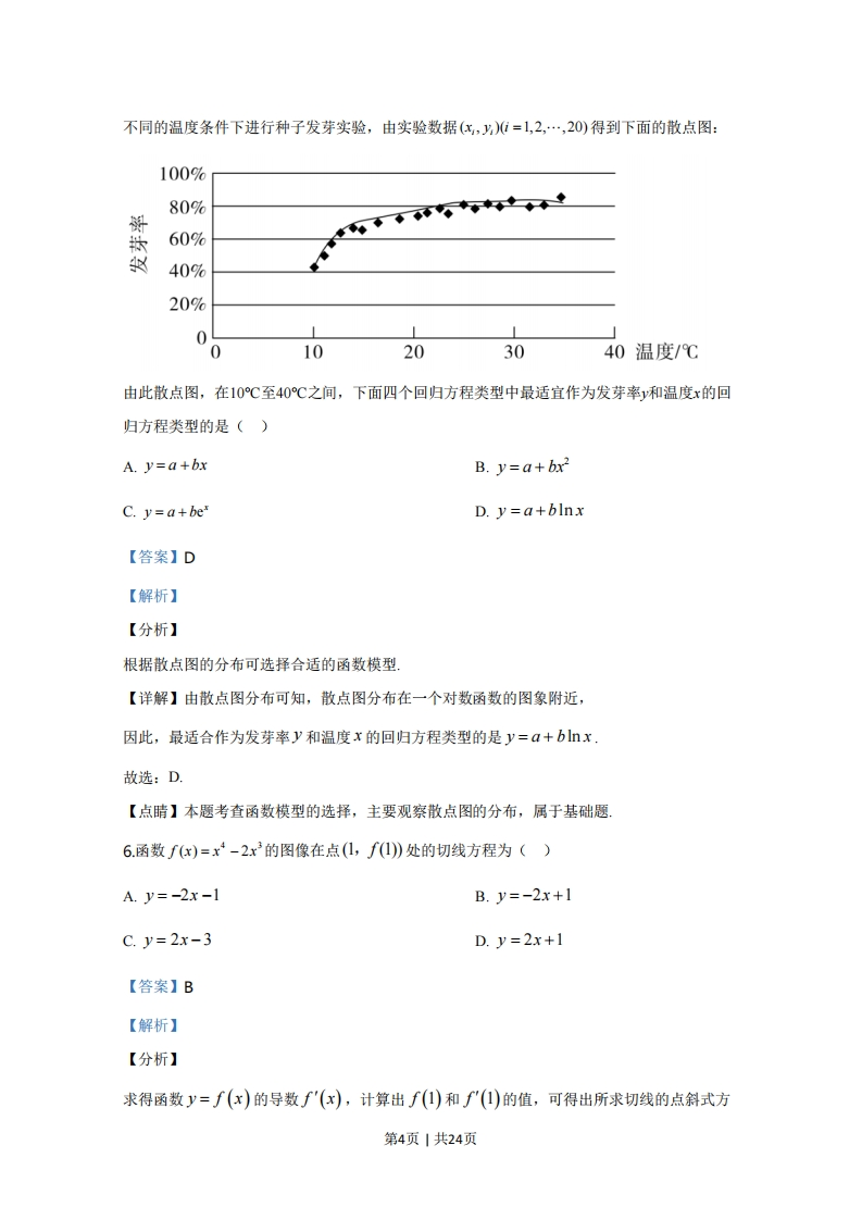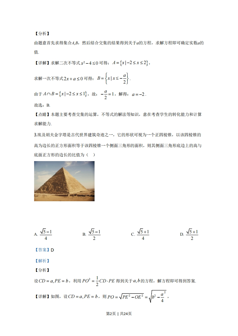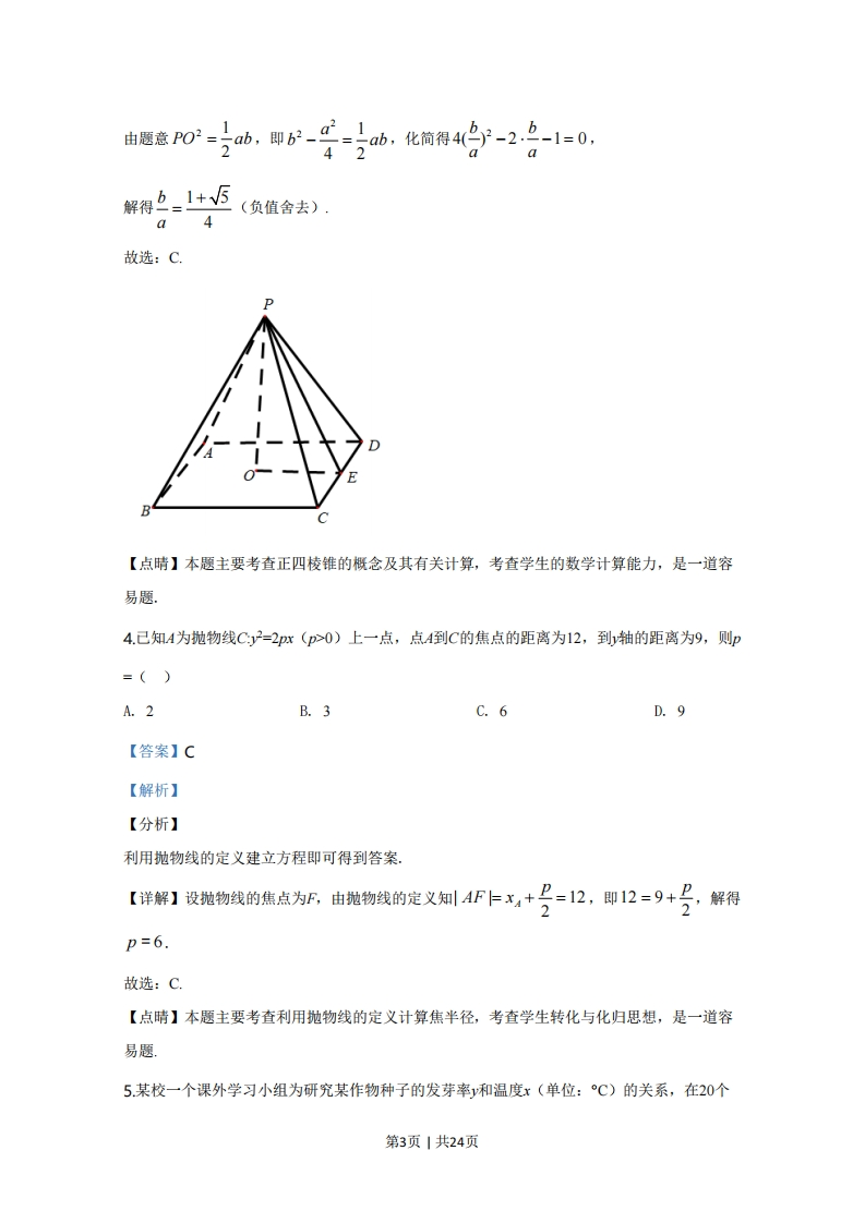 绝密★启用前2020年普通高等学校招生全国统一考试理科数学注意事项:1.答卷前,考生务必将自己的姓名、考生号等填写在答题卡和试卷指定位置上2。回答选择题时,选出每小题答案后,用铅笔把答题卡对应题目的答案标号涂黑如需改动,用橡皮擦干净后,再选涂其他答案标号.回答非选择题时,将答案写在答题卡上。写在本试卷上无效3.考试结束后,将本试卷和答题卡一并交回.一、选择题:本题共12小题,每小题5分,共60分。在每小题给出的四个选项中,只有一项是符合题目要求的,1.若2=1+i,则|z2-2上()A.0B.1c.√2D.2【答案】D【解析】【分析】由题意首先求得2-2:的值,然后计算其模即可【详解】由题意可得:z2=(1+)2=2i,则22-2z=2i-2(1+)=-2故2-2=卜2=2.故选:D【点睛】本题主要考查复数的运算法则和复数的模的求解等知识,属于基础题,2.设集合A={xr2-4s0},B-{x2r+a≤0},且AnB{x2sr≤1},则a=()A.-4B.-2C.2D.4【答案】B【解析】第1页1共24页【分析】由题意首先求得集合A,B,然后结合交集的结果得到关于a的方程,求解方程即可确定实数a的值【详解】求解二次不等式x2-4≤0可得:A={x|-2≤x≤2,求解一次不等式2x+a≤0可得:由于AnB={x-2≤x≤1},故:-日=1,解得:a=-22故选:B【点睛】本题主要考查交集的运算,不等式的解法等知识,意在考查学生的转化能力和计算求解能力.3埃及胡夫金字塔是古代世界建筑奇迹之一,它的形状可视为一个正四棱锥,以该四棱锥的高为边长的正方形面积等于该四棱锥一个侧面三角形的面积,则其侧面三角形底边上的高与底面正方形的边长的比值为()A5-1B.5-1c.5+1D.V5+1424【答案】D【解析】【分析】设CD=a,PE=b,利用P0=CD.PE得到关于a,b的方程,解方程即可得到答案【详解】如图,设CD=a,PE=b,则PO=√PE2-OE2第2页|共24页由题意P02士b,即公-年=)9b,化简得4-2.10aa解得-1+V5(负值舍去)故选:CB【点晴】本题主要考查正四棱锥的概念及其有关计算,考查学生的数学计算能力,是一道容易题4.己知A为抛物线C2=2pr(p>0)上一点,点A到C的焦点的距离为12,到轴的距离为9,则p=()A.2B.3C.6D.9【答案】C【解析】【分析】利用抛物线的定义建立方程即可得到答案【详解】设抛物线的焦点为F,由抛物线的定义知AF卡x+号=12,即12=9+号,解得2p=6.故选:C【点睛】本题主要考查利用抛物线的定义计算焦半径,考查学生转化与化归思想,是一道容易题5某校一个课外学习小组为研究某作物种子的发芽率和温度x(单位:C)的关系,在20个第3页|共24页