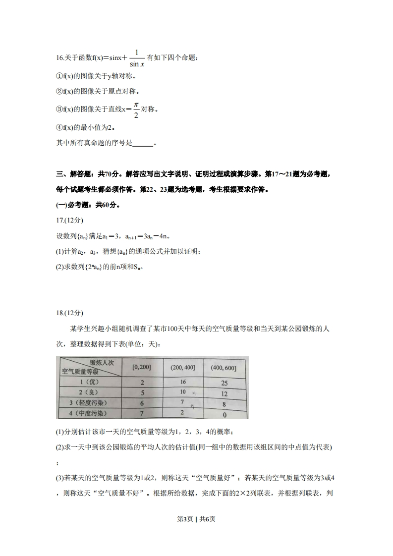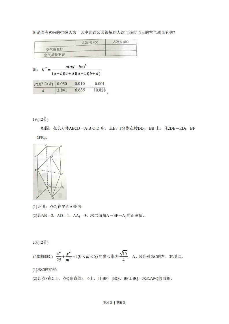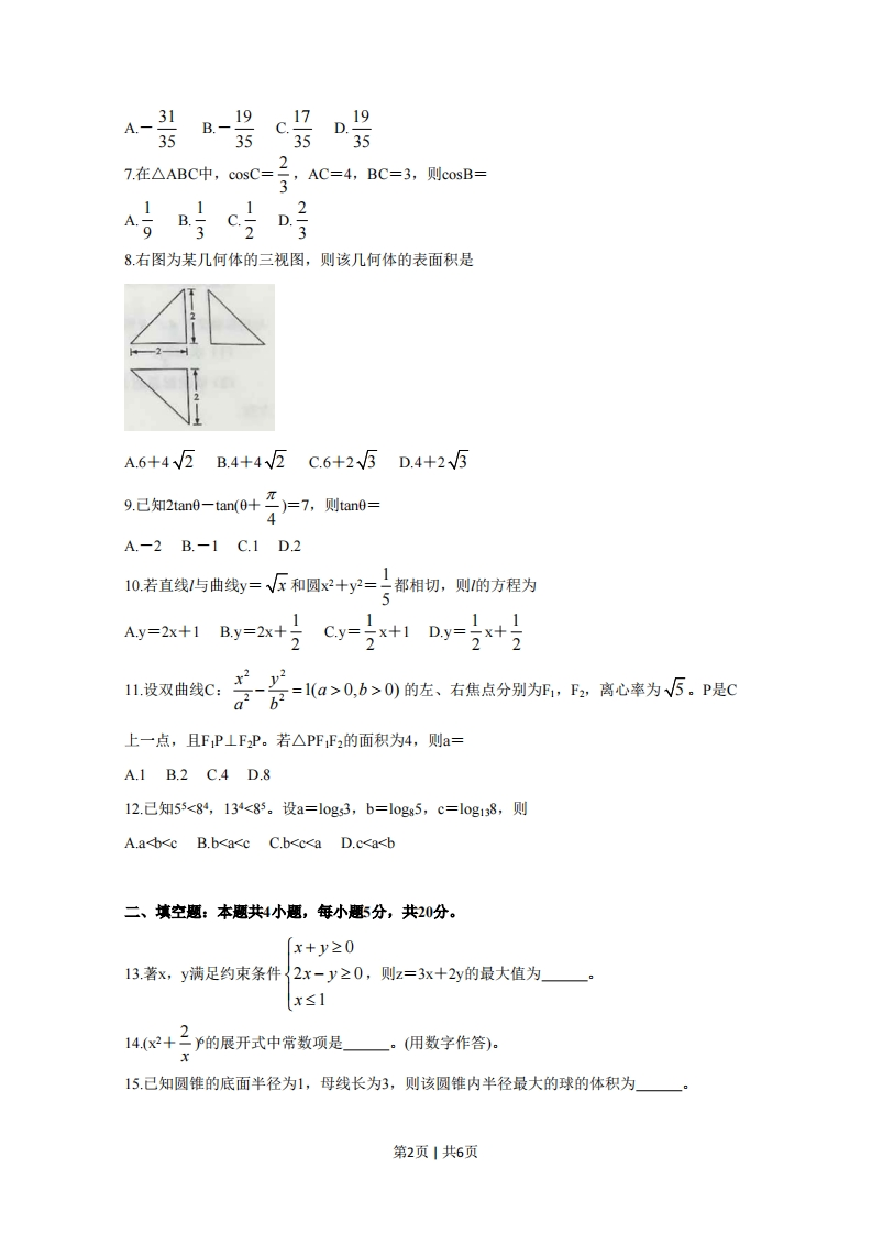 绝密★启用前2020年普通高等学校招生全国统一考试理科数学注意事项:1答卷前,考生务必将自己的姓名、准考证号填写在答题卡上。2回答选择题时,选出每小题答案后,用铅笔把答题卡上对应题目的答案标号涂黑。如需改动,用橡皮擦干净后,再选涂其他答案标号。回答非选择题时,将答案写在答题卡上。写在本试卷上无效。3考试结束后,将本试卷和答题卡一并交回。一、选释题:本题共12小题,每小题5分,共60分。在每小题给出的四个选项中,只有一项是符合题目要求的。1己知集合A={K,y)k,y∈N,y≥x,B={(x,yx十y=8},则A∩B中元素的个数为A2B.3C.4D.62复数一的虚部是1-A-3B.-I C.I1010103.在一组样本数据中,1,2,3,4出现的频率分别为p,p2,ps,P4,且∑P,=1,则下面四种情形中,对应样本的标准差最大的一组是Ap1=p4=0.1,p2=p3=0.4B.p1=p4=0.4,p2=p3=0.1C.p1=p4=02,p2=p3=0.3Dp1=p4=0.3,p2=p3=0.24.L0 gistic模型是常用数学模型之一,可应用于流行病学领域,有学者根据公布数据建立了某K地区新冠肺炎累计确诊病例数01的单:位天)的模型:I0)-1十e可,其中K为最大确诊病例数。当I(t)=0.95K时,标志着己初步遏制疫情,则t约为(19≈3)A.60B.63C.66D.695.设0为坐标原点,直线x=2与抛物线C:y2=2px(p>0)交于D,E两点,若OD⊥OE,则C的焦点坐标为g)B(0c,0D2,06.己知向量a,b满足la=5,bl=6,a·b=一6,则cosa,a十b>=第1页1共6页A、31B-19。17.19C.D.-3553535,AC=4,BC=3,则cosB=27.在△ABC中,cosC=1.1.1.2A.B.593D.8右图为某几何体的三视图,则该几何体的表面积是A.6+4V2B.4+4√2C.6+2V3D.4+239.已知2tan0-tan(0+T)=7,则tan0=4A.-2B.-1C.1D.210.若直线与曲线y=√和圆x2+y2=二都相切,则的方程为1,1A.y=2x+1By=2xt7 Cy-7x1 Dy-7x+71设双尚线c:吾下号-二=1a>0,b>0)的左、右焦点分别为F,,离心率为5.P是C上一点,且FP⊥FP。若△PFF2的面积为4,则a=A1B.2C.4D.812.己知55<84,134<85。设a=logs3,b=logs5,c=log18,则A.a