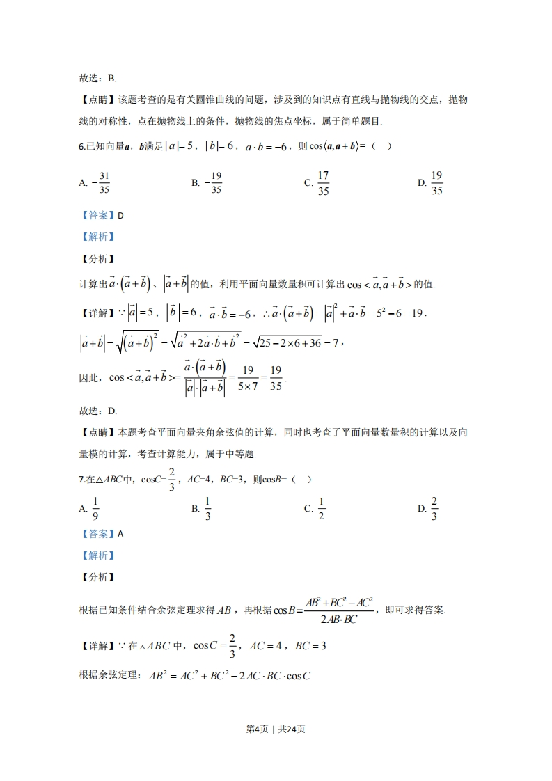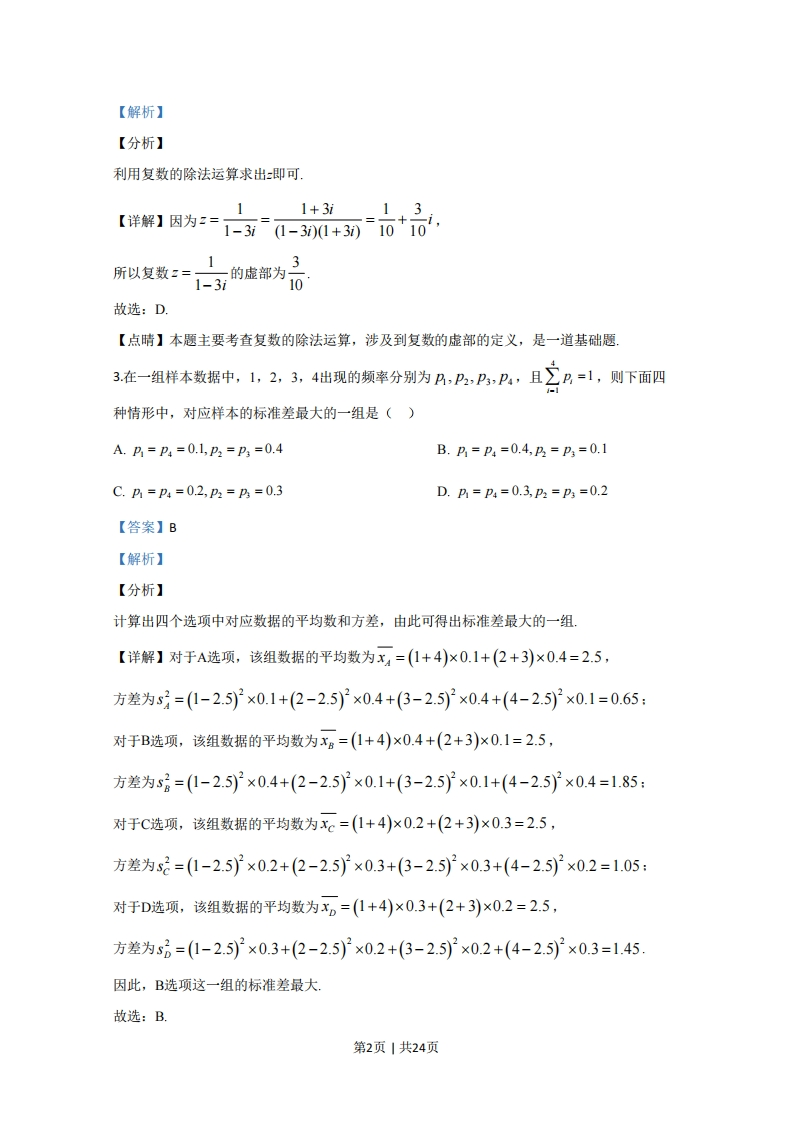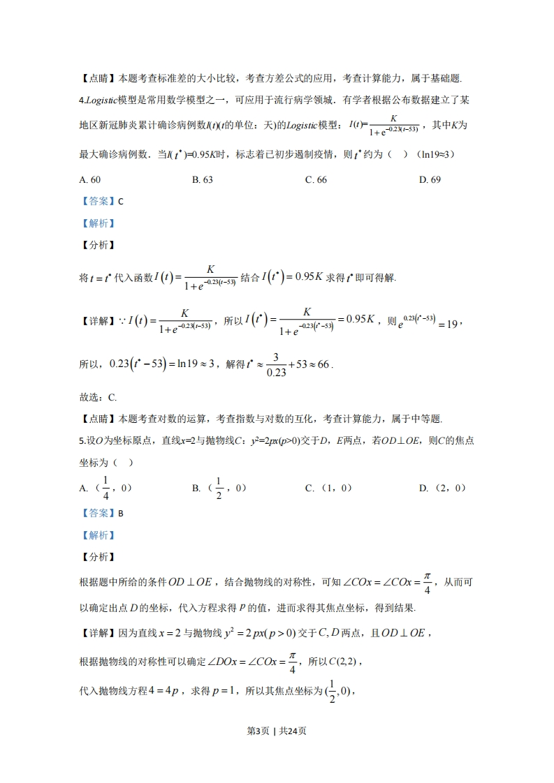 2020年普通高等学校招生全国统一考试理科数学注意事项:1.答卷前,考生务必将自己的姓名、准考证号填写在答题卡上,2.回答选择题时,选出每小题答案后,用铅笔把答题卡上对应题目的答案标号涂黑如需改动,用橡皮擦干净后,再选涂其他答案标号.回答非选择题时,将答案写在答题卡上写在本试卷上无效,3。考试结束后,将本试卷和答题卡一并交回,一、选择题:本题共12小题,每小题5分,共60分.在每小题给出的四个选项中,只有一项是符合题目要求的.1.已知集合A={x,y)川x,y∈N,y≥x,B={(x,y)川x+y=8},则A∩B中元素的个数为(A.2B.3C.4D.6【答案】C【解析】【分析】采用列举法列举出A∩B中元素的即可.yzx【详解】由题意,A∩B中的元素满足x+y=8'且xy∈W,由x+y=8≥2x,得x≤4,所以满足x+y=8的有(1,7),(2,6),(3,5),(4,4),故A∩B中元素的个数为4.故选:C【点晴】本题主要考查集合的交集运算,考查学生对交集定义的理解,是一道容易题,2复数3的虚部是()311A.-B.-D.3C.10101010【答案】D第1页1共24页【解析】【分析】利用复数的除法运算求出:即可,11+3i13【详解】因为z=Γ1-31-3i)1+3)1010所以复数z=1-3i的虚部为0故选:D.【点睛】本题主要考查复数的除法运算,涉及到复数的虚部的定义,是一道基础题3在一组样本数据中,1,2,3,4出现的频率分别为A,P2,P,P4,且立B=1,则下面四种情形中,对应样本的标准差最大的一组是()A.p=P4=0.1,P2=P3=0.4B.B=P4=0.4,A2=P3=0.1C.乃=P4=02,P2=乃=0.3D.乃=P4=0.3,P2=P3=0.2【答案】B【解析】【分析】计算出四个选项中对应数据的平均数和方差,由此可得出标准差最大的一组【详解】对于A选项,该组数据的平均数为x4=(1+4)×0.1+(2+3)×0.4=2.5,方差为s=(1-2.5)2×0.1+(2-2.5)2×0.4+(3-2.5)2×0.4+(4-2.5)2×0.1=0.65:对于B选项,该组数据的平均数为xg=(1+4)×0.4+(2+3)×0.1=2.5,方差为s后=(1-2.5)2×0.4+(2-2.5)2×0.1+(3-2.5)2×0.1+(4-2.5)}2×0.4=1.85:对于C选项,该组数据的平均数为xc=(1+4)×0.2+(2+3)×0.3=2.5,方差为s2=(1-2.5×0.2+(2-2.5)2×0.3+(3-2.5)2×0.3+(4-2.5)×0.2=1.05:对于D选项,该组数据的平均数为x。=(1+4)×0.3+(2+3)×0.2=2.5,方差为s=(1-2.5)2×0.3+(2-2.5)2×0.2+(3-2.5)2×0.2+(4-2.5)×0.3=1.45因此,B选项这一组的标准差最大故选:B.第2页1共24页【点睛】本题考查标准差的大小比较,考查方差公式的应用,考查计算能力,属于基础题,4.Logistic模型是常用数学模型之一,可应用于流行病学领城.有学者根据公布数据建立了某地区新冠肺炎累计确诊病例数0X的单位:天)的L0ge模型:0广1+e,其中K为最大确诊病例数.当(t')=0.95k时,标志着已初步遏制疫情,则t'约为()(1n193)A.60B.63C.66D.69【答案】C【解析】【分析】将1=f代入函数I()=,二1+e-可结合)=0.5K求得r即可得解K【弹解】0=1+e人所以)=K1+e020r-5列=0.95K,则ea3啡-5)=19,*023+536所以,0.23-53)=ln19≈3,解得r≈3故选:C【点睛】本题考查对数的运算,考查指数与对数的互化,考查计算能力,属于中等题5.设O为坐标原点,直线x=2与抛物线C:2=2m(p>0)交于D,E两点,若OD⊥OE,则C的焦点坐标为()A(年0)B.0)C.(1,0)D.(2,0)【答案】B【解析】【分析】根据题中所给的条件OD⊥OE,结合抛物线的对称性,可知∠COx=∠COx=,从而可以确定出点D的坐标,代入方程求得P的值,进而求得其焦点坐标,得到结果,【详解】因为直线x=2与抛物线y=2px(p>0)交于C,D两点,且OD⊥OE,根据抛物线的对称性可以确定∠DOx=∠COx=T,所以C(2,2),4代入抛物线方程4=4P,求得p=1,所以其焦点坐标为(行,0),第3页1共24页