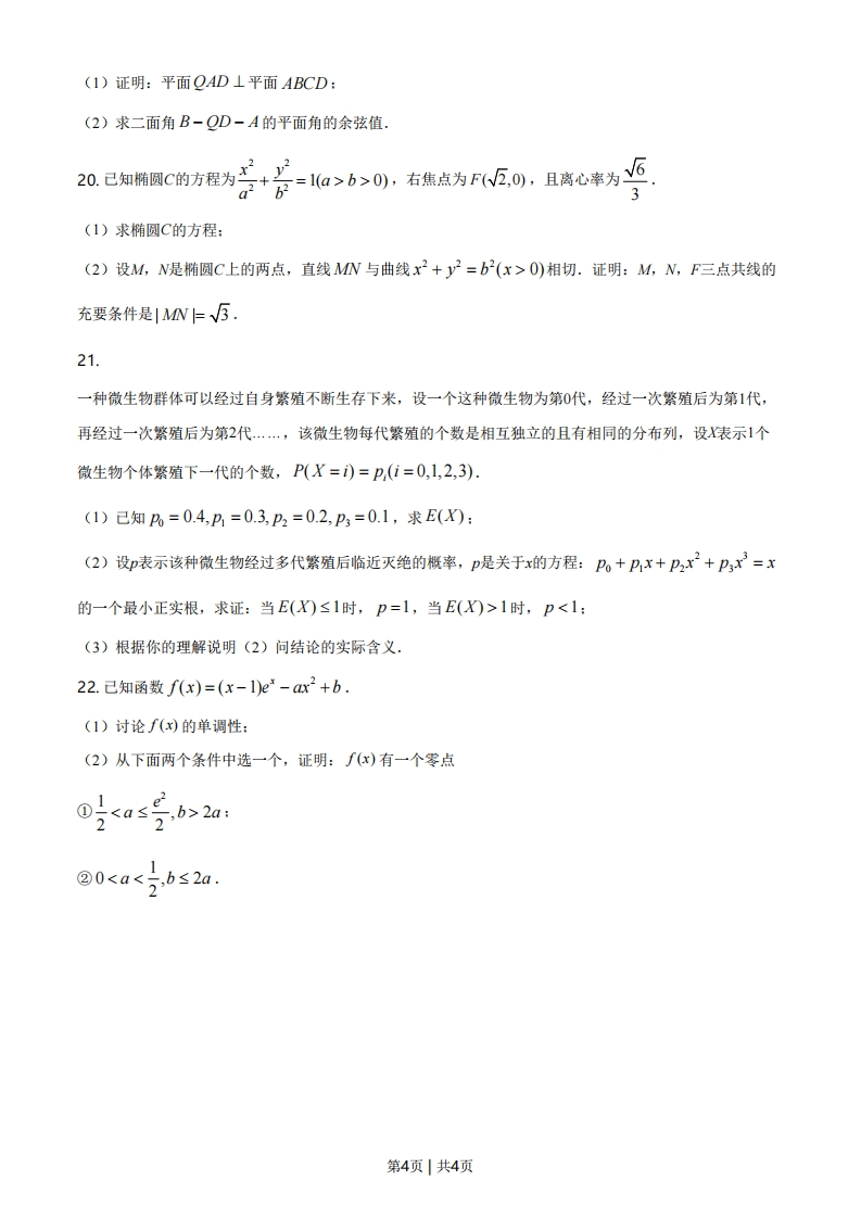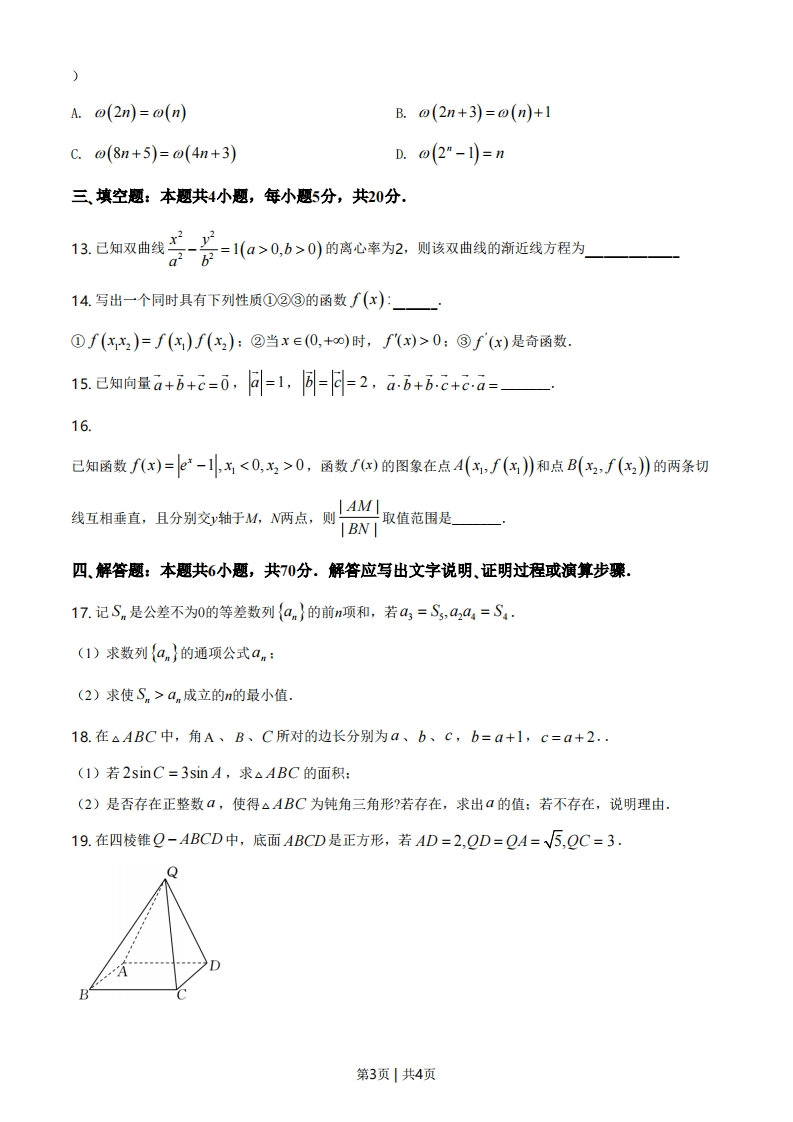 2021年全国统一高考数学试卷(新高考全国Ⅱ卷)使用省份:海南、辽宁、重庆一、选择题:本题共12小题,每小题5分,共60分.在每小题给出的四个选项中,只有一项是符合题目要求的1.复数2-1在复平面内对应的点所在的象限为《)1-3iA.第一象限B.第二象限C.第三象限D.第四象限2.设集合U={L,2,3,4,5,6,A={L,3,6,B={2,3,4},则A∩(àB)=()A{3}B.{1,6C.{5,6D.{1,3}3.抛物线y2=2px(p>0)的焦点到直线y=x+1的距离为√2,则P=()A.1B.2C.2N2D.44.北斗三号全球卫星导航系统是我国航天事业的重要成果.在卫星导航系统中,地球静止同步卫星的轨道位于地球赤道所在平面,轨道高度为36000km(轨道高度是指卫星到地球表面的距离),将地球看作是一个球心为O,半径r为6400k的球,其上点A的纬度是指OA与赤道平面所成角的度数.地球表面上能直接观测到一颗地球静止同步轨道卫星点的纬度最大值为α,记卫星信号覆盖地球表面的表面积为=2πr2(1-cos)(单位:k㎡),则S占地球表面积的百分比约为()A26%B.34%C.42%D.50%5.正四棱台的上、下底面的边长分别为2,4,侧棱长为2,则其体积为()A.20+12W556B.28V2C.D.28V536.某物理量的测量结果服从正态分布N(10,σ2),下列结论中不正确的是()A.0越小,该物理量在一次测量中在(9.9,10.1)的概率越大B.0越小,该物理量在一次测量中大于10的概率为0.5C.0越小,该物理量在一次测量中小于9.99与大于10.01的概率相等D.0越小,该物理量在一次测量中落在(9.9,10.2)与落在(10,10.3)的概率相等第1页|共4页17.己知a=log52,b=log3,c=,则下列判断正确的是()A.c0,b>0)的离心率为2,则该双曲线的渐近线方程为14.写出一个同时具有下列性质①②③的函数f(x):一一一①f(xx2)=f(x)f(x):②当x∈(0,+∞)时,f(x)>0:③f'(x)是奇函数.15.已知向量a+i+c=0,同=l,同l==2,a.i+i.c+ca=一16.已知函数f(x)=e-1,出<0,x2>0,函数fx)的图象在点A(x,f(x)》和点B(x2,f(32)》的两条切AM线互相垂直,且分别交轴于M,N两点,则取值范围是」四、解答题:本题共6小题,共70分。解答应写出文字说明、证明过程或演算步骤.17.记Sn是公差不为0的等差数列{an}的前n项和,若a3=S,a2a=S4.(1)求数列{an}的通项公式an:(2)求使Sn>an成立的n的最小值.18.在△ABC中,角A、B、C所对的边长分别为a、b、c,b=a+1,c=a+2.(1)若2sinC=3sinA,求△ABC的面积:(2)是否存在正整数a,使得△ABC为钝角三角形?若存在,求出a的值:若不存在,说明理由.19.在四棱锥Q-ABCD中,底面ABCD是正方形,若AD=2,QD=QA=V5,QC=3.第3页|共4页