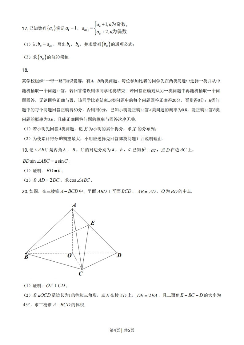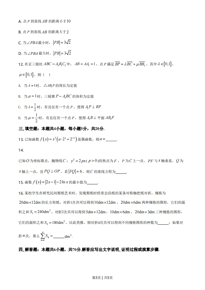 2021年普通高等学校招生全国统一考试数学本试卷共4页,22小题,满分150分.考试用时120分钟注意事项:1.答卷前,考生务必将自己的姓名、考生号、考场号和座位号填写在答题卡上用2B铅笔将试卷类型(4)填涂在答题卡相应位置上将条形码横贴在答题卡右上角“条形码粘贴处”,2.作答选择题时,选出每小题答案后,用2B铅笔在答题卡上对应题目选项的答案信息点涂黑:如需改动,用橡皮擦干净后,再选涂其他答案答案不能答在试卷上3.非选择题必须用黑色字迹的钢笔或签字笔作答,答案必须写在答题卡各题目指定区域内相应位置上;如需改动,先划掉原来的答案,然后再写上新答案;不准使用铅笔和涂改液不按以上要求作答无效.4考生必须保持答题卡的整洁考试结束后,将试卷和答题卡一并交回,一、选择题:本题共8小题,每小题5分,共40分在每小题给出的四个选项中,只有一项是符合题目要求的,1.设集合A={x-20)的焦点为F,P为C上一点,PF与x轴垂直,Q为x轴上一点,且PQ⊥OP,若FO=6,则C的准线方程为一15.函数f(x)=2x-1-2lnx的最小值为16.某校学生在研究民间剪纸艺术时,发现剪纸时经常会沿纸的某条对称轴把纸对折,规格为20dm×12dm的长方形纸,对折1次共可以得到10dm×12dm,20dm×6dm两种规格的图形,它们的面积之和S,=240dm2,对折2次共可以得到5dm×12dm,10dm×6dm,20dm×3dm三种规格的图形,它们的面积之和S,=180d2,以此类推,则对折4次共可以得到不同规格图形的种数为:如果对折”次郑么=—d2四、解答题:本题共6小题,共70分解答应写出文字说明、证明过程或演算步骤第3页|共5页