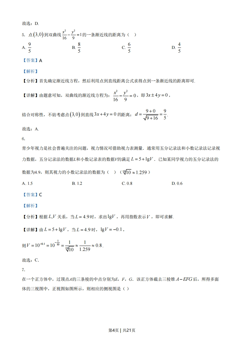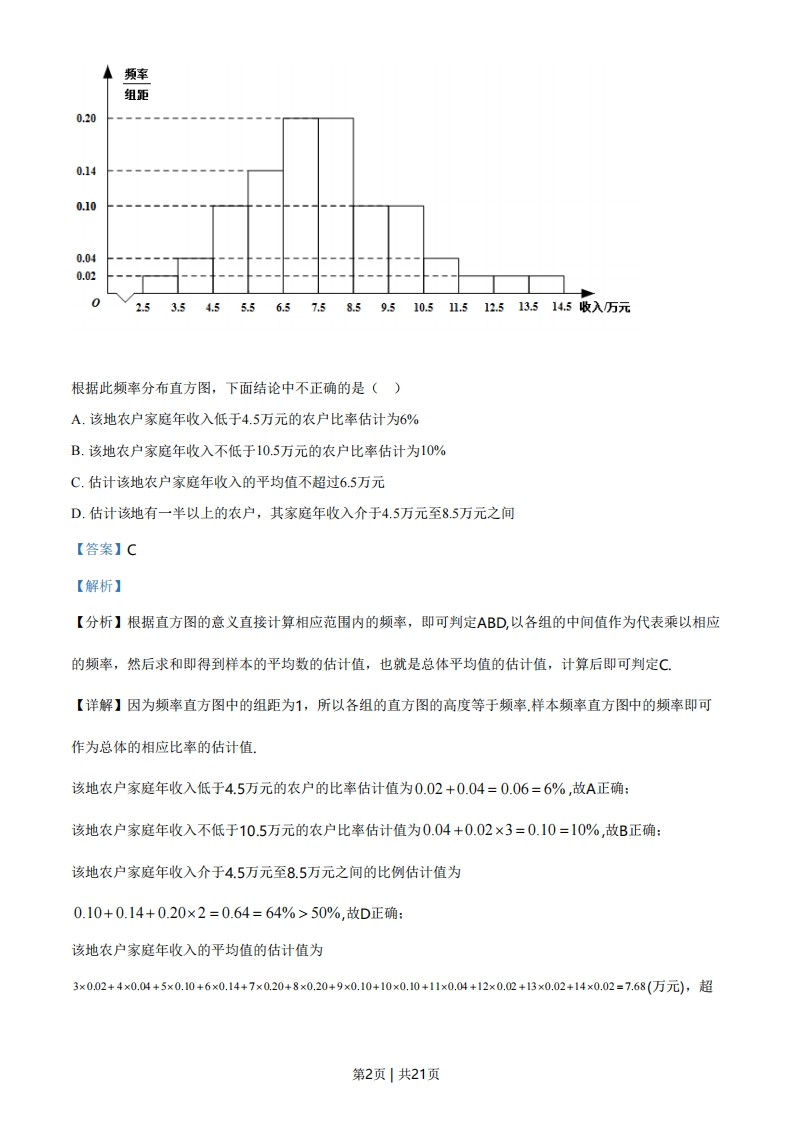 绝密★启用前2021年普通高等学校招生全国统一考试(甲卷)文科数学注意事项:1答卷前,考生务必将自己的姓名、准考证号填写在答题卡上2.回答选择题时,选出每小题答案后,用铅笔把题卡上对应题目的答案标号涂黑如需改动,用皮擦干净后,再选涂其他答案标号,回答非选择题时,将答案写在答题卡上,写在本试卷上无效.3.考试结束后,将本试卷和答题卡一并交回一、选择题:本题共12小题,每小题5分,共60分在每小题给出的四个选项中,只有一项是符合题目要求的,1.设集合M={L3,5,7,9},N={x2x>7},则M∩N=()A.{7,9}B.{5,7,9}C.{3,5,7,9}D.{1,3,5,7,9}【答案】B【解析】【分析】求出集合N后可求MON【详解】N=2+故MnN={5,7,9},故选:B.2.为了解某地农村经济情况,对该地农户家庭年收入进行抽样调查,将农户家庭年收入的调查数据整理得到如下频率分布直方图:第1页|共21页频率组距0.200.140.100.040.0202.53.5455.56.57.58.59.510.511.512.513.5145收入万元根据此频率分布直方图,下面结论中不正确的是()A.该地农户家庭年收入低于4.5万元的农户比率估计为6%B.该地农户家庭年收入不低于10.5万元的农户比率估计为10%C.估计该地农户家庭年收入的平均值不超过6.5万元D.估计该地有一半以上的农户,其家庭年收入介于4.5万元至8.5万元之间【答案】C【解析】【分析】根据直方图的意义直接计算相应范围内的频率,即可判定ABD,以各组的中间值作为代表乘以相应的频率,然后求和即得到样本的平均数的估计值,也就是总体平均值的估计值,计算后即可判定C【详解】因为频率直方图中的组距为1,所以各组的直方图的高度等于频率样本频率直方图中的频率即可作为总体的相应比率的估计值该地农户家庭年收入低于4.5万元的农户的比率估计值为0.02+0.04=0.06=6%,故A正确:该地农户家庭年收入不低于10.5万元的农户比率估计值为0.04+0.02×3=0.10=10%,故B正确:该地农户家庭年收入介于4.5万元至8.5万元之间的比例估计值为0.10+0.14+0.20×2=0.64=64%>50%,故D正确:该地农户家庭年收入的平均值的估计值为3×0.02+4×0.04+5×0.10+6×0.14+7×0.20+8×0.20+9×0.10+10×0.10+11×0.04+12×0.02+13×0.02+14×0.02=7.68(万元),超第2页|共21页过6.5万元,故C错误。综上,给出结论中不正确的是C.故选:C【点睛】本题考查利用样本频率直方图估计总体频率和平均值,属基础题,样本的频率可作为总体的频率的估计值,样本的平均值的估计值是各组的中间值乘以其相应频率然后求和所得值,可以作为总体的平均值的估计值注意各组的频率等于频率组距」组距3.己知(1-i)2z=3+2i,,则z=()A-1-3刘33B.-1+5i【答案】B【解析】3+2i【分析】由己知得z=,根据复数除法运算法则,即可求解-2i【详解】(1-i)2z=-2iz=3+2i,3+2i_3+21--2+31=-1+313Z=-2i-2i.i22故选:B.4.下列函数中是增函数的为()A.f(x)=-xB.f(x)=C.f(x)=x2D.f()=派【答案】D【解析】【分析】根据基本初等函数的性质逐项判断后可得正确的选项.【详解】对于A,f(x)=-x为R上的减函数,不合题意,舍对于B,f()为R上的减函数,不合题意,舍。3对于C,∫(x)=x在(-o,0)为减函数,不合题意,舍.对于D,∫(x)=:为R上的增函数,符合题意,第3页|共21页