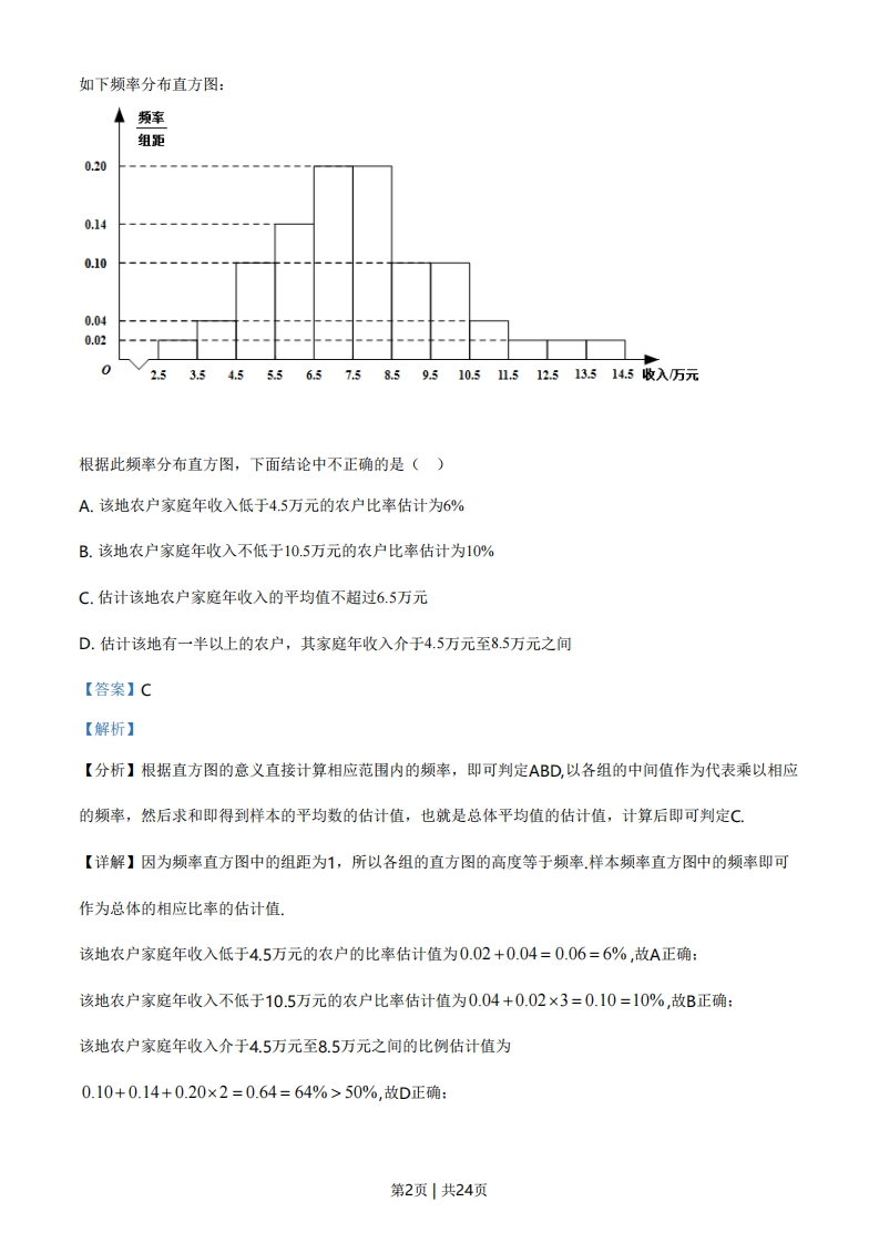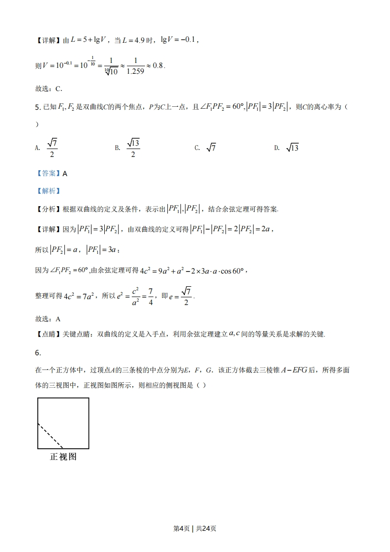 绝密★启用前2021年普通高等学校招生全国统一考试(甲卷)理科数学注意事项:1.答卷前,考生务必将自己的姓名、准考证号填写在答题卡上.2,回答选择题时,选出每小题答案后,用铅笔把答题卡上对应题目的答案标号涂黑。如需改动,用橡皮擦干净后,再选涂其他答案标号.回答非选择题时将答案写在答题卡上.写在本试卷上无效.3.考试结束后,将本试卷和答题卡一并交回.一、选择题:本题共12小题,每小题5分,共60分.在每小题给出的四个选项中,只有一项是符合题目要求的1.设集合M={p50%.故D正确:第2页|共24页该地农户家庭年收入的平均值的估计值为3×0.02+4×0.04+5×0.10+6×0.14+7×0.20+8×0.20+9×0.10+10×0.10+11×0.04+12×0.02+13×0.02+14×0.02=7.68(万元),超过6.5万元,故C错误.综上,给出结论中不正确的是C.故选:C【点睛】本题考查利用样本频率直方图估计总体频率和平均值,属基础题,样本的频率可作为总体的频率的估计值,样本的平均值的估计值是各组的中间值乘以其相应频率然后求和所得值,可以作为总体的平均频率值的估计值注意各组的频率等于×组距组距3.已知(1-)2z=3+2i,则z=()A-1-333B.-1+i2C、3D.2【答案】B【解析】【分析】由已知得:=3+21根据复数除法运算法则,即可求解。-2i【详解】(1-i)2z=-2iz=3+2i,=3+2i_3+2)1=-2+31=-1+3.Z=-2i-2ii22故选:B.4.青少年视力是社会普遍关注的问题,视力情况可借助视力表测量.通常用五分记录法和小数记录法记录视力数据,五分记录法的数据L和小数记录表的数据的满足L=5+1gV.己知某同学视力的五分记录法的数据为4.9,则其视力的小数记录法的数据为()(910≈1.259)A.1.5B.1.2C.0.8D.0.6【答案】C【解析】【分析】根据L,V关系,当L=4.9时,求出1gV,再用指数表示V,即可求解第3页|共24页