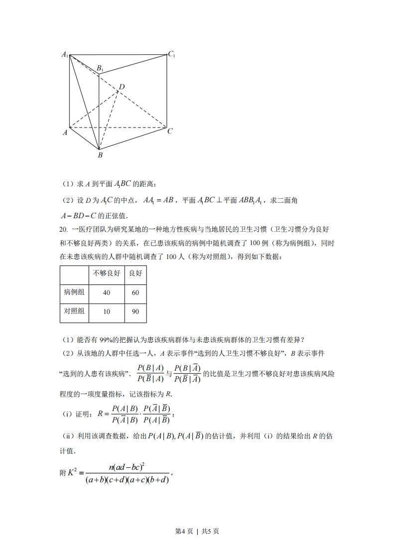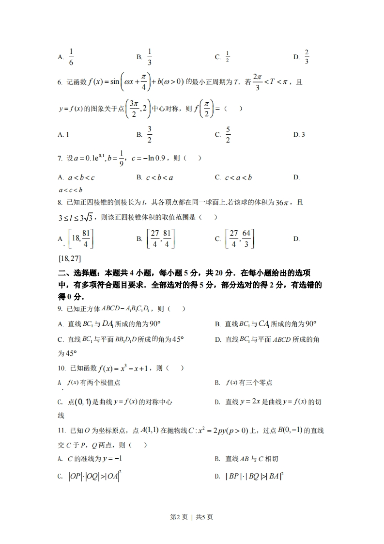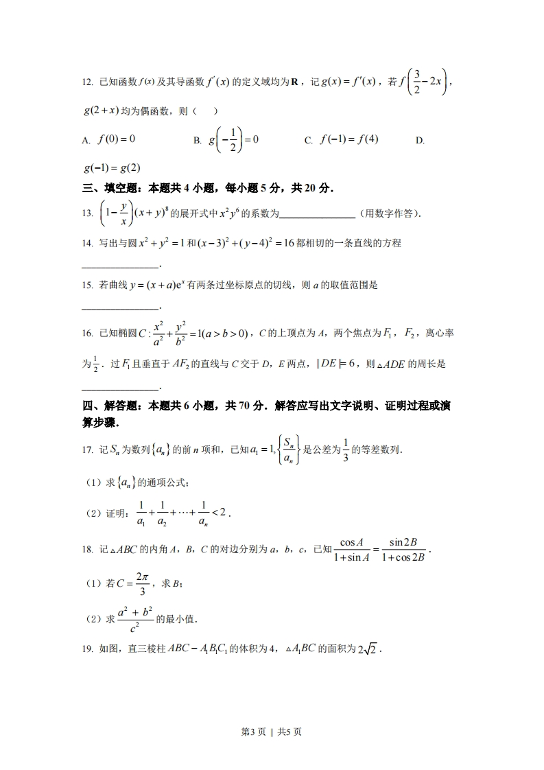 绝密☆启用前试卷类型:A2022年普通高等学校招生全国统一考试数学本试卷共4页,22小题,满分150分.考试用时120分钟注意事项:1,答卷前,考生务必用黑色字迹钢笔或签字笔将自己的姓名、考生号、考场号和座位号填写在答题卡上用2B铅笔将试卷类型(A)填涂在答题卡相应位置上将条形码横贴在答题卡右上角“条形码粘贴处”,2,作答选释题时,选出每小题答案后,用2B铅笔把答题卡上对应题目选项的答案信息点涂黑;如需改动,用橡皮擦干净后,再选涂其他答案,答案不能答在试卷上3。非选择题必须用黑色字迹钢笔或签字笔作答,答案必须写在答题卡各题目指定区域内相应位置上;如需改动,先划掉原来的答案,然后再写上新的答案;不准使用铅笔和涂改液不按以上要求作答的答案无效.4.考生必须保持答题卡的整洁考试结束后,将试卷和答题卡一并交回一、选择题:本题共8小题,每小题5分,共40分.在每小题给出的四个选项中,只有一项是符合题目要求的,1.若集合M={x|√x<4;,N={x3x≥1},则M∩N=()A.{x0≤x<2}6sx<2C.{x3≤x<16}{5s<162.若i(1-z)=1,则z+z=()A.-2B.-1C.1D.23.在△ABC中,点D在边AB上,BD=2DA.记CA=m,CD=7,则CB=()A.3m-2nB.-2m+37C.3m+2nD】2m+374.南水北调工程缓解了北方一些地区水资源短缺问题,其中一部分水蓄入某水库.己知该水库水位为海拔148.5m时,相应水面的面积为140.0km2:水位为海拔157.5m时,相应水面的面积为180.0k2,将该水库在这两个水位间的形状看作一个棱台,则该水库水位从海拔148.5m上升到157.5m时,增加的水量约为(√7≈2.65)()A.1.0×109m3B.1.2×109m3C.1.4×10°m3D1.6×10°m5.从2至8的7个整数中随机取2个不同的数,则这2个数互质的概率为()第1页|共5页AB.63cD6.记函数f(x)=sin ox++b(O>0)的最小正周期为T.若2”0)上,过点B(0,-1)的直线交C于P,Q两点,则()A.C的准线为y=-1B.直线AB与C相切c.oP Joo>1o4D.BP BO>BAP第2页|共5页2已期局数及其导强金了倒的定文说均为R,记8)=,若/侣-2g(2+x)均为偶函数,则()A.f(0)=0c.f(-1)=f(4)D】g(-1)=g(2)三、填空题:本题共4小题,每小题5分,共20分.13(-}水x+少的展开式中xy少的系数为(用数字作答).14.写出与圆x2+y2=1和(x-3)2+(y-4)2=16都相切的一条直线的方程15.若曲线y=(x+a)e有两条过坐标原点的切线,则a的取值范围是16、已知椭圆C:女+少云+方=1(a>b>0),C的上顶点为A,两个焦点为,5,离心率为;,过F且垂直于AE的直线与C交于D,E两点,IDE卡6,则△ADE的周长是四、解答题:本题共6小题,共70分.解答应写出文字说明、证明过程或演算步骤17.记Sn为数列{a}的前n项和,已知a=是公差为二的等差数列.(1)求{an}的通项公式:1(2)证明:L+L++L<241a2a18.记△ABC的内角A,B,C的对边分别为a,b,c,己知CosA sin2B1+sinA 1+cos2B(1)若C=3,求B:2(2)求Q+6C2的最小值19.如图,直三棱柱ABC-AB,C1的体积为4,△A,BC的面积为2√2.第3页|共5页