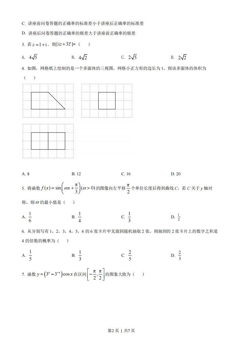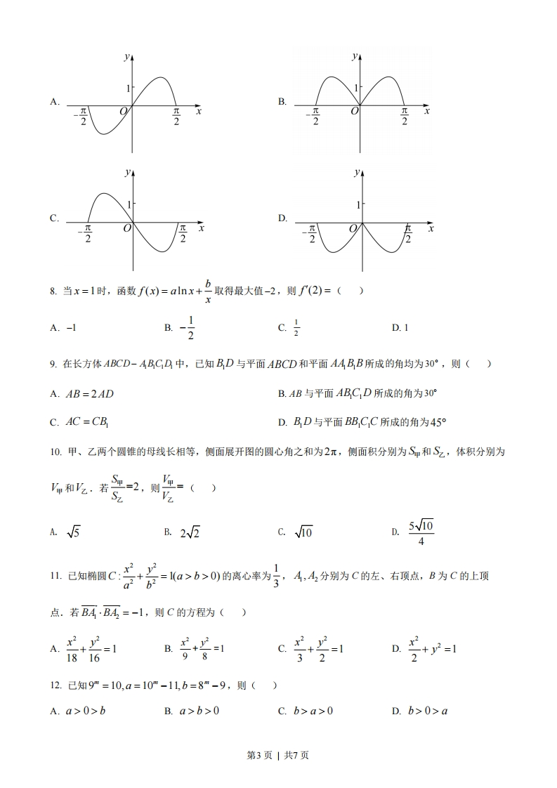 绝密★启用前2022年普通高等学校招生全国统一考试文科数学注意事项:1.答卷前,考生务必用黑色碳素笔将自己的姓名、准考证号、考场号、座位号填写在答题卡上,并认真核准条形码上的准考证号、姓名、考场号、座位号及科目,在规定的位置贴好条形码.2,回答选择题时,选出每小题答案后,用铅笔把答题卡上对应题目的答案标号涂黑,如需改动,用橡皮擦干净后,再选涂其他答案标号.回答非选择题时,将答案写在答题卡上、写在本试卷上无效3,考试结束后,将本试卷和答题卡一并交回一、选择题:本题共12小题,每小题5分,共60分.在每小题给出的四个选项中,只有一项是符合题目要求的,1.设集合A={-2,-1,0,1,2,B0)的图像向左平移个单位长度后得到曲线C,若C关于)轴对0x+称,则⊙的最小值是()1A.-B6D.月6.从分别写有1,2,3,4,5,6的6张卡片中无放回随机抽取2张,则抽到的2张卡片上的数字之积是4的倍数的概率为()1A.5C.2D.31函数)=(6-)c0s在区间-受的图象大致为()第2页|共7页8.当x=1时,函数f=al1nx+取得最大值-2,则f2)=()X1A.-1B.-2cD.19.在长方体ABCD-ABCD中,己知BD与平面ABCD和平面AAB,B所成的角均为30°,则()A.AB=2ADB.AB与平面ABCD所成的角为30°C.AC=CBD.BD与平面BB,CC所成的角为4510.甲、乙两个圆锥的母线长相等,侧面展开图的圆心角之和为2π,侧面积分别为S理和S2,体积分别为单和Vz·S理=2,则甲=()St.A.5B.2W5c而D.5v104口已知猫圆C。+片Q>b>0)的离心率为4,4分别为C的左、右项点,B为C的上圆点.若BA·BA=-1,则C的方程为()A+=1181632D2+2s112.己知9"=10,a=10"-11,b=8m-9,则()A.a>0>bB.a>b>0C.b>ax0D.b>0>a第3页|共7页