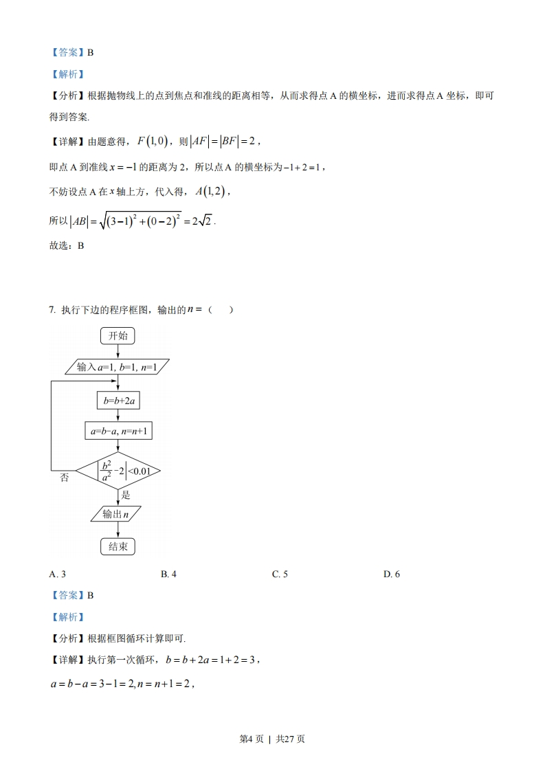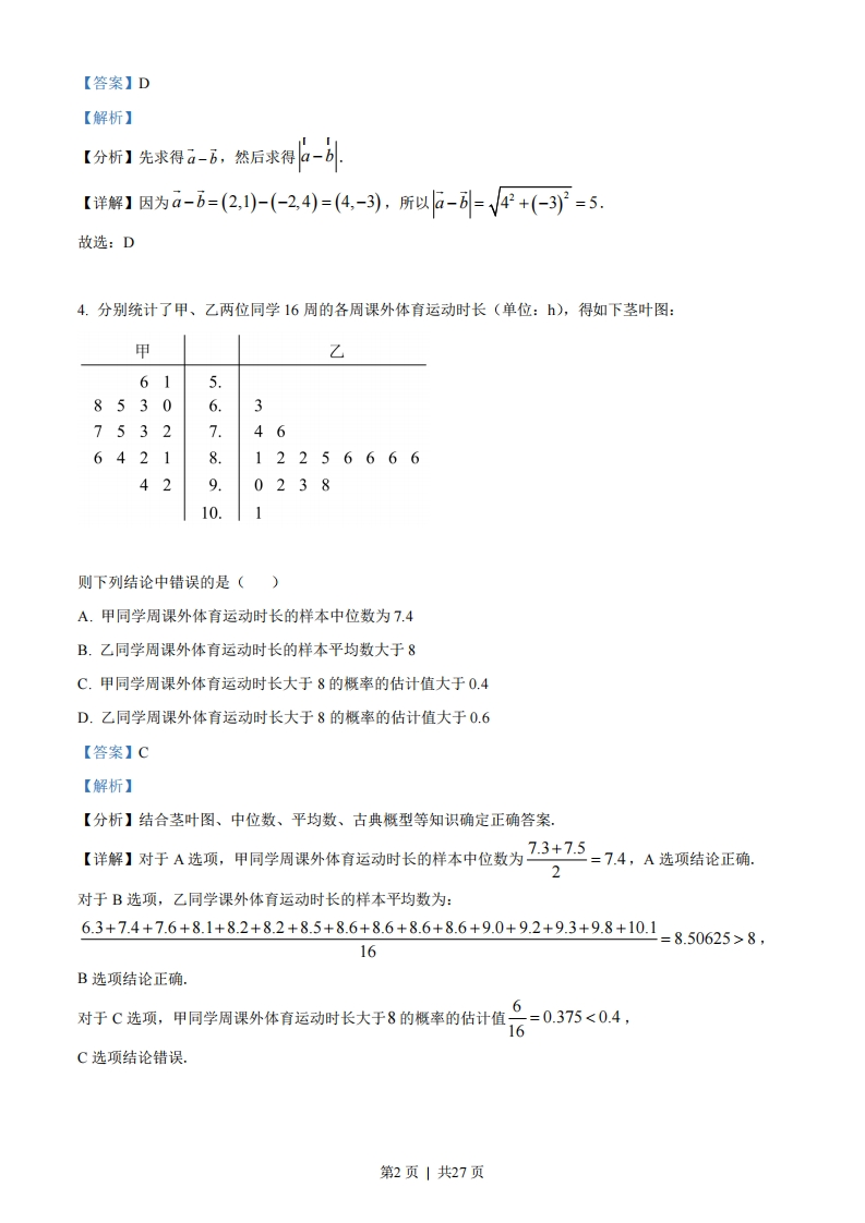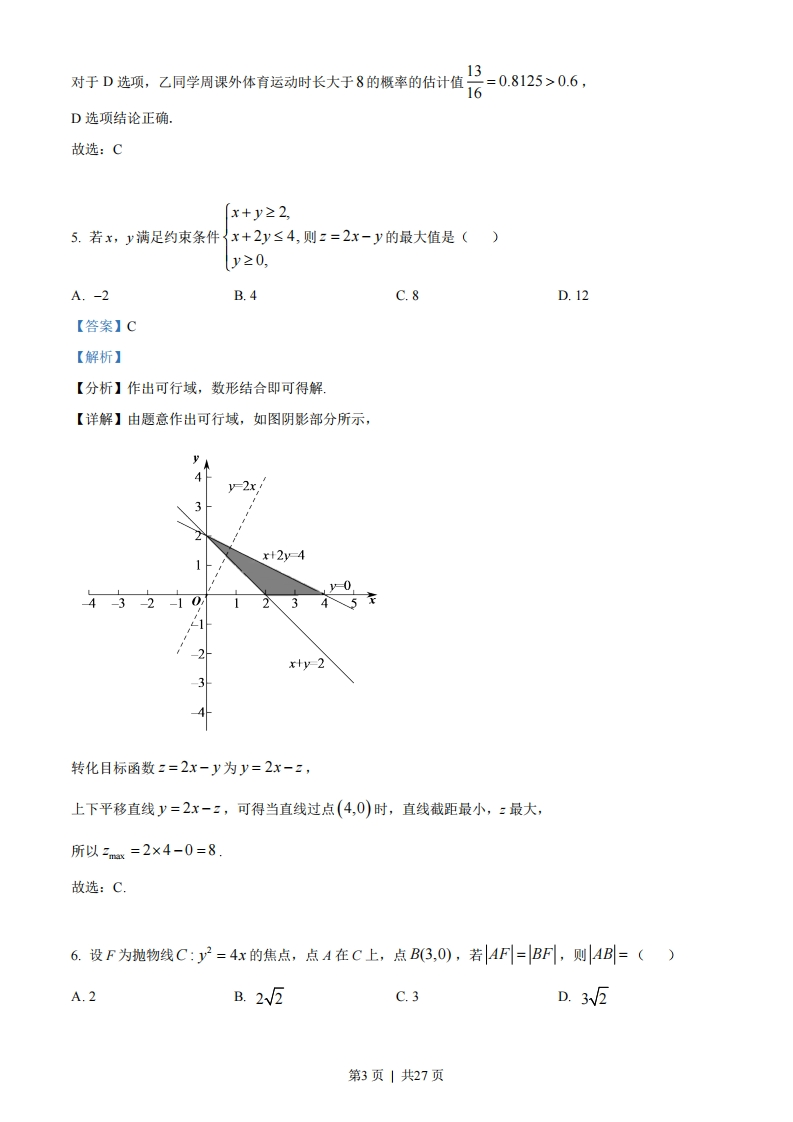2022年普通高等学校招生全国统一考试文科数学注意事项:1.答卷前,考生务必将自己的姓名、准考证号填写在答题卡上2.回答选择题时,选出每小题答案后,用2B铅笔把答题卡上对应题目的答案标号框涂黑如需改动,用橡皮擦干净后,再选涂其它答案标号框,回答非选择题时,将答案写在答题卡上写在本试卷上无效3。考试结束后,将本试卷和答题卡一并交回.一、选择题:本题共12小题,每小题5分,共60分.在每小题给出的四个选项中,只有一项是符合题目要求的1集合M=2,468,10y,N={18,16B选项结论正确,对于C选项,甲同学周课外体育运动时长大于8的概率的估计值=0.375<0.4,16C选项结论错误.第2页|共27页对于D选项,乙同学周课外体育运动时长大于8的概率的估计值3=0.8125>0.6,16D选项结论正确.故选:Cx+y22,5.若x,y满足约束条件{x+2y≤4,则z=2x-y的最大值是()y≥0,A.-2B.4C.8D.12【答案】C【解析】【分析】作出可行域,数形结合即可得解。【详解】由题意作出可行域,如图阴影部分所示,=2xx十2y=4,04-3-102345x+2转化目标函数z=2x-y为y=2x-z,上下平移直线y=2x一z,可得当直线过点(4,0)时,直线截距最小,:最大,所以2x=2×4-0=8.故选:C6.设F为抛物线C:y2=4x的焦点,点A在C上,点B(3,0),若AF=BF,则AB=()A.2B.2√5C.3D.32第3页|共27页