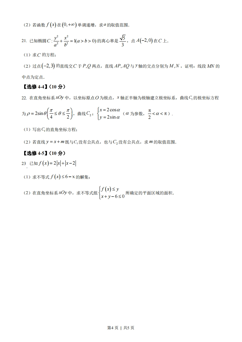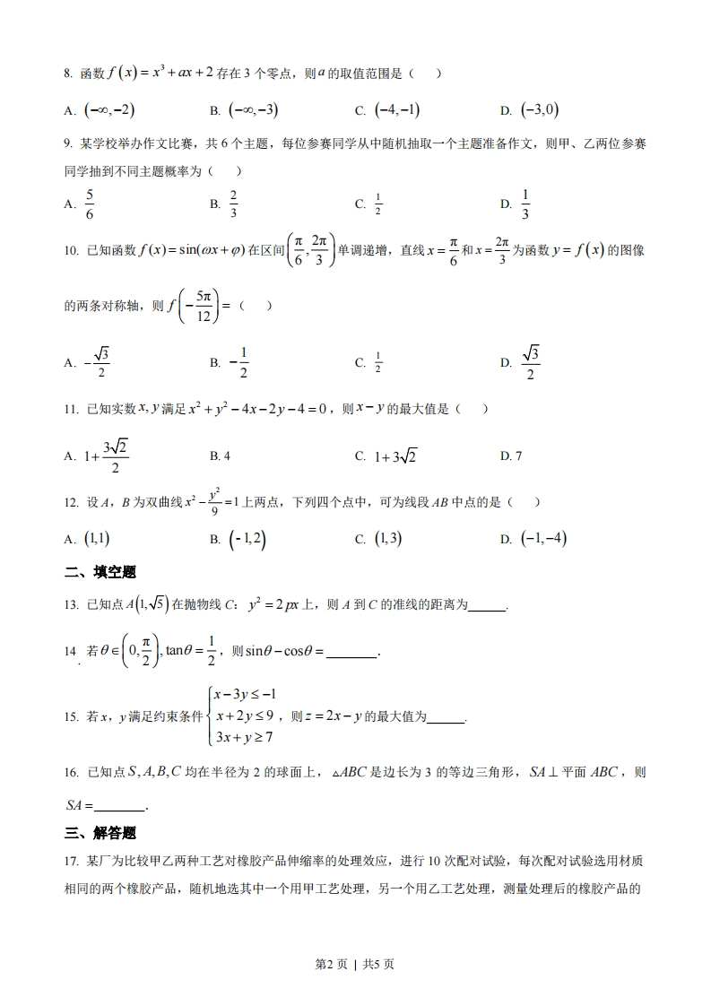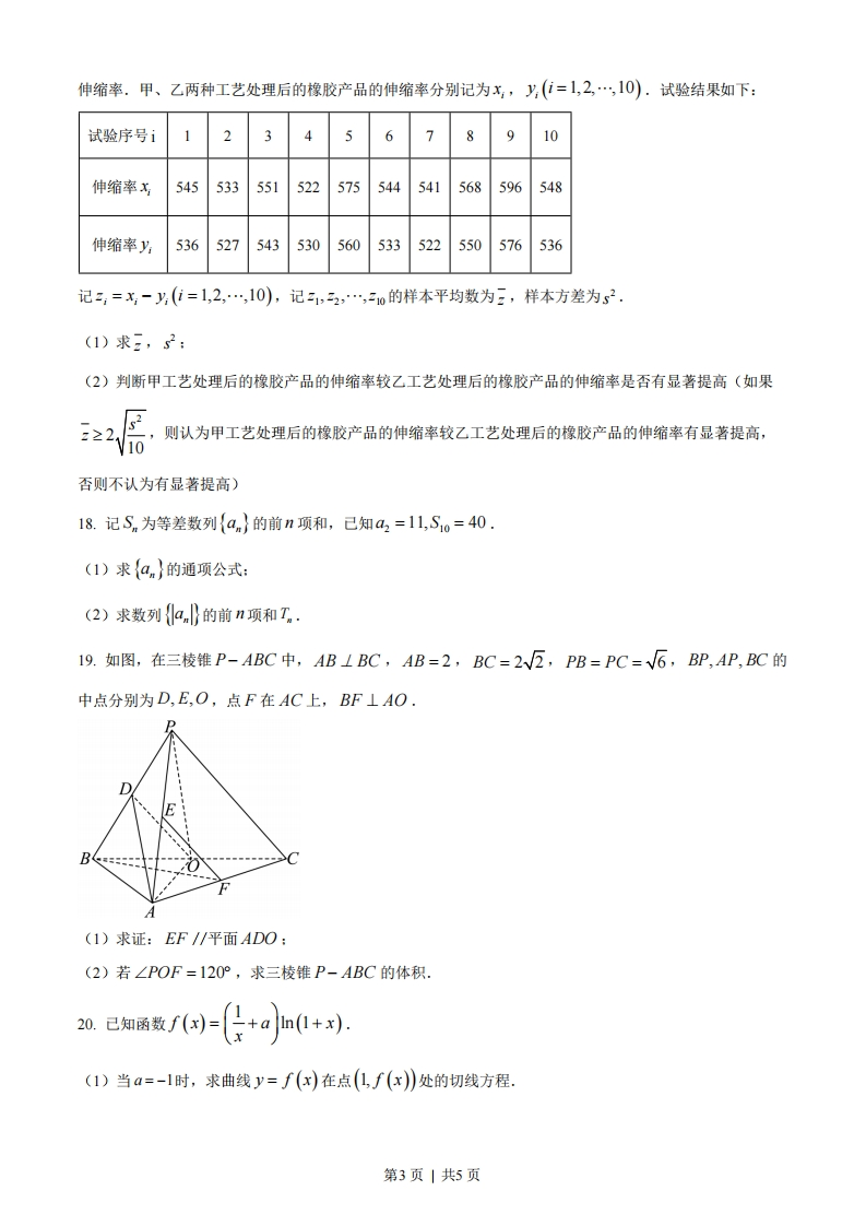 2023年普通高等学校招生全国统一考试(全国乙卷)文科数学一、选择题1.2++2()A.1B.2c.5D.52设全集U={0,1,2,4,6,8},集合M={0,4,6},N={0,1,6},则MUdN=()A.{0,2,4,6,8B.{0,1,4,6,8}C.{1,2,4,6,8}D.U3.如图,网格纸上绘制的一个零件的三视图,网格小正方形的边长为1,则该零件的表面积为()A.24B.26C.28D.304.在△ABC中,内角A,B,C的对边分别是a,b,C,若acosB-bcosA=c,且C=5,则∠B=()A.TB.C.3rD.2π10105已知f)=e是偶函数,则a=()ecr-1A.-2B.-1C.1D.26.正方形ABCD的边长是2,E是AB的中点,则EC.ED=()A.5B.3c.2W5D.57.设0为平面坐标系的坐标原点,在区域(x,y1≤2+y2≤4}内随机取一点4,则直线04的倾斜角不大于工的概率为()A86cD.第1页|共5页8.函数f(x)=x3+ax+2存在3个零点,则a的取值范围是()A.(-0,-2)B.(-0,-3)c.(-4,-1)D.(-3,0)9.某学校举办作文比赛,共6个主题,每位参赛同学从中随机抽取一个主题准备作文,则甲、乙两位参赛同学抽到不同主题概率为()J1A.6C.210.己知函数f(x)=sin(ox+p)在区间π2π63单调递增,直线x-和x=晉为画数)=儿)的图像5π的两条对称轴,D.522C.11.己知实数x,y满足x2+y2-4x-2y-4=0,则x-y的最大值是()3W5A.1+B.4C.1+3V2D.7212,设4,B为双曲线2-二=1上两点,下列四个点中,可为线段4B中点的是()9A.(1,1)B.(12)c.(1,3)D.(-1,-4)二、填空题13.己知点A1,V5在抛物线C:y2=2m上,则A到C的准线的距离为则sin8-cos0=_x-3y≤-115.若x,y满足约束条件{x+2y≤9,则z=2x-y的最大值为3x+y≥716.己知点S,A,B,C均在半径为2的球面上,△ABC是边长为3的等边三角形,SA⊥平面ABC,则SA=三、解答题17.某厂为比较甲乙两种工艺对橡胶产品伸缩率的处理效应,进行10次配对试验,每次配对试验选用材质相同的两个橡胶产品,随机地选其中一个用甲工艺处理,另一个用乙工艺处理,测量处理后的橡胶产品的第2页|共5页伸缩率.甲、乙两种工艺处理后的橡胶产品的伸缩率分别记为x,y,(i=1,2,,10).试验结果如下:试验序号i126910伸缩率,545533551522575544541568596548伸缩率536527543530560533522550576536记二,=x,-y,(i=1,2,…,10),记二1,32,…,2o的样本平均数为三,样本方差为s2.(1)求:,s2:(2)判断甲工艺处理后的橡胶产品的伸缩率较乙工艺处理后的橡胶产品的伸缩率是否有显著提高(如果z≥2则认为甲工艺处理后的橡胶产品的伸缩率较乙工艺处理后的橡胶产品的伸缩率有显著提高,W10否则不认为有显著提高)18.记Sn为等差数列{an}的前n项和,己知a2=11,S1o=40(1)求{an}的通项公式:(2)求数列{a}的前n项和T.19.如图,在三棱锥P-ABC中,AB⊥BC,AB=2,BC=2√2,PB=PC=V6,BP,AP,BC的中点分别为D,E,O,点F在AC上,BF⊥AO.DB(1)求证:EF/平面ADO:(2)若∠POF=120°,求三棱锥P-ABC的体积.20已知腾数f(-((任+ah+小(1)当a=-1时,求曲线y=f(x)在点(1,f(x)处的切线方程.第3页|共5页