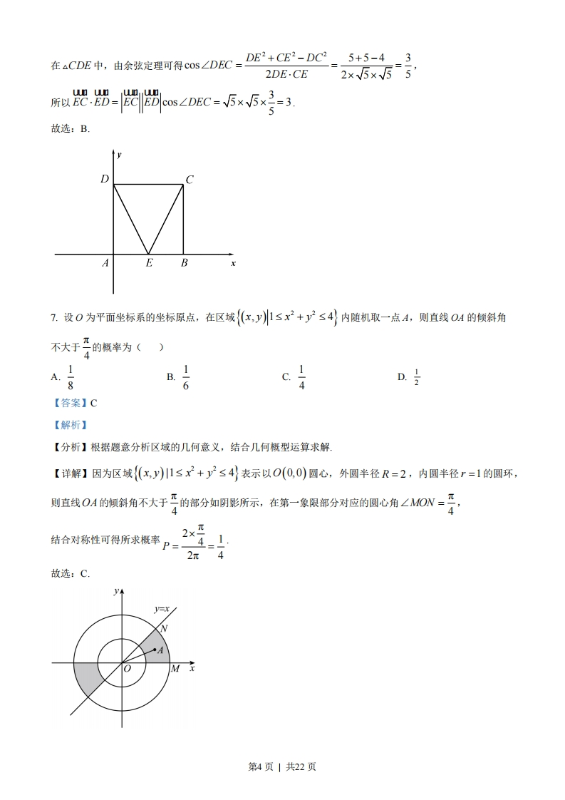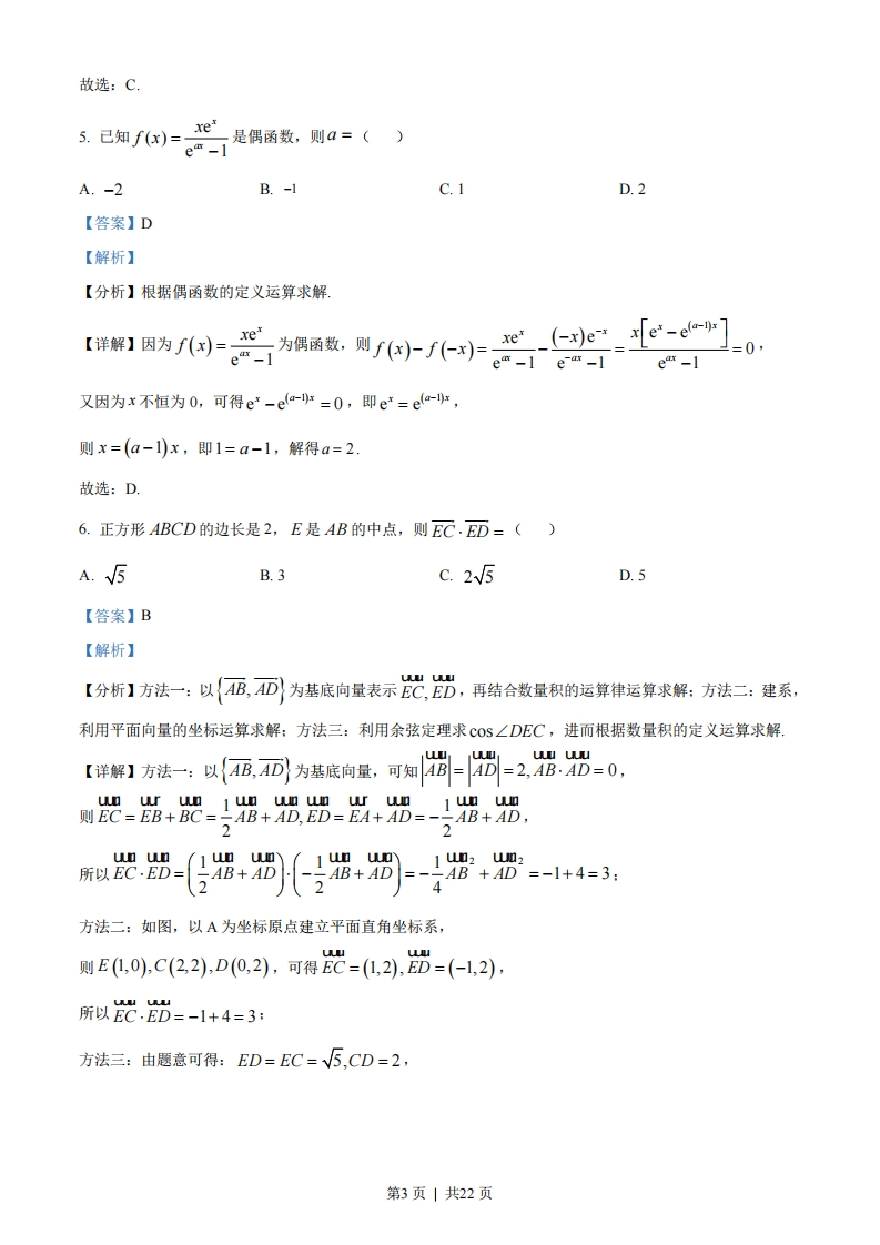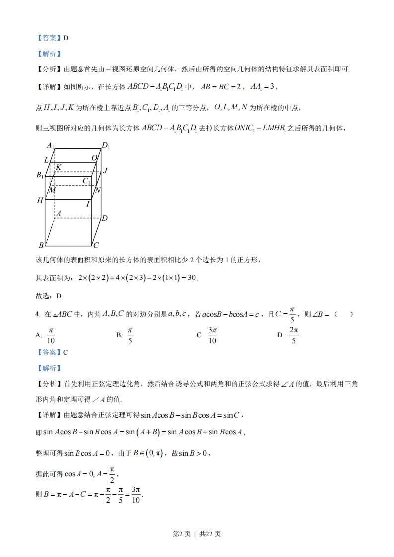 2023年普通高等学校招生全国统一考试(全国乙卷)文科数学一、选择题1P++2=()A.1B.2c.5D.5【答案】C【解析】【分析】由题意首先化简2+2+23,然后计算其模即可.【详解】由题意可得2+i2+2i3=2-1-2i=1-2i,则2+i2+2i=-21=V2+(-2)2=5故选:C2.设全集U={0,1,2,4,6,8},集合M={0,4,6},N={0,1,6},则MU4N=()A.{0,2,4,6,8}B.{0,1,4,6,8}C.{1,2,4,6,8}D.U【答案】A【解析】【分析】由题意可得aN的值,然后计算MU高,N即可.【详解】由题意可得N={2,4,8},则MUaN={0,2,4,6,8}故选:A3.如图,网格纸上绘制的一个零件的三视图,网格小正方形的边长为1,则该零件的表面积为()A.24B.26C.28D.30第1页|共22页【答案】D【解析】【分析】由题意首先由三视图还原空间几何体,然后由所得的空间几何体的结构特征求解其表面积即可【详解】如图所示,在长方体ABCD-ABCD中,AB=BC=2,AA,=3,点H,I,J,K为所在棱上靠近点B,C1,D,A的三等分点,O,LM,N为所在棱的中点,则三视图所对应的几何体为长方体ABCD-ABCD去掉长方体ONIC1-LMHB,之后所得的几何体,B该几何体的表面积和原来的长方体的表面积相比少2个边长为1的正方形,其表面积为:2×(2×2)+4×(2×3)-2×(1×1)=30故选:D4.在△4BC中,内角4,B,C的对边分别是a,b,c,若acosB-bcOs4=c,且C=交,则∠B=()5B.D.2π5C.3105【答案】C【解析】【分析】首先利用正弦定理边化角,然后结合诱导公式和两角和的正弦公式求得∠A的值,最后利用三角形内角和定理可得∠A的值【详解】由题意结合正弦定理可得sin Acos B-sin Bcos A=sinC,sin Acos B-sin B cos A sin (A+B)=sin A cos B+sin Bcos A,整理可得sin Bcos A=0,由于B∈(O,π),故sinB>0,据此可得c0sA=0,A=2则B=π-A-C=π-π_π3π2510第2页|共22页故选:C.5已知f)=e是偶函数,则a=()ecr-1A.-2B.-1C.1D.2【答案】D【解析】【分析】根据偶函数的定义运算求解【1国为)为指通或,则/砂仁)三-g-e]0ear-1 e-ar-1 ear -1又因为x不恒为0,可得e-ea-r=0,即e=ea-lr,则x=(a-1x,即1=a-1,解得a=2故选:D.6.正方形ABCD的边长是2,E是AB的中点,则EC.ED=()A.5B.3c.25D.5【答案】B【解析】ca c【分析】方法一:以{AB,AD为基底向量表示EC,ED,再结合数量积的运算律运算求解:方法二:建系,利用平面向量的坐标运算求解:方法三:利用余弦定理求COs∠DEC,进而根据数量积的定义运算求解uu uu【详解】方法一:以{AB,D为基底向量,可知AB=4D=2,BAD=0,wn ur wn 1un wn wn u wn 1 un wn则EC=EB+BC=-AB+AD,ED=EA+AD=--AB+AD,wn wo+=-+-1+4=34方法二:如图,以A为坐标原点建立平面直角坐标系,则E(1,0),C(2,2),D(0,2),可得EC=(1,2),ED=(-1,2),所以元D=-1+4=3:方法三:由题意可得:ED=EC=V5,CD=2,第3页|共22页