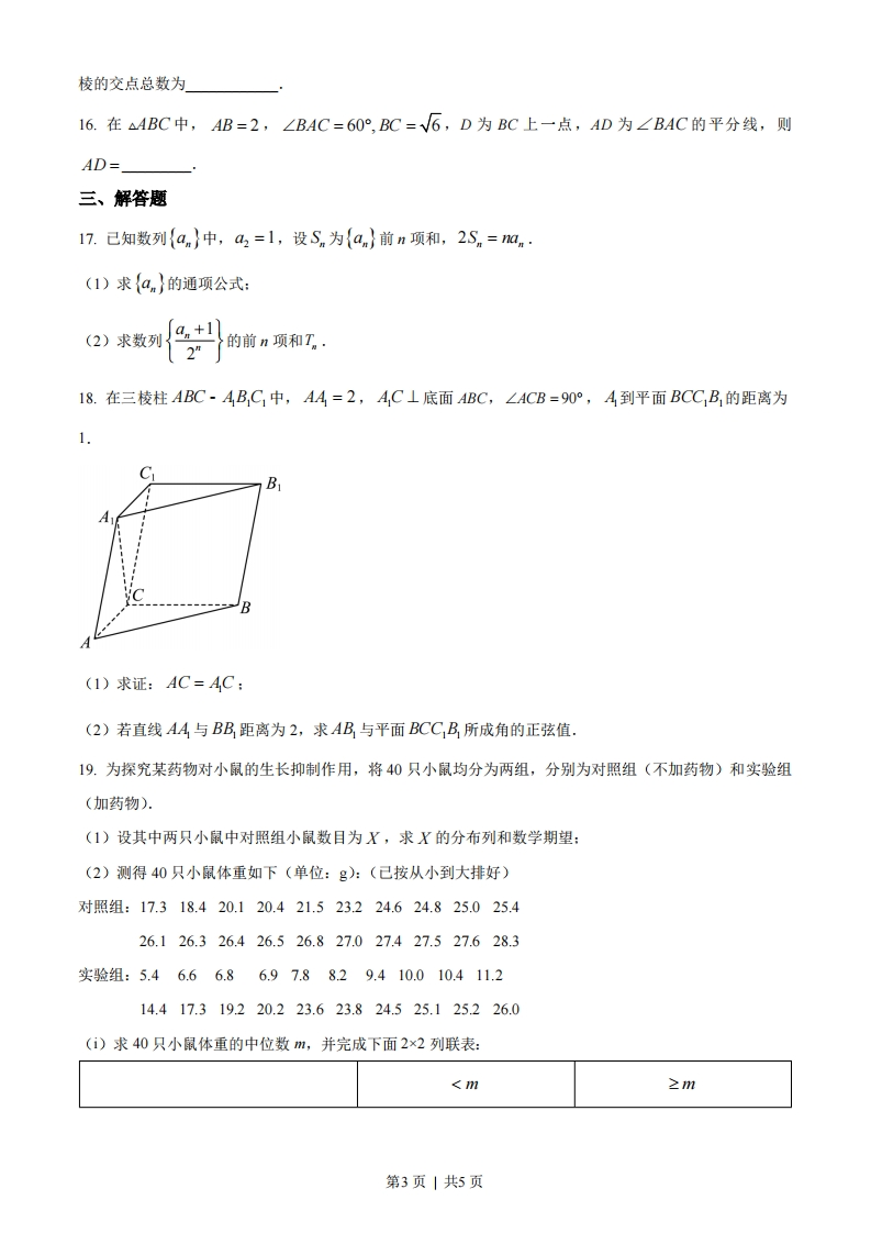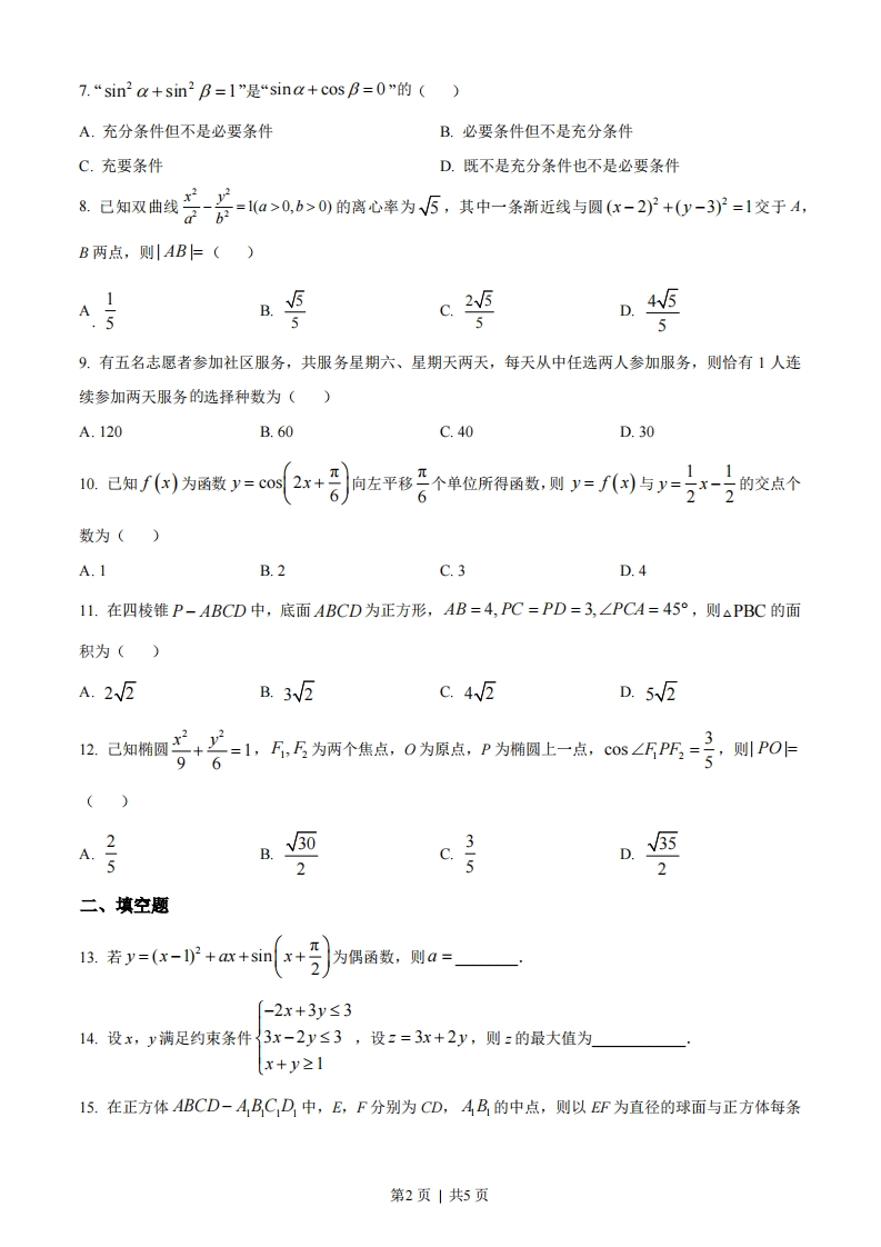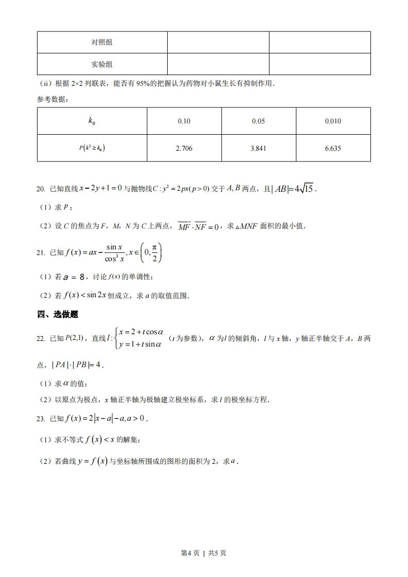 2023年普通高等学校招生全国统一考试(全国甲卷)理科数学一、选择题1.设集合A={付x=3k+Lk∈Z,B={付x=3k+2,k∈Z,U为整数集,A(AUB)=()A.{xx=3k,k∈ZB.{dx=3k-1,k∈Z}C.{xx=3k-2,k∈ZD.02.若复数(a+i)1-ai)=2,a∈R,则a=()A.-1B.0C.1D.23.执行下面的程序框遇,输出的B=()开始n=1,A=1,B=2n≤3?是A=A+BB=A+Bn=n+1输出B、结束A.21B.34C.55D.894.向量b1d=5,且a+6+c=0,则cos(a-c,i-=()A月2c5.己知正项等比数列{an}中,41=l,Sn为{an}前n项和,S=5S3-4,则S4=()A.7B.9C.15D.306.有50人报名足球俱乐部,60人报名乒乓球俱乐部,70人报名足球或乒乓球俱乐部,若己知某人报足球俱乐部,则其报乒乓球俱乐部的概率为()A.0.8B.0.4C.0.2D.0.1第1页|共5页7.“sin2a+sin2B=1”是“sina+cosB=0”的()A.充分条件但不是必要条件B.必要条件但不是充分条件C.充要条件D.既不是充分条件也不是必要条件x2 y28.已知双曲线京=1a>0,6>0)的离心率为5,其中一条渐近线与圆(x-2}2+0y-3)=1交于4,B两点,则|AB=()C25D.45·5B.55J9.有五名志愿者参加社区服务,共服务星期六、星期天两天,每天从中任选两人参加服务,则恰有1人连续参加两天服务的选择种数为()A.120B.60C.40D.3010.己知f(x)为函数y=cosπ向左平移个单位所得函数,则y=f()与y=-2的交点个116数为()A.1B.2C.3D.411.在四棱锥P-ABCD中,底面ABCD为正方形,AB=4,PC=PD=3,∠PCA=45°,则△PBC的面积为()A.2√2B.35C.42D.5W212已知椭圆号+上=1,万,乃为两个焦点,O为原点,P为椭圆上一点,c0s∠RPR,=},则1PO96()2A.5B.V302C.5D.35二、填空题13.若y=(x-l)2+ar+sin+2)为偶函数,则a=-2x+3y≤314.设x,y满足约束条件3x-2y≤3,设z=3x+2y,,则:的最大值为x+y≥115.在正方体ABCD-ABCD中,E,F分别为CD,AB的中点,则以EF为直径的球面与正方体每条第2页|共5页棱的交点总数为16.在△ABC中,AB=2,∠BAC=60°,BC=V6,D为BC上一点,AD为∠BAC的平分线,则AD=」三、解答题17.己知数列{an}中,a2=1,设Sn为{an}前n项和,2Sn=n.(1)求{an}的通项公式:(2)求数列a+12的前n项和T·18.在三棱柱ABC-AB,C中,AA4=2,A,C⊥底面ABC,∠ACB=90°,A到平面BCC,B,的距离为B(1)求证:AC=AC:(2)若直线AA与BB距离为2,求AB与平面BCC,B所成角的正弦值.19.为探究某药物对小鼠的生长抑制作用,将40只小鼠均分为两组,分别为对照组(不加药物)和实验组(加药物).(1)设其中两只小鼠中对照组小鼠数目为X,求X的分布列和数学期望:(2)测得40只小鼠体重如下(单位:g):(己按从小到大排好)对照组:17.318.420.120.421.523.224.624.825.025.426.126.326.426.526.827.027.427.527.628.3实验组:5.46.66.86.97.88.29.410.010.411.214.417.319.220.223.623.824.525.125.226.0()求40只小鼠体重的中位数m,并完成下面2×2列联表:<1m≥m第3页|共5页