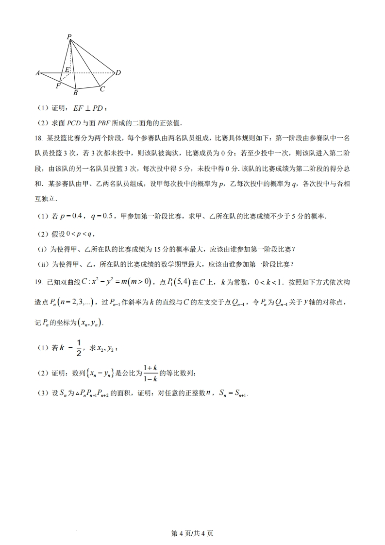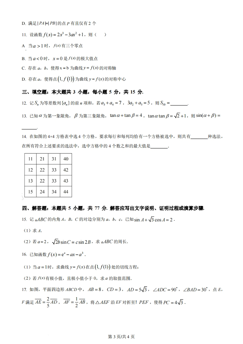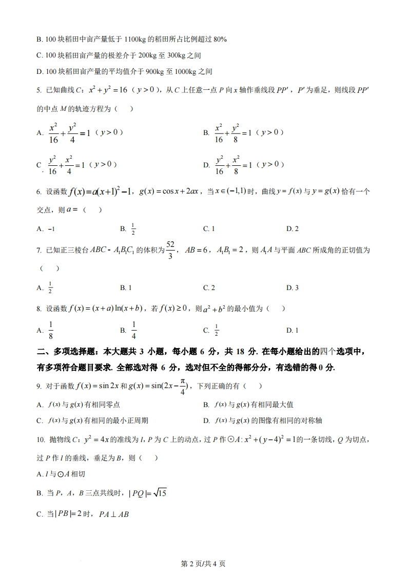 2024年普通高等学校招生全国统一考试(新课标Ⅱ卷)数学本试卷共10页,19小题,满分150分.注意事项:1答题前,先将自己的姓名、准考证号、考场号、座位号填写在试卷和答题卡上,并将准考证号条形码粘贴在答题卡上的指定位置.2.选择题的作答:每小题选出答案后,用2B铅笔把答题卡上对应题目的答案标号涂黑写在试卷、草稿纸和答题卡上的非答题区域均无效3.填空题和解答题的作答:用黑色签字笔直接答在答题卡上对应的答题区域内.写在试卷、草稿纸和答题卡上的非答题区域均无效4.考试结束后,请将本试卷和答题卡一并上交一、单项选择题:本大题共8小题,每小题5分,共40分.在每小题给出的四个选项中,只有一个选项是正确的.请把正确的选项填涂在答题卡相应的位置上,1.已知z=-1-i,则()A.0B.1c.5D.22.己知命题p:x∈R,|x+1>1:命题g:3x>0,x3=x,则()A.p和g都是真命题B.一P和q都是真命题C.p和一9都是真命题D.一P和一q都是真命题3.已知向量a,6满足同=l,+2=2,且(6-2a)16,则l=()A.522D.14.某农业研究部门在面积相等的100块稻田上种植一种新型水稻,得到各块稻田的亩产量(单位:kg)并部分整理下表亩产[900,[950,[1000,[1100,[1150,量950)1000)1050)1150)1200)频数612182410据表中数据,结论中正确的是()A.100块稻田亩产量的中位数小于1050kg第1页共4页B.100块稻田中亩产量低于1100kg的稻田所占比例超过80%C.100块稻田亩产量的极差介于200kg至300kg之间D.100块稻田亩产量的平均值介于900kg至1000kg之间5.己知曲线C:x2+y2=16(y>0),从C上任意一点P向x轴作垂线段PP',P'为垂足,则线段PP的中点M的轨迹方程为()A.2,y2=1(y>0)i6+4B+上=1(y>0)1682+=1(y>0)D.十-=1(y>0).164.1686.设函数f(x)=d(x+1)-1,g(x)=cosx+2ar,当x∈(-1,1)时,曲线y=f(x)与y=g(x)恰有一个交点,则a=()A.-1B.C.1D.27已知正三棱台ABC~4BC,的体积为23,AB=6,4,B=2,则4A与平面ABC所成角的正切值为()A.B.1C.2D.38.设函数f(x)=(x+a)ln(x+b),若f(x)≥0,则a2+b2的最小值为()1.8C.7D.1二、多项选择题:本大题共3小题,每小题6分,共18分.在每小题给出的四个选项中,有多项符合题目要求.全部选对得6分,选对但不全的得部分分,有选错的得0分9.对于函数f(x)=sin2x和g()=sin(2x-乃,下列正确的有()4A.()与g(x)有相同零点B.fx)与g(x)有相同最大值C.(x)与g(x)有相同的最小正周期D.f(x)与g(x)的图像有相同的对称轴10.抛物线C:y2=4x的准线为1,P为C上的动点,过P作⊙A:x2+(y-4)2=1的一条切线,Q为切点,过P作I的垂线,垂足为B,则()A.1与⊙A相切B.当P,A,B三点共线时,|PQ=V15C.当|PB=2时,PA⊥AB第2页共4页D.满足IPAFIPBI的点P有且仅有2个11.设函数f(x)=2x3-3m2+1,则()A当a>1时,(x)有三个零点B.当a<0时,x=0是f()的极大值点C.存在a,b,使得x=b为曲线y=f(x)的对称轴D.存在a,使得点(1,f(①)为曲线y=f(x)的对称中心三、填空题:本大题共3小题,每小题5分,共15分:12.记Sn为等差数列{an}的前n项和,若4+a=7,3a2+a=5,则S0=一13.己知a为第一象限角,B为第三象限角,tana+tanB=4,tanatan B=√2+l,则sin(a+)=14.在如图的4×4方格表中选4个方格,要求每行和每列均恰有一个方格被选中,则共有种选法,在所有符合上述要求的选法中,选中方格中的4个数之和的最大值是11213140122233421322334315243444四、解答题:本题共5小题,共77分.解答应写出文字说明、证明过程或演算步骤15.记△ABC的内角A,B,C的对边分别为a,b,c,己知sinA+√3cosA=2.(1)求A.(2)若a=2,√2 bsinC=csin2B,求△ABC的周长.16.己知函数f(x)=e-ax-a3.(1)当a=1时,求曲线y=f(x)在点(1,f()处的切线方程(2)若(x)有极小值,且极小值小于0,求a的取值范围.17.如图,平面四边形ABCD中,AB=8,CD=3,AD=5√5,∠ADC=90°,∠BAD=30°,点E,满足AE=二AD,AF=)B,将△AEF沿EF对折至IPEF,使得PC=45第3页/共4页