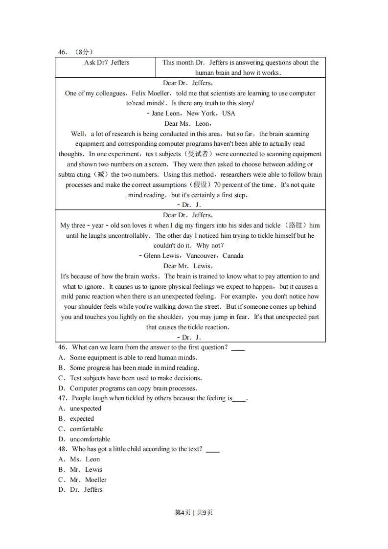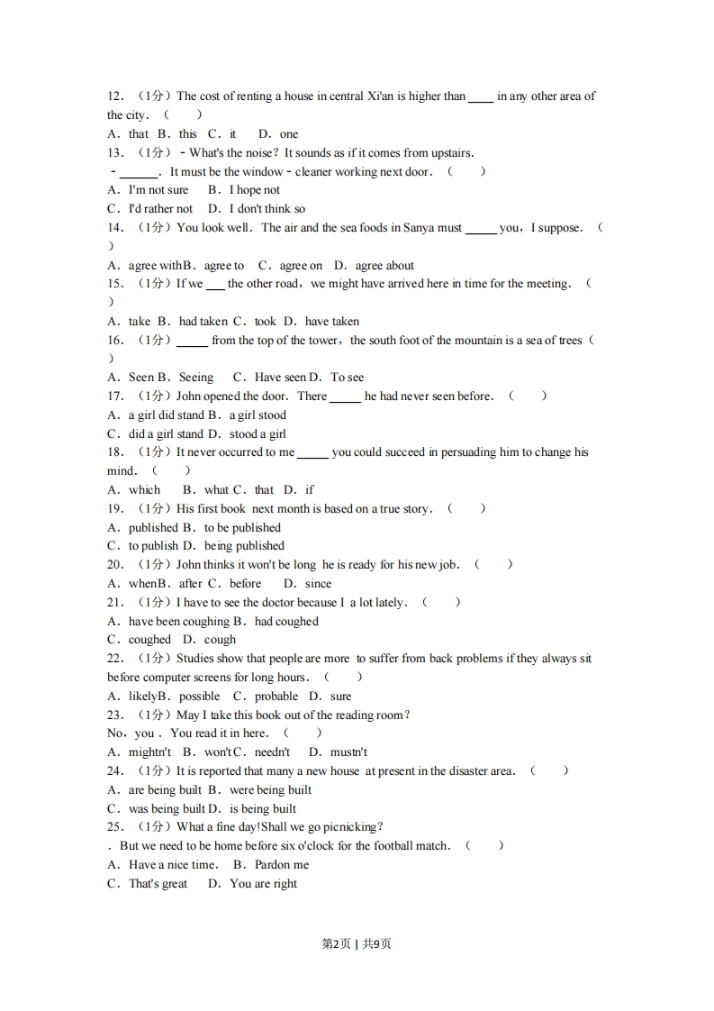 2010年陕西省高考英语试卷第一节语音知识(共5小题,每小题1分,满分5分)从每小题的A、B、C、D四个选项中,找出所给单词的正确读音,并在答题卡上将该选项涂黑。1.(1分)taste()A./teist/B./taest/C./tist/D./ta:st/2.(1分)touch()A./to:t B./tautf/C./tnt/D./taut/3.(1分)rey()A./ra:lai/B./ri:'lai/C./re'lai/D./ri'lai/4.(1分)1oss()A./s/B./bs/C.Aus/D./lu:s/5.(1分)agriculture()A./'aegriknltfa/B./ae'griknltfa/C./aegri'knltja/D./aegriknl'tfa/第二节情景对话(共1小题,每小题5分,满分5分)根据对话情景和内容,从对话后所给的选项中选出能填入年一空白处的最佳选项,并在答题卡上将该选项涂黑。选项中有两个为多余选项。6.(5)Jerry:Hi,Mike.Look like you've got some sun.Mike:I guess so.I spent the weekend on the beach.Jerry:Really?That sounds exciting.(6)Mike:At my friend's house.He invited me to stay there for as long as I wanted.Jerry:(7)Mike:Oh,I have a paper to work on.Jerry:(8)I mean besides lying out in the sun.Mike:I played some volleyball.I never realized how hard it is to run on sand.Jerry:(9)Did you go swimming?Mike:I intended to.(10)So I just went fishing.Jerry:All sounds so relaxing.A.What a pity!B.It must be cool.C.Where did you stay?D.But how did you get there?E.So what else did you do out there?F.But the water wasn't warm enough..G.Then why not stay there for a longer time?第三节语法和词汇知识(共15小题,每小题1分,满分15分)从每小题的A、B、C、D四个选项中,选出可以填入空白处的最佳选项,并在答思卡上将该选项涂黑,11.(The old temple roof was damaged in a storm is now under repair.A.where B.which C.its D.whose第1页1共9页12.(The cost of renting a house in central Xi'an is higher than in any other area ofthe city.()A.that B.this C.it D.one13.()-What's the noise?It sounds as if it comes from upstairs.-It must be the window-cleaner working next door.(A.I'm not sure B.I hope notC.I'd rather not D.I don't think so14.(You look well.The air and the sea foods in Sanya mustyou,I suppose.A.agree withB.agree to C.agree on D.agree about15.(If we the other road,we might have arrived here in time for the meeting.)A.take B.had taken C.took D.have taken16.(from the top of the tower,the south foot of the mountain is a sea of treesA.Seen B.Seeing C.Have seen D.To see17.(John opened the door.There he had never seen before.(A.a girl did stand B.a girl stoodC.did a girl stand D.stood a girl18.(It never occurred to me you could succeed in persuading him to change hismind.()A.which B.what C.that D.if19.(His first book next month is based on a true story.(A.published B.to be publishedC.to publish D.being published20.(John thinks it won't be long he is ready for his new job.(A.whenB.after C.before D.since21.(I have to see the doctor because I a lot lately.(A.have been coughing B.had coughedC.coughed D.cough22.(Studies show that people are more to suffer from back problems if they always sitbefore computer screens for long hours.(A.likelyB.possible C.probable D.sure23.(May I take this book out of the reading room?No,you.You read it in here.A.mightn't B.won'tC.needn't D.mustn't24.(It is reported that many a new house at present in the disaster area.(A.are being built B.were being builtC.was being built D.is being built25.(What a fine day!Shall we go picnicking?But we need to be home before six o'clock for the football match.(A