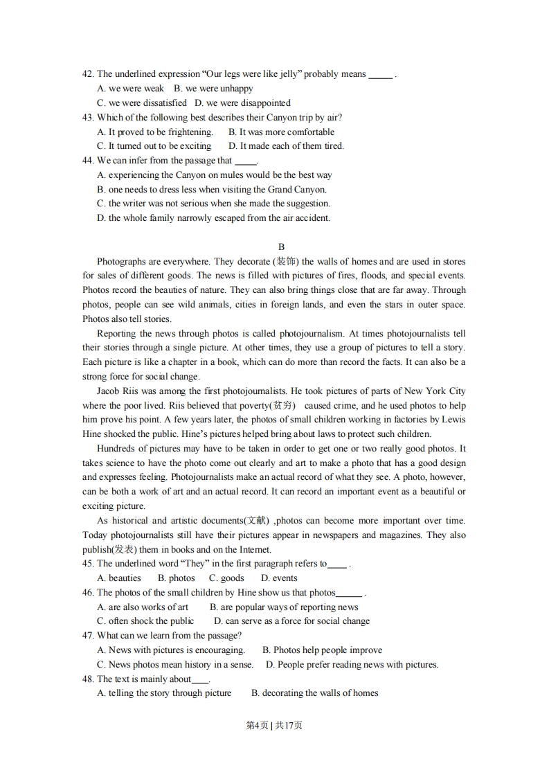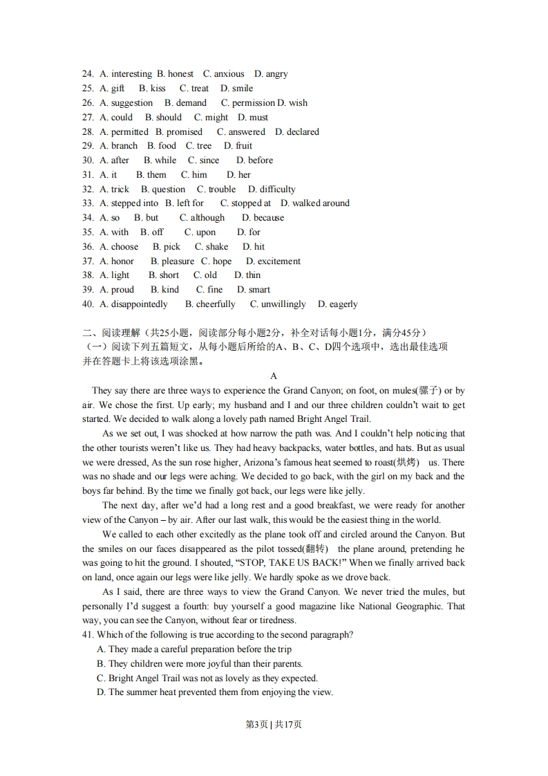 ★★★★★2008年普通高等学校招生统一考试(陕西卷)英语一、英语知识运用(共三大题,满分50分)(一)语音知识(共5小题,每小题1分,满分5分)从每小题的A、B、C、D四个选项中,找出其划线部分与所给单词的划线部分读音相同的选项,并在答题卡上将该选项涂黑。1.passengerA.sugar B.organize C.strange D.together2.chemistryA.stomach B.achieve C.check D.machine3.clubA.pollution B.struggle C.useful D.bury4.majorityA.baggage B.attract C.Canadian D.magazine5.areaA.theatre B.breathe C.break D.heaven(二)语法和词汇知识(共15小题,每小题1分,满分15分)从每小题的A、B、C、D四个选项中,选出可以填入空白处的最佳选项,并在答题卡上将该选项涂黑。6.The moment I got home,I found Imy jacket on the playground.A.had left B.left C.have left D.was leaving7.Not until the motorbike looked almost new repairing and cleaning it.A.he stopped B.did he stop C.stopped he D.he did stop8.Tomorrow is Tom's birthday.Have you got any ideathe party is to be held?A.what B.which C.that D.where9.-What sort of house do you want to have?Something big?--Well,itbe big--that's not important.A.mustn't B.needn't C.can't D.won't10.I atesandwich while I was waiting for20:08 train.A.the,a B.the,the C.a,the D.a,a11.The message is very important,so it is supposedas soon as possible.A.to be sent B.to send C.being sent D.sending12.He doesn't have furniture in his room--just an old desk.A.any B.many C.some D.much13.The man pulled out a gold watch,were made of small diamonds.A.the hands of whom B.whom the hands ofC.which the hands of D.the hands of which第1页1共17页14.around the Water Cube,we were then taken to see the Bird's Nest for the 2008 OlympicGames.A.Having shown B.To be shown C.Having been shown D.To show15.-Did you go to the show last night?-Yeah.Every boy and girl in the areainvitedA.were B.have been C.has been D.was16.Ten years ago the population of our village wasthat of theirs.A.as twice large as B.twice as large asC.twice as much as D.as twice much as17.Though we don't know what discussed,yet we can feel the topic_A.had changed B.will change C.was changed D.has been changed18.-The floor is dirty.Can anyone clean it?-I do it all the time.A.Don't mention it.B.Why you?C.Not sure D.Not me again.19.Elizabeth has already achieved successher wildest dreams.A.at B.beyond C.within D.upon20.It's going to rain.Xiao Feng,Will you please help methe clothes on the line?A.get off B.get back C.get in D.get on(三)完形填空(共20小题,每小题1.5分,满分30分)阅读下在短文,从短文后各题的A、B、C、D四个选项中,选出适合填入对应空白处的最佳选项,并在答题卡上将该选项涂黑。A woman id her sixties lived alone in her little cottage with a pear tree at her door.She spentall her time taking care of the tree.But the children nearby drover her 21 by making fun ofher.They would climb her tree and then run away with pears,22 "Aunty Misery"at her.One evening,a passer by asked to 23 for the night.Seeing that he had an 24 Face,shelet him in and gave him a nice 25 The next morning the stranger,actually a sorcerer ()thanked her by granting (her26that anyone who climbed up her tree_27_not be able tocome back down until she 28 it.When the children came back to steal her 29,she had them stuck on the tree.They had to begherlong 30she gave the tree permission to let_31 go.Aunty Misery was free from the