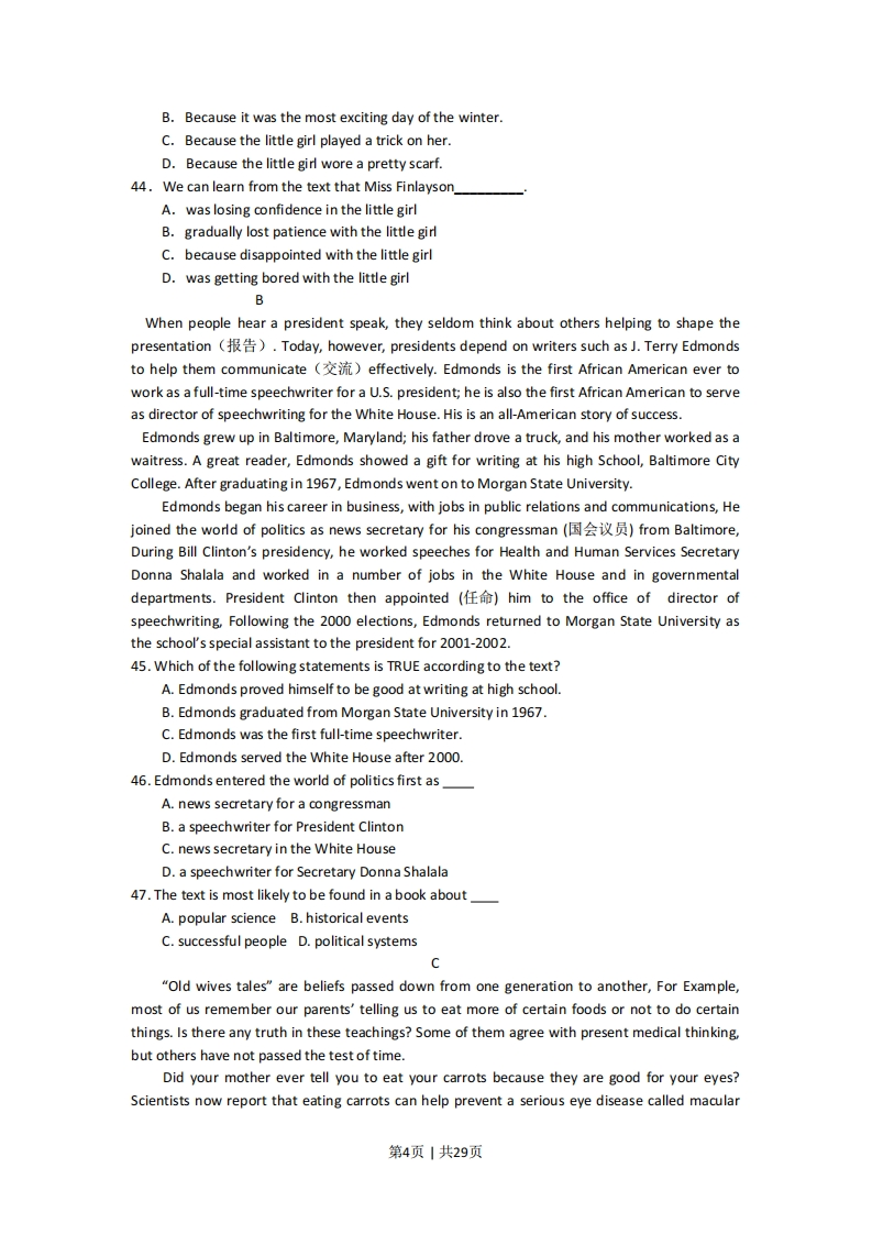 2009年普通高等学校招生全国统一考试(陕西卷)英语一、英语知识应用(共三大题,满分50分)(一)语音知识(共5小题,每小题1分,满分5分)从每小题的A、B、C、D四个选项中,找出其划线部分与所给单词的划线部分读音相同的选项,并在答题卡上将该选项涂黑。1.permitA.first B.behind C.island D.smile2.questionA.revolution B.exhibition C.suggestion D.education3.emptyA.toilet B.dozen C.general D.connect4.socialA.precious B.certain C.discovery D.Decision5.forgetA.ordinary B.major C.world D.report(二)语法和词汇知识(共15小题,每小题1分,满分15分)从每小题的A、B、C、D四个选项中,选出可以填入空白处的最佳选项,并在答题卡上将该选项涂黑。6.Whatpity that you couldn't be there to receive_prize!A.a:a B.the:a C.a:the D.the:the7.Dr Smith,together with his wife and daughters,_visit Beijing this summer.A.is gong to B.are going to C.was going to D.were going to8.He invited me to a dance after the show_Christmas Eve.A.at B.on C.in D.by9.This is the first time we_a film in the cinema together as a family.A.see B.had seen C.saw D.have seen10.Jane was asked a lot of questions,but she didn't answerof them.A.other B.any C.none D.some11.Gun control is a subjectAmericans have argued for a long time.A.of which B.with which C.about which D.into which12.Istill rememberto the Famen Temple and what I saw there.A.to take B.to be taken C.taking D.being taken13.My parents don't mind what job I doI am happy.A.even though B.as soon as C.as long as D.as though14.--My mother is preparing my favorite dishes,Go with me and have a taste,okay?-And I'll be glad to meet your parents.A.I think so B.I'd love to C.I'm sure D.Ihope so15.A notice was__in order to remind the students of the changed lecture time.A.sent up B.given up C.set up D.put up第1页|共29页16.He must be helping the old man to water the flowers,A.is he B.isn't he C.must he D.mustn't he17.The bow-to book can be of help to wants to do the job.A.who B.whomever C.no matter who D.whoever18.Littleabout her own safety,though she was in great danger herself.A.did Rose care B.Rose did care C.Rose does care D.does Rose care19.-Have you finished your first paper?Just half of it,how about you?A.Not at all B.Not likely C.Not a bit D.Not yet20.From their_on the top of the TV Tower,visitors can have a better view of the city.A.stage B.position C.condition D.situation(三)完形填空(共20小题,每小题1.5分,满分30分)阅读下面短文,从短文后各题的A、B、C、D四个选项中,选取出适合填入空白处的最佳选项,并在答题卡上将该选项涂黑。One afternoon,my son Adam asked me,"Are all people the same even if they are differentin color?"I thought for a minute,and then I said,"I'll explain,_21_you can just wait until we make aquick 22 at the grocery store.I have something 23 to show you.At the grocery store,we 24 some apples-red,green and yellow ones.Back home.I toldAdam,It's time to 25 your question."I put oneapple of each 26 on the table.Then I looked at Adam,who had a 27 look on his face."People are like apples.They come in all 28 colors,shapes and sizes.On the 29some ofthe apples may not 30 look as delicious as the others."As I was talking,Adam was 31 each onecarefully.Then,I took each of the apples and peeled (them,32 them back on the table,but 33 adifferent place."Okay,Adam,tell me which is which."He said,"I 34 tell.They all l