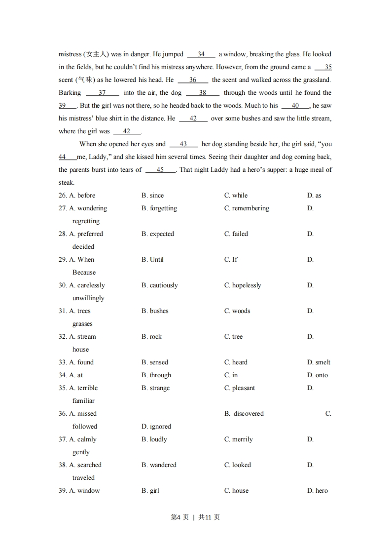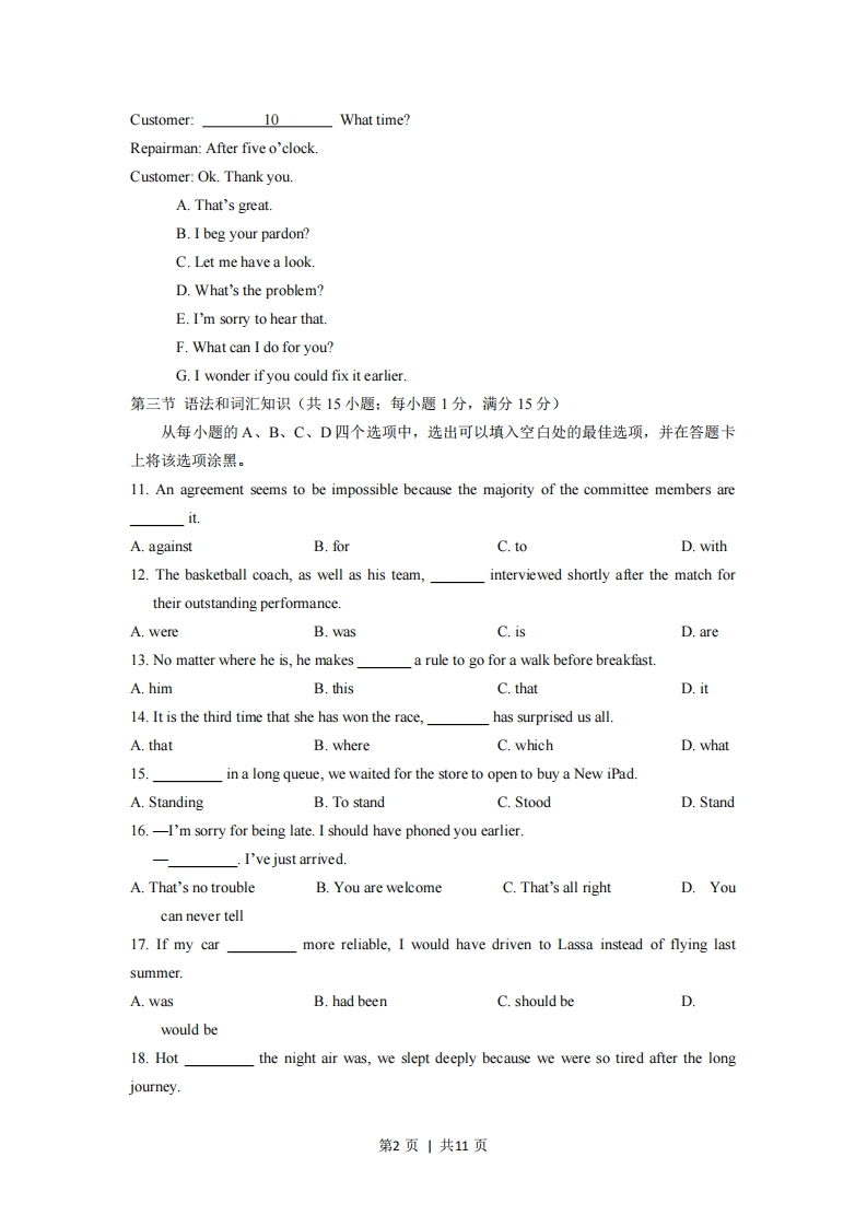 2012年普通高等学校招生全国统一考试(陕西卷)英语试题第一部分:英语知识运用(共四节,满分55分)第一节语音知识(共5小题:每小题1分,满分5分)从每小题的A、B、C、D四个选项中,找出其划线部分与所给单词的划线部分读音相同的选项,并在答题卡上将该选项涂黑。1.regardA.designB.gentleC.collegeDforget2.refuseA.discussB.rudeC.focusDexcuse3.chargeA.toothacheB.machineC.searchDChristian4.fieldA.quietB.pieceC.friendexperence5.tapesA.potatoesB.speechesC.cakesDbridges第二节情景对话(共5小题:每小题1分,满分5分)根据对话情境和内容,从对话后所给的选项中选出能填入每一空白处的最佳选项,并在答题卡上将该选项涂黑。选项中有两个为多余选项。Repairman:Good afternoon.6Customer:Hello.My mobile phone isn't working.Could you repair it,please?Repairman1Customer:It worked well yesterday,but I simply couldn't turn it on this morning.Repairman:8Customer:Here you are.Repairman:Well,I think we'll be able to fix it.You can pick it up this Friday.Customer:Oh,no.That's too long.9I need it as soon as possible.Repairman:Let me see.How about Wednesday aftemoon?第1页|共11页Customer:10What time?Repairman:After five o'clock.Customer:Ok.Thank you.A.That's great.B.I beg your pardon?C.Let me have a lookD.What's the problem?E.I'm sorry to hear that.F.What can I do for you?G.I wonder if you could fix it earlier.第三节语法和词汇知识(共15小题:每小题1分,满分15分)从每小题的A、B、C、D四个选项中,选出可以填入空白处的最佳选项,并在答题卡上将该选项涂黑。11.An agreement seems to be impossible because the majority of the committee members areit.A.againstB.forC.toD.with12.The basketball coach,as well as his team,interviewed shortly after the match fortheir outstanding performance.A.wereB.wasC.isD.are13.No matter where he is,he makesa rule to go for a walk before breakfast.A.himB.thisC.thatD.it14.It is the third time that she has won the race,has surprised us all.A.thatB.whereC.whichD.what15.in a long queue,we waited for the store to open to buy a New iPad.A.StandingB.To standC.StoodD.Stand16.-I'm sorry for being late.I should have phoned you earlier.I've just arrived.A.That's no troubleB.You are welcomeC.That's all rightD.Youcan never tell17.If my carmore reliable,I would have driven to Lassa instead of flying lastsummer.A.wasB.had beenC.should beDwould be18.Hotthe night air was,we slept deeply because we were so tired after the longjourney.第2页|共11页A.althoughB.asC.whileD.however19.He had to pause from time to time to wipe the sweat from his forehead,because theair-conditioning systemA.broke inB.broke upC.broke outD.brokedown20.As many as five courses are provided,and you are free to choose_suits you best.A.whateverB.whicheverC.wheneverD.wherever21.-The trip shouldn't take more than an hour.It is at least twohours.A.I guess soB.That's itC.You must be jokingD.Itdepends22.If he takes on this work,he will have no choice butan even greater challengeA.meetsB.meetingC.meetD.0meet23.1thank you too much for all your help to my son while we were away from home.A.won'tB.can'tC.canD.will24.-Can I call you back at two o'clock this aftemoon?-I'm sorry,but by then Ito Beijing.How about five?A.flyB.will flyC.will be flyingDamflying25.All the photographs in this book,stated otherwise,date from the 1950sA.unlessB.untilC.onceD.if第四节完形填空(共20小题:每小题1.5分,满分30分)阅读下面短文,从短文后各题的A、B、C、D四个选项中,选出适合填入对应