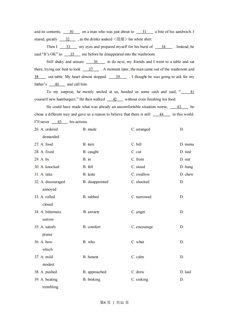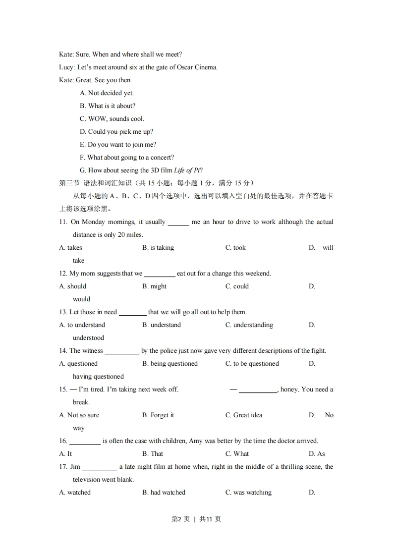 2013年普通高等学校招生全国统一考试(陕西卷)英语试题第一部分:英语知识运用(共四节,满分55分)第一节语音知识(共5小题:每小题1分,满分5分)从每小题的A、B、C、D四个选项中,找出其划线部分与所给单词的划线部分读音相同的选项,并在答题卡上将该选项涂黑。1.laughA.daughterB.neighborC.enoughD.though2.citizenA.uncleB.oceanC.rescueDpercent3.completeA.sceneB.electC.studentrespect4.alarmA.rewardB.dollarC.towards0farmer5.dailyA.bargainB.saidC.curtainD.explain第二节情景对话(共5小题:每小题1分,满分5分)根据对话情境和内容,从对话后所给的选项中选出能填入每一空白处的最佳选项,并在答题卡上将该选项涂黑。选项中有两个为多余选项。Lucy:Hi,Kate.What are you doing tonight?Kate:6Any suggestions?Lucy:>I'm planning it for days.Kate:A 3D film?Who stars?Lucy:Surai Sharma,a handsome young actor.Kate:Oh!8Lucy:An Indian boy's unusual experience with a tiger at sea.Kate:9What time is it on?Lucy:Half past six.10第1页|共11页Kate:Sure.When and where shall we meet?Lucy:Let's meet around six at the gate of Oscar Cinema.Kate:Great.See you then.A.Not decided yet.B.What is it about?C.WOW,sounds cool.D.Could you pick me up?E.Do you want to join me?F.What about going to a concert?G.How about seeing the 3D film Life of Pi?第三节语法和词汇知识(共15小题:每小题1分,满分15分)从每小题的A、B、C、D四个选项中,选出可以填入空白处的最佳选项,并在答题卡上将该选项涂黑。11.On Monday momings,it usuallyme an hour to drive to work although the actualdistance is only 20 milesA.takesB.is takingC.tookD.willtake12.My mom suggests that weeat out for a change this weekend.A.shouldB.mightC.couldDwould13.Let those in needthat we will go all out to help them.A.to understandB.understandC.understandingD.understood14.The witnessby the police just now gave very different descriptions of the fight.A.questionedB.being questionedC.to be questionedD.having questioned15.-I'm tired.I'm taking next week off.honey.You need abreak.A.Not so sureB.Forget itC.Great ideaD.Noway16.is often the case with children,Amy was better by the time the doctor arrived.A.ItB.ThatC.WhatD.As17.Jima late night film at home when,right in the middle of a thrilling scene,thetelevision went blankA.watchedB.had watchedC.was watchingD第2页|共11页would be watching18.I have leamed a lot of good things about youI came back from abroad.A.sinceB.untilC.beforeD.when19.Marco Polo is said to have sailed onPacific Ocean on his way to Java inthirteenth century.A.the;aB.a;不填C.不填;theD.the;the20.It remains to be seenthe newly formed committee's policy can be put intopractice.A.thatB.whichC.whatD.whether21.The childrenlost in the woods;otherwise,they would have been at the lakesidecamp as scheduledA.must have gotB.must getC.should have gotDshould get22.Although Rosemary had suffered from a serious illness for years,she lostof herenthusiasm for lifeA.someB.neitherC.noneD.all23.-Shall we go for a drink at one o'clock this afternoon?Willtwo o'clock be OK?A.Sure,it's up to youB.Sure,no problemC.Sorry,I can't make itD.Sorry,I'm not available today24.The manager wants to see change in the company,and I am sure he willA.in particularB.in tumC.in chargeD.time25.My uncle hasn't been able to quit smoking,but at least he hasA.cut outB.cut downC.cut upD.cutoff第四节完形填空(共20小题:每小题1.5分,满分30分)阅读下面短文,从短文后各题的A、B、C、D四个选项中,选出适合填入对应空白处的最佳选项,并在答题卡上将该选项涂黑。T