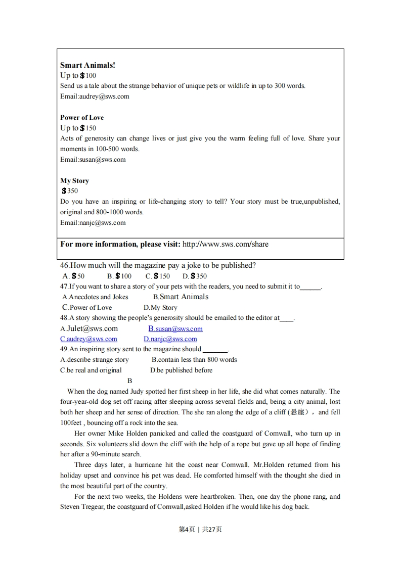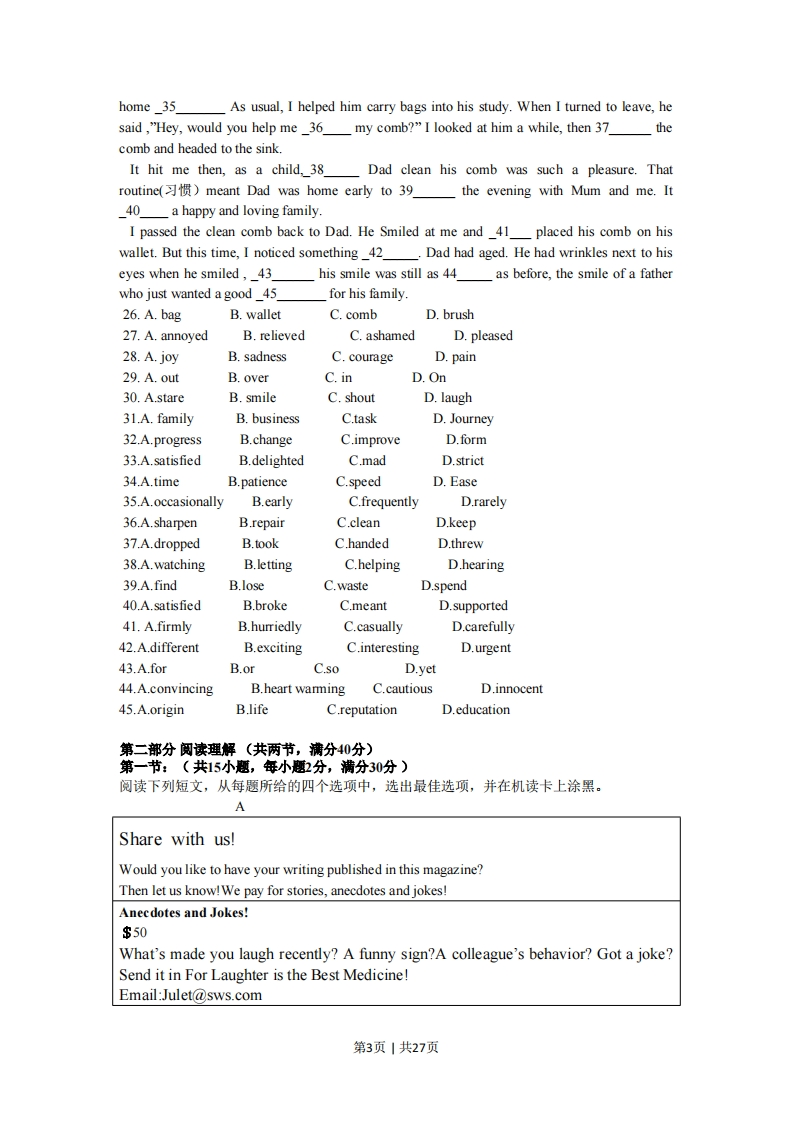 2015年陕西高考英语试题及答案第一部分英语知识运用(共四节,满分55分)第一节语音知识(共5小题,每小题1分,满分5分)从A、B、C、D四个选项中,找出与所给单词划线部分读音相同的选项,并在机读卡上将该选项涂黑。1.StomachA.technologyB.exchangeC.chairD.church2.uncleA.concertB.strangeC.blanketD.autumn3.exactA.excellentB.exampleC.exercise D.expensive4.tableA.cottageB.basketC.wakeD.Family5.doubleA.soulB.groupC.pronounce D.couple第二节:情景对话(共5小题,每小题1分,满分5分)根据对话内容,从对话后的选项中选出能填入空白处的最佳选项,并在机读卡上将该选项涂黑,选项中有两项为多余选项。Doctor.Good morning,Sir6Johnson:Yes,doctor.I'm always tired but when I go to bed I can't sleepDoctor:7Johnson:Since I started my new job two months agoDoctor.What is your job?Johnson:I'm in advertising.8Doctor.It depends.How many hours do you work?Johnson:About 80 hours a week.Doctor._9」Do you often take exercise?Johnson:Not very often.10Doctor:Well,you do need to find some time.Try to work less,or look for a stress-free job.A.That's alot.B.I like my job.C.Does it matter?D.How can I help you?E.I don't have the time.F.What time do you usually go to bed?G.How long have you had this problem?第三节语法和词汇知识(共15小题,每小题1分,满分15分)从A、B、C、D四个选项中,选出可以填入空白处的最佳选项,并在机读卡上涂黑。11.--Let's go to the New Year's Eve party,shall we?I guess it will be fun.A.Forget it!B.No way!C.Why not?D.What for?12.The little pupil took his grandmathe arm and walked her across the street.A.on B.byC.in D.at13.To warm himself,the sailor sat in front of the fire rubbing one bare foot against第1页|共27页A.anotherB.the other C.otherD.either14.more learned a man is,more modest he usually becomesA.The;the B.A:aC.The:a D.A:the15.As the smallest child of his family,Alex is always longing for the timehe should beable to be independent.A.which B.whereC.whomD.when16.-Sir,could I hand in my homework a bit late?since you've have been unwell these days.A.You can't be seriousB.I'm afraid notC.Good ideaD.Well,all right17.After receiving the Oscar for Best Supporting Actress,Anne Benedict went onall the people who had helped in her career.A.to thank B.thanking C.having thanked D.to have thanked18.Back from his two-year medical service in Africa,Dr.Lee was very happy to see his mothergood care of at home.A.taking B.taken C.takeD.be taken19.Reading her biography,I was lost in admiration forDoris Lessing hadachieved in literature.A.what B.that C.whyD.how20.I believe you will have a wonderful time hereyou get to know everyone else.A.thoughB.as if C.onceD.So that21.You、feel all the training a waste of time,but I'm a hundred percent sure lateryou'll be grateful you did it.A.should B.need C.shall D.may22.Martyreally based on his book and he thinks he'll have finished it by Fridays.A.worked B.has been working C.had worked D.Has worked23.Ellen is a famous doctor.I wish Ias well as her.A.dance B.will dance C.had danced D.danced24.At college,Barack Obama didn't know that he the first black president of theUnited States of America.A.was to become B.becomes C.is to become D.became25.Peter willhis post as the lead of the travel agency at the end of next month.A.take upB.put upC.add upD.break up第四节完形填空(共20小思,每小愿15分,满分30分)阅读下列短文,掌握其大意