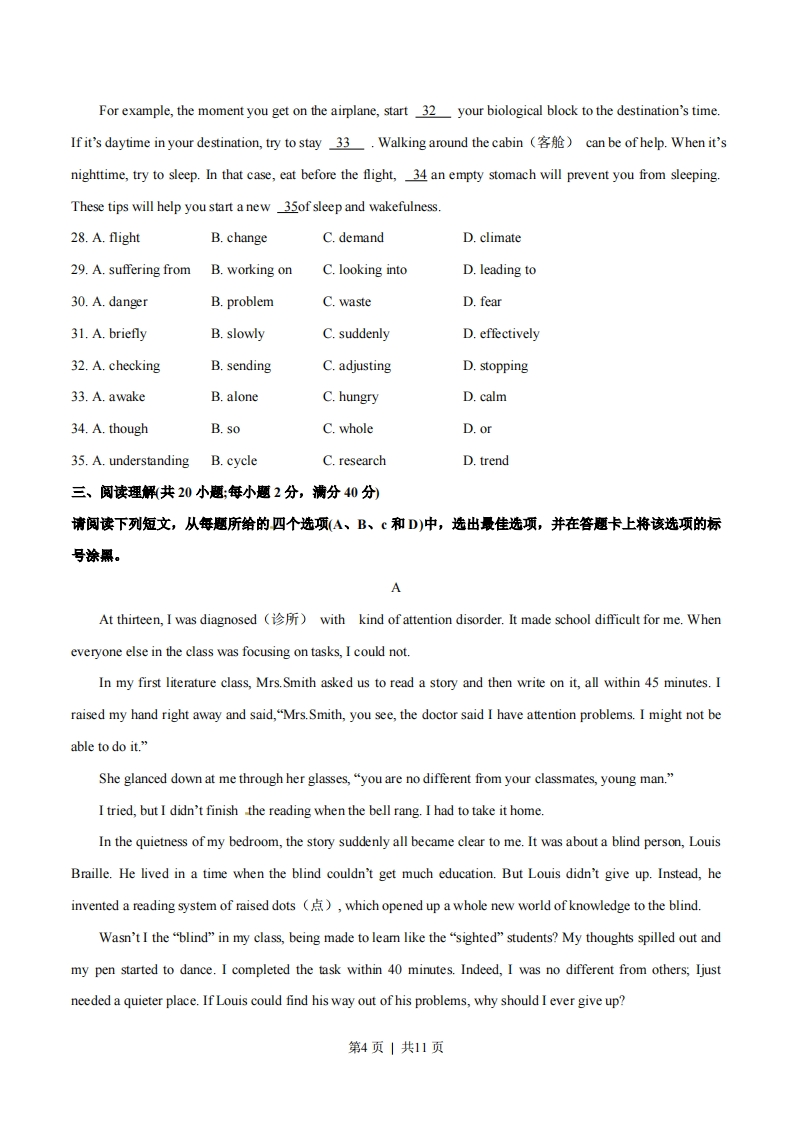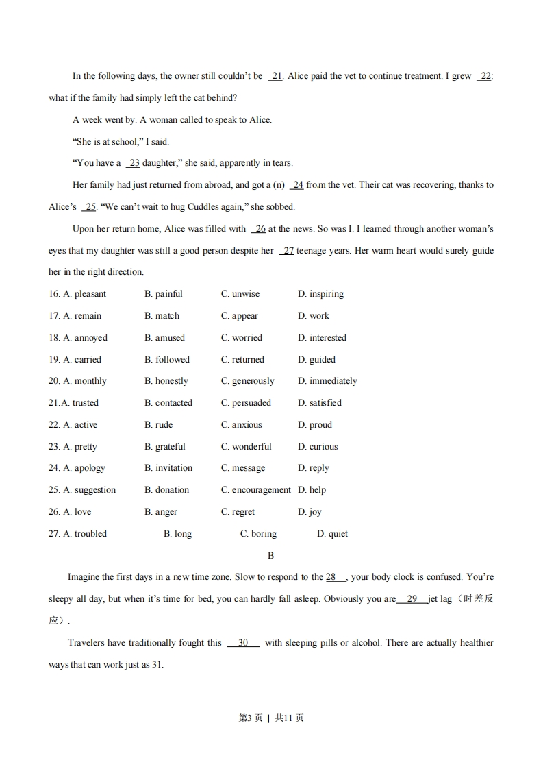 2015年普通高等学校招生全国统一考试(重庆卷)英语试题英语试题卷共10页。满分120分。考试时间100分钟。注意事项:1.答题前,务必将自己的姓名、准考证号填写在答题卡规定的位置上。2.答选择题时,必须使用2B铅笔将答题卡上对应题目的答案标号涂黑。如需改动,用橡皮擦擦干净后,再迭涂其它答案标号。3.答非选择题时,必须使用0.5毫米黑色签字笔,将答案书写在答题卡规定的位置上。4.所有题目必须在答题卡上作答,在试题卷上答题无效。5.考试结束后,将试题卷和答题卡一并交回。一、单项埴空(共15小题:每小题1分,满分15分)请从A、B、c、D四个选项中,选出可以填人空白处的最佳选项,井在答属卡上将该选项的标号涂黑。1.-Is Peter coming?-No.he his mind after a phone call at the last minuteA.changesB.changedC.was changing D.had changed2.The meeting will be held in September,but knows the date for sure.A.everybodyB.nobodyC.anybodyD.somebody3.I just heard bank where Dora works was robbed by gunman wearing a mask.A.the;/B.a,/C.the;aD.a;the4.If you miss this chance,it may be years you get another one.A.AsB.beforeC.sinceD.after5.-I can drive you home.but are you sure it's not too much trouble?A.That would be greatB.Don't botherC.I'm afraid notD.Take care6.in the poorest area of Glasgow,he had a long,hard road to becoming a football star.A.Being raisedB.RaisingC.RaisedD.To raise7.Without his wartime experiences,Hemingwayhis famous novel A Farewell to Arms.A.Didn't writeB.hadn't written第1页|共11页C.wouldn't writeD.wouldn't have written8.We must find out Karl is coming,so we can book a room for him.A.when B.howC.whereD.why9.Bach died in 1750,but it was not until the early 19th century his musical gift was fully recognizedA.while B.thoughC.thatD.after10.Last year was the warmest year on record,with global temperature 0_68 'C the average.A.below B.onC.atD.above11.Like ancient sailors,birds can find their way the sun and the stars.A.usedB.having used C.usingD.use12.You be Carol.You haven't changed a bit after all these years.A.must B.canC.willD.shall13.In my hometown,there is always a harvest supper for the farmers after all the wheatcut.A.will have been B.will beC.wasD.has been14.He wrote many children's books,nearly half of were published in the 1990s.A.whom B.whichC.themD.That15.-Hello Jenny,can I see Ms.Lewis?-.I'll tell you're here.A.With pleasureB.Never mindC.You're welcomeD.Just a minute二、完形填空(共20小题:每小题1.5分,满分30分)请阅读下面两篇短文,掌握大意,然后从16一35各题所给的四个选项(A、B、C和D)中,选出最佳选项,并在答题卡上将该选项的标号涂黑。AWhen Alice was sixteen,I was the one who wanted to run away from home.It was 16 to see the changescoming over her.She skipped school,and refused to communicate.I tried being firm,but it didn't 17.I saw adark future for my once sweet daughter.One school day Alice returned home very late.With a quarrel in view.I was surprised to see Alice was 18hope I did the right thing,Mom,“Alice said.I saw a cat,all bloody but alive.I_I9 it to the vet's(宠物医院),and was asked to make payment 20.As I couldn't reach anyone at the phone number on the cat's tag()I hadto pay the bill.”第2页|共11页In the following days,the owner still couldn't be 21.Alice paid the vet to continue treatment.I grew 22:what if the family had simply left the cat behind?A week went by.A woman called to speak to Alice.“She is at school,”I said."You have a 23 daughter,"she said,apparently in tears.Her family had just returned from abroad,and go