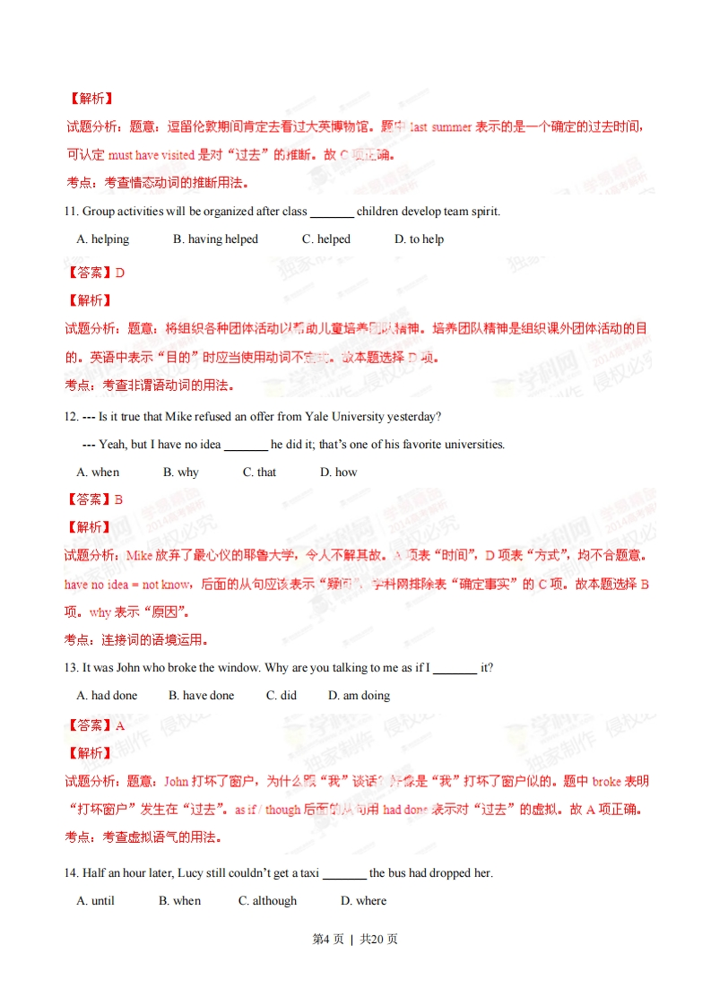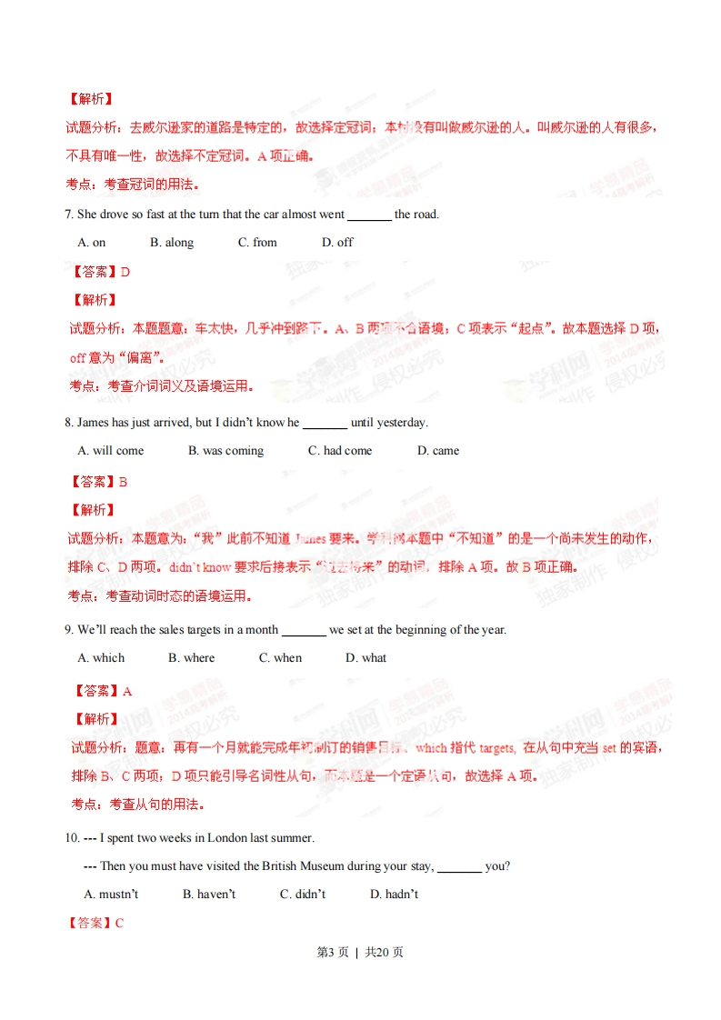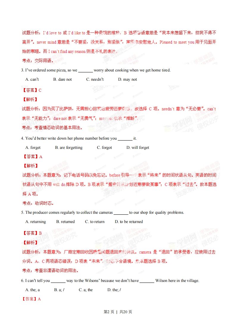 2014年普通高等学校招生全国统-考试(重庆卷))英话试达港英语试题卷共10页。满分120分。考试时间100分钟。注意事项:1.答题前,务必将自己的姓名、准考证号填写在答题卡规定的位置上。2.答选择题时,必须使用2B铅笔将答题卡上对应题目的答案标号涂黑。如需改动,用橡皮擦擦干净后,再选涂其它答案标号。3.答非选择题时,必须使用0.5毫米黑色签字笔,将答案书写在答题卡规定的位置上。4.所有题目必须在答题卡上作答,在试题卷上答题无效。5.考试结束后,将试题卷和答题卡一并交回。一、单项填空(共15小题:每题1分,满分15分)请从A、B、C、D四个选项中,选出可以填入空白处的最佳选项,并在答题卡上将该选项的标号涂黑。例:A computer can only doyou have instructed it to do.A.howB.afterC.whatD.when答案是C。1.A smile costsbut gives much.A.anythingB.somethingC.nothingD.everything【答案】C【解析】试题分析:句意:微笑是无需付出任何成本的。该句中的t一词构成前后语义矛盾,“微笑不花钱,但却给予他人很多。nothing与much形成语义对比.学升网故本题选标C项。cost nothing意为“无需付出”。考点:考查代词的用法。2.---Why not stay here a little longer?but I really have to go.A.Never mind B.I'd love to C.Pleased to meet you D.I can't find any reason【答案】B【解析】第1页|共20页试题分析:I'd1 ove to或Id1 ike to是一种委婉的推辞,B选项台语意思是“我本来想留下来,但我不得不离开”。never mind意思是“不要紧,没关系,别紧张”,常开来安慰他人。Pleased to meet you用于见面开始的寒暄。而Ican't find any reason则是不礼的表达.考点:交际用语。3.I've ordered some pizza,so weworry about cooking when we get home tired.A.can'tB.dare notC.needn'tD.may not【答案】C【解析】试题分析:因为买了比萨饼,无需担心回家后疲劳还要敛饭.放选择C项。needn't意为“无必要”。can't表示“无能力”,dare not表示“无勇气”,mi0.尝示“推断”考点:考查情态动词的基本用法。侵权必4.You'd better write down her phone number before youit.A.forgetB.are forgettingC.forgotD.will forget【答案】A【解析】试题分析:本题意为:记下电话号码以免忘记.before引导个表示“将来”的时间状语从句。英语的时间状语从句中不用1do.排除D项。B项表示“据宇排*,计划近期要做某事”,C项表示“过去”。故本题选择A项。考点:动词时态。5.The producer comes regularly to collect the camerasto our shop for quality problems.A.returningB.retumedC.to returnD.to be returned【答案】B【解析】试题分析:本题意为:厂商定期回收因质可题退回来的凯。cama是“退回”的承受者,应使用过去分词。A、C两项语态错误,D项表“未来”,时远不合语境。本题选择B项。考点:考查非谓语动词的用法。6.I can't tell youway to the Wilsons'because we don't haveWilson here in the village.A.the;aB.a:/C.a;theD.the;/【答案】A第2页|共20页【解析】试题分析:去威尔逊家的道路是特定的,故选择定冠词:本村没有叫做威尔逊的人。叫威尔逊的人有很多,不具有唯一性,故选择不定冠词。A项正确。考点:考查冠词的用法。7.She drove so fast at the tumn that the car almost wentthe road.A.onB.alongC.fromD.off【答案】D【解析】试题分析:本题题意:车太快,几乎冲到路下。A、B两项不台语境:C项表示“起点”。故本题选择D项,off意为“偏离”。考点:考查介词词义及语境运用。侵权必8.James has just arrived,but I didn't know heuntil yesterdayA.will comeB.was comingC.had comeD.came【答案】B【解析】试题分析:本题意为:“我”此前不知道山s要来.学利%本题中“不知道”的是一个尚未发生的动作,排除C、D两项。did血'tmow要求后接表示“去来”的动词,排除A项。故B项正确。考点:考查动词时态的语境运用。9.We'll reach the sales targets in a monthwe set at the beginning of the year.A.whichB.whereC.whenD.what【答案】A【解析】试题分析:题意:再有一个月就能完成年初订的销售日行.which指代targets,在从句中充当st的宾语,排除B、C两项;D项只能引导名词性从句,而本是一个定语从可,故选择A项。考点:考查从句的用法。10.---I spent two weeks in London last summer.---Then you must have visited the British Museum during your stay,you?A.mustn'tB.haven'tC.didn'tD.hadn't【答案】C第3页|共20页
