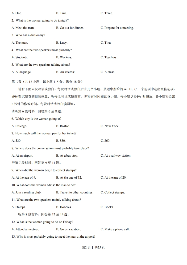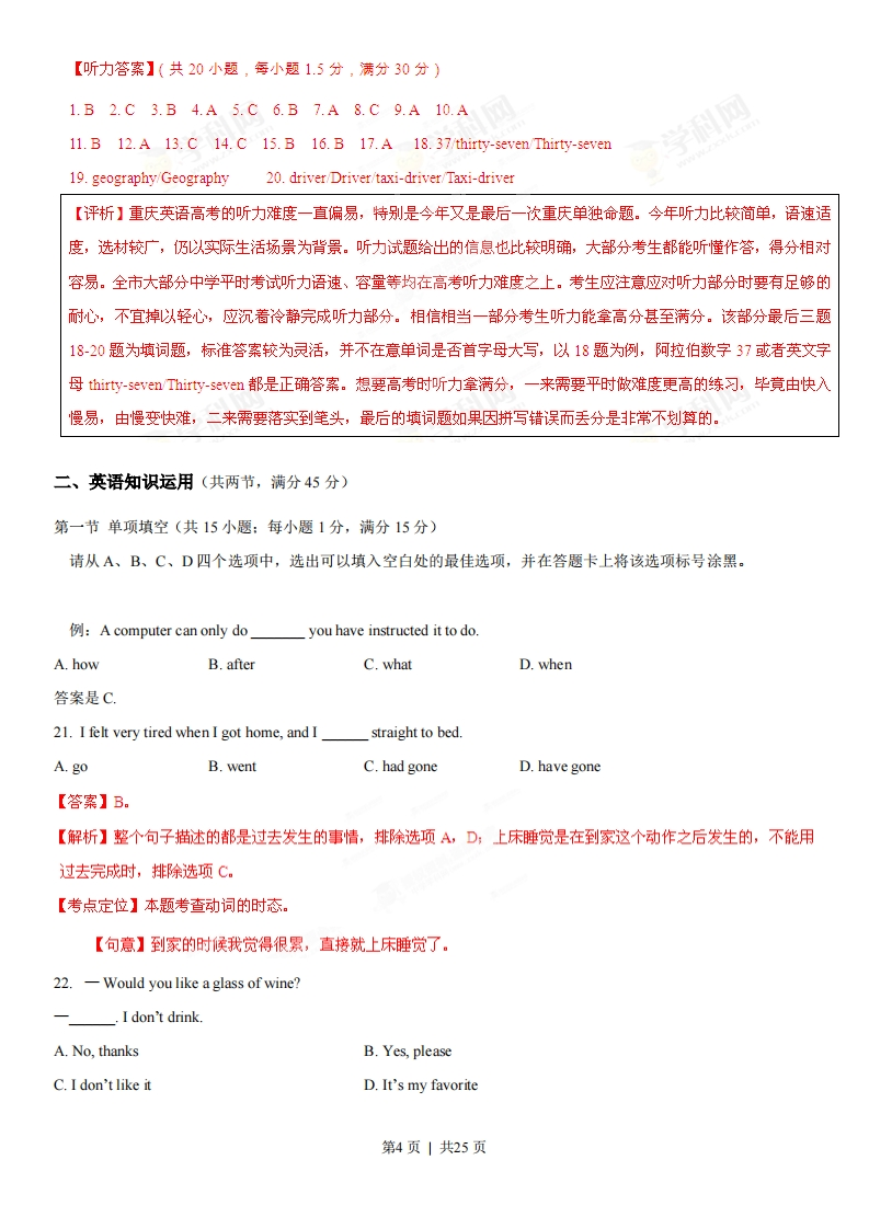 2013年高考重庆卷解析(精编版)本试题卷共15页。满分150分。考试时间120分钟。【总评】2013年的英语试题题量略有增加,但客观题难度略有下降。试题更加贴近学生的生活,整体给人温暖清新的感觉。如第一篇完型填空描述一名学生从落后到进步的过程第二篇完型填空讲身体与情绪的关系。作文则是要求学生写一封信,体现父母和子女的沟通。试题也有很鲜明的时代特征,引导学生关注家事国事天下事。比如作文中的亲情和对环保的关注,而第二个作文中书信又结合当今中国的环保现状和建设生态文明的目标。几篇阅读题题材新颗,趣味性强,既有说明文,也有分析英国人为什么喜欢谈论天气的文化类文章,各种题型搭配均匀,但压轴题最后一篇阅读的难度比往年略小。总的来说,今年听力比较简单,语速适度,选材较广,仍以实际生活场景为背景。听力试题给出的信息也比较明确,大部分考生都能听懂作答,得分相对容易。不过,今年英语完型填空的单词数略有增加。往年文章的词数在300词左右,但今年两篇完形填空总共有380个单词,这就对考生阅读速度提出了更高的要求。注意事项:1.答题前,务必将自己的姓名、准考证号填写在答题卡规定的位置上。2.答选择题时,必须用2B铅笔把答题卡上对应题目的答案标号涂黑。如需改动,用橡皮擦干净后,再选涂其他答案的标号。3.答非选择题时,必须使用0.5毫米的黑色墨水签字笔,将答案书写在答题卡规定的位置上。4.所有题目必须在答题卡上作答,在试题卷上答题无效。5.考试结束后,将试题卷和答题卡一并交回。一、听力(共两节,满分30分)做题时,请先将答案划在试题卷上。录音内容结束后,你将有两分钟的时间将试题卷上的答案转涂或转填到答题卡上。第一节(共5小题:每小题1.5分,满分7.5分)请听下面5段对话。每段对话后有一个小题,从题中所给的A、B、C三个选项中选出最佳选项,并标在试题卷的相应位置。听完每段对话后,你都有10秒钟的时间来回答有关小题和阅读下一小题。每段对话仅读一遍。例:How much is the shirt?A.£19.15.B.£9.15.C.£9.18答案是B。1.How many sisters does the woman have?第1页|共25页A.One.B.Two.C.Three.2.What is the woman going to do tonight?A.Meet the man.B.Go out for dinner.C.Prepare for a meeting.3.Who has a dictionary?A.The man.B.Lucy.C.Tina.4.What are the two speakers most probably?A.Students.B.Workers.C.Teachers.5.What are the two speakers talking about?A.A language.B.An interest.C.A class.第二节(共12小题:每小题1.5分,满分18分)请听下面4段对话或独白。每段对话或独白后有几个小题,从题中所给的A、B、C三个选项中选出最佳选项,并标在试题卷的相应位置。听每段对话或独白前,你将有时间阅读各小题,每小题5秒钟:听完后,各小题将给出5秒钟的作答时间。每段对话或独白读两遍。请听第6段材料,回答第6至8题。6.Which city is the woman going to?A.Chicago.B.Boston.C.New York.7.How much will the woman pay for her ticket?A.$30.B.$50C.$60.8.Where does the conversation most probably take place?A.At an airport.B.At a bus stop.C.At a railway station.听第7段材料,回答第9至11题。9.When did the woman begin to collect stamps?A.At the age of 9.B.At the age of 12.C.At the age of 20.10.What does the woman advise the man to do?A.Join a reading club.B.Travel to other countriesC.Collect stamps.11.What are the two speakers mainly talking about?A.Stamps.B.Hobbies.C.Books.听第8段材料,回答第12至14题。12.What is the woman going to do on Friday?A.Attend a meeting.B.Go on vacation.C.Make a phone call.13.Who is most probably going to meet the man at the airport?第2页|共25页A.The woman.B.The man's brother.C.The woman's sister.14.What is the possible relationship between the two speakers?A.Parent and teacher.B.Brother and sister.C.Husband and wife听第9段材料,回答第15至17题。15.At what time are they leaving for the Natural Museum?A.7:30a.mB.8:30a.mC.3:30p.m16.What will they possibly do right before supper?A.Swim at the beach.B.Do some shopping.C.See an exhibition.17.What is the speaker mainly talking about?A.An arrangement for a day.B.An introduction to a place.C.An experience of culture.第三节(共3小题:每小题1.5分,满分4.5)请听下面一段独白,用所听到的独白中的词或数填空,每空限填一个词或一个数。填入的内容写在答题卡相应位置上,在听本段独白前,你将有时间阅读各小题,每小题5秒钟:听完后,各小题将给出5秒钟的作答时间,本段独白读两遍。请听第10段材料,回答第18至20题。Introduction to CompetitorsNameAgeOccupationStrengthsPeter Smith18EngineerArt and literatureTom Anderson28Salesman19 and historyJack Brown3620Language and culture第3页|共25页