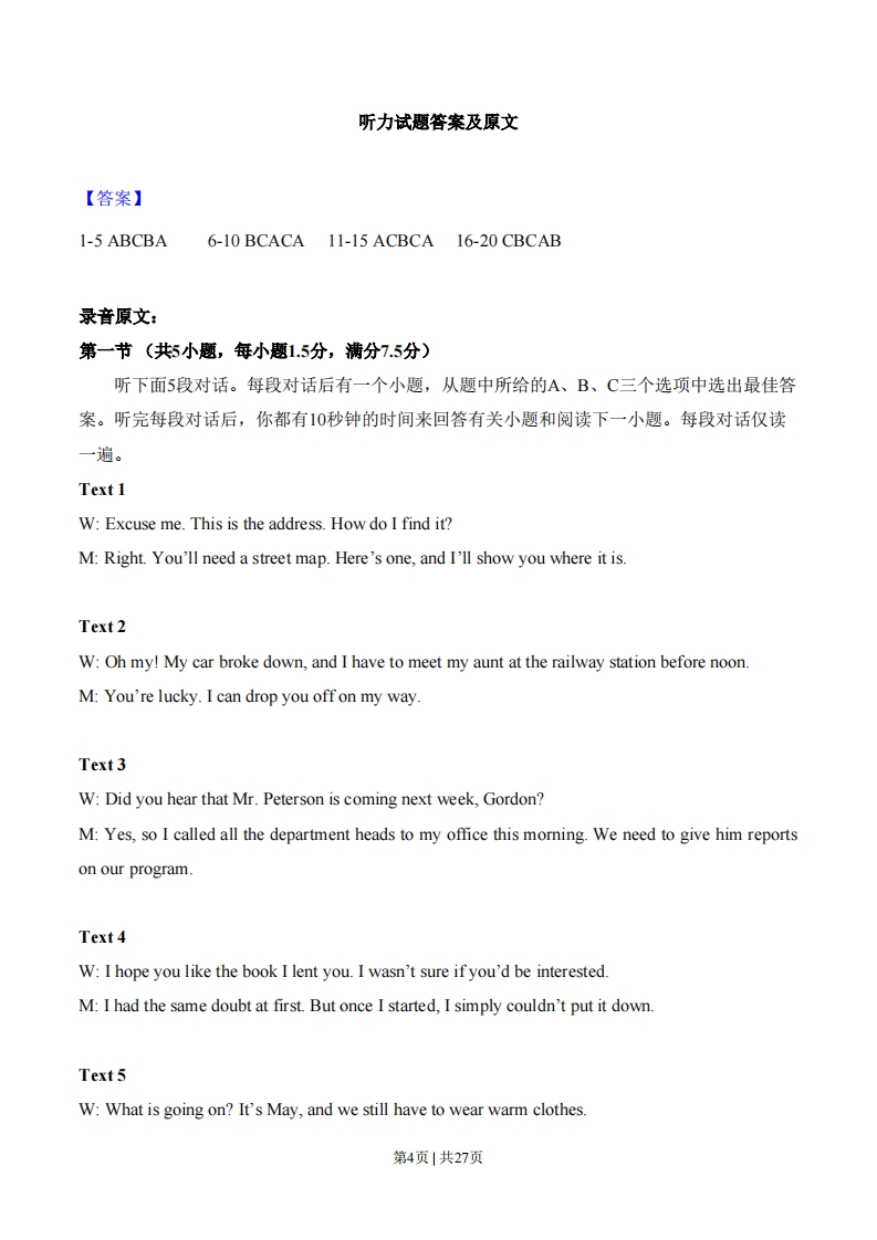 2014普通高等学校招生全国统一考试(辽宁卷)英语第一部分听力(共两节,满分30分)做题时,先将答案标在试卷上,录音结束后,你将有两分钟的时间将试卷上的答案转涂到答题卡上。第一节(共5小题,每小题1.5分,满分7.5分)听下面5段对话。每段对话后有一个小题,从题中所给的A、B、C三个选项中选出最佳答案。听完每段对话后,你都有10秒钟的时间来回答有关小题和阅读下一小题。每段对话仅读一遍。例:How much is the shirt?A.£19.15B.f9.18C.9.15.答案是C1.What does the woman want to do?A.Find a place.B.Buy a map.C.Get an address.2.What will the man do for the woman?A.Repair her car.B.Give her a ride.C.Pick up her aunt.3.Who might Mr.Peterson be?A.A new professor.B.A department head.C.A company director.4.What does the man think of the book?A.Quite difficult.B.Very interesting.C.Too simple.5.What are the speakers talking about?A.Weather.B.Clothes.C.News.第二节(共15小题:每小题1.5分,满分22.5分)听下面5段对话或独白。每段对话或独白后有几个小题,从题中所给的A、B、C三个选项中选出最佳选项,并标在试卷的相应位置。听每段对话或独白前,你将有时间阅读各个小题,每小题5秒钟:听完后,各小题将给出5秒钟的作答时间。每段对话或独白读两遍。听第6段材料,回答6、7题。6.Why is Harry unwilling to join the woman?第1页1共27页A.He has a pain in his knee.B.He wants to watch TV.C.He is too lazy.7.What will the woman probably do next?A.Stay at home.B.Take Harry to hospital.C.Do some exercise.听第7段材料,回答第8、9题。8.When will the man be home from work?A.At5:45.B.At6:15.C.At6:50.9.Where will the speakers go?A.The Green House Cinema.B.The New State Cinema.C.The UME Cinema.听第8段材料,回答第10至12题。10.How will the speakers go to New York?A.By air.B.By taxi.C.By bus.11.Why are the speakers making the trip?A.For business.B.For shopping.C.For hoilday.12.What is the probable relationship between the speakers?A.Driver and passenger.B.Husband and wife.C.Fellow workers.听第9段材料,回答第13至16题。13.Where does this conversation probably take place?A.In a restaurant.B.In an office.C.In a classroom.14.What does John do now?A.He's a trainer.B.He's a tour guide.C.He's a college student.15.How much can a new person earn for the first year?A.$10,500.B.$12,000.C.$15,00016.How many people will the woman hire?A.Four.B.Three.C.Two.第2页|共27页听第10段材料,回答第17至20题。17.How long has the speaker lived in a big city?A.One year.B.Ten years.C.Eighteen years18.What is the speaker's opinion on public transport?A.It's comfortable.B.It's time-saving.C.It's cheap.19.What is good about living in a small town?A.It's safer.B.It's healthier.C.It's more convenient.20.What kind of life does the speaker seem to like most?A.Busy.B.Colorful.C.Quiet.第3页1共27页