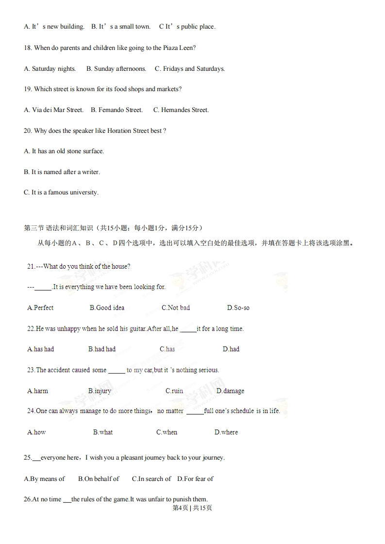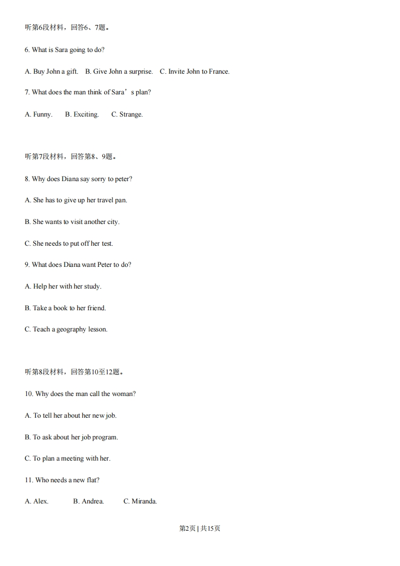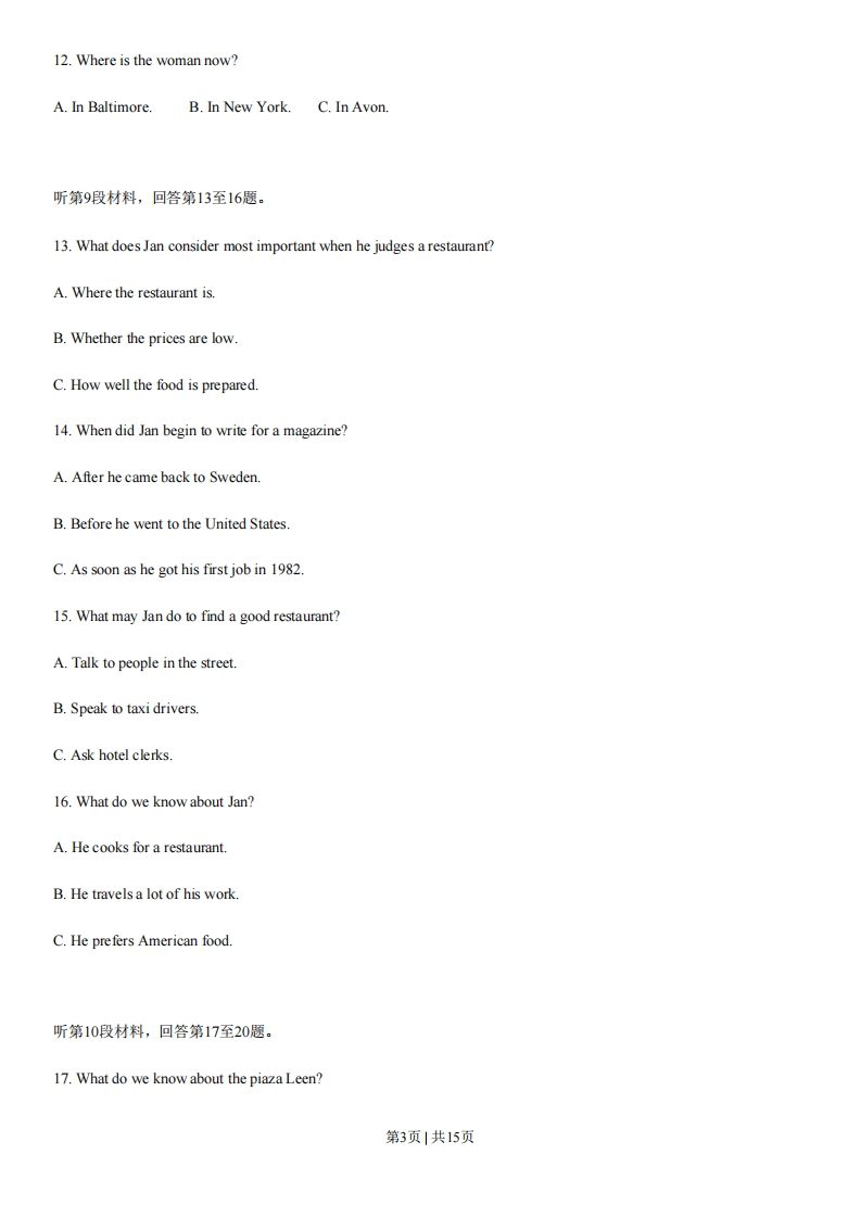 2013年辽宁英语卷原卷(精编版)第一部分听力(共两节,满分30分)做题时,先将答案标在试卷上,录音结束后,你将有两分钟的时间将试卷上的答案转涂到答题卡上。第一节(共5小愿,每小题15分,满分7.5分)听下面5段对话。每段对话后有一个小题,从题中所给的A、B、C三个选项中选出最佳答案。听完每段对话后,你都有10秒钟的时间来回答有关小题和阅读下一小题。每段对话仅读一遍。例:How much is the shirt?A£19.15.B.f9.18.C.9.15.答案是C.1.What does the man want to do?A.Take photos.B.Buy a camera.C.Help the woman.2.What are the speakers talking about?A.A noisy night.B.Their life in town.C.A place of living.3.Where is the man now?A.On his way.B.In a restaurant.C.At home4.What will Celia do?A.Find a player.B.Watch a game.C.Play basketball.5.What day is it when the conversation takes place?A.Saturday.B.Sunday.C.Monday.第二节(共15小题:每小题1.5分,满分22.5分)听下面5段对话或独白。每段对话或独白后有几个小题,从题中所给的A、B、C三个选项中选出最佳选项,并标在试卷的相应位置。听每段对话或独白前,你将有时间阅读各个小题,每小题5秒钟:听完后,个小题将给出5秒钟的作答时间。每段对话或独白读两遍。第1页|共15页听第6段材料,回答6、7题。6.What is Sara going to do?A.Buy John a gift.B.Give John a surprise.C.Invite John to France.7.What does the man think of Sara's plan?A.Funny.B.Exciting.C.Strange.听第7段材料,回答第8、9题。8.Why does Diana say sorry to peter?A.She has to give up her travel pan.B.She wants to visit another city.C.She needs to put off her test.9.What does Diana want Peter to do?A.Help her with her study.B.Take a book to her friend.C.Teach a geography lesson.听第8段材料,回答第10至12题.10.Why does the man call the woman?A.To tell her about her new job.B.To ask about her job program.C.To plan a meeting with her.11.Who needs a new flat?A.Alex.B.Andrea.C.Miranda.第2页|共15页12.Where is the woman now?A.In Baltimore.B.In New York.C.In Avon.听第9段材料,回答第13至16题.13.What does Jan consider most important when he judges a restaurant?A.Where the restaurant is.B.Whether the prices are low.C.How well the food is prepared.14.When did Jan begin to write for a magazine?A.After he came back to Sweden.B.Before he went to the United States.C.As soon as he got his first job in 1982.15.What may Jan do to find a good restaurant?A.Talk to people in the street.B.Speak to taxi drivers.C.Ask hotel clerks.16.What do we know about Jan?A.He cooks for a restaurant.B.He travels a lot of his work.C.He prefers American food.听第10段材料,回答第17至20题。17.What do we know about the piaza Leen?第3页1共15页