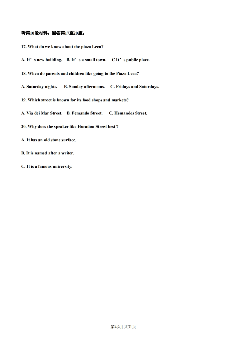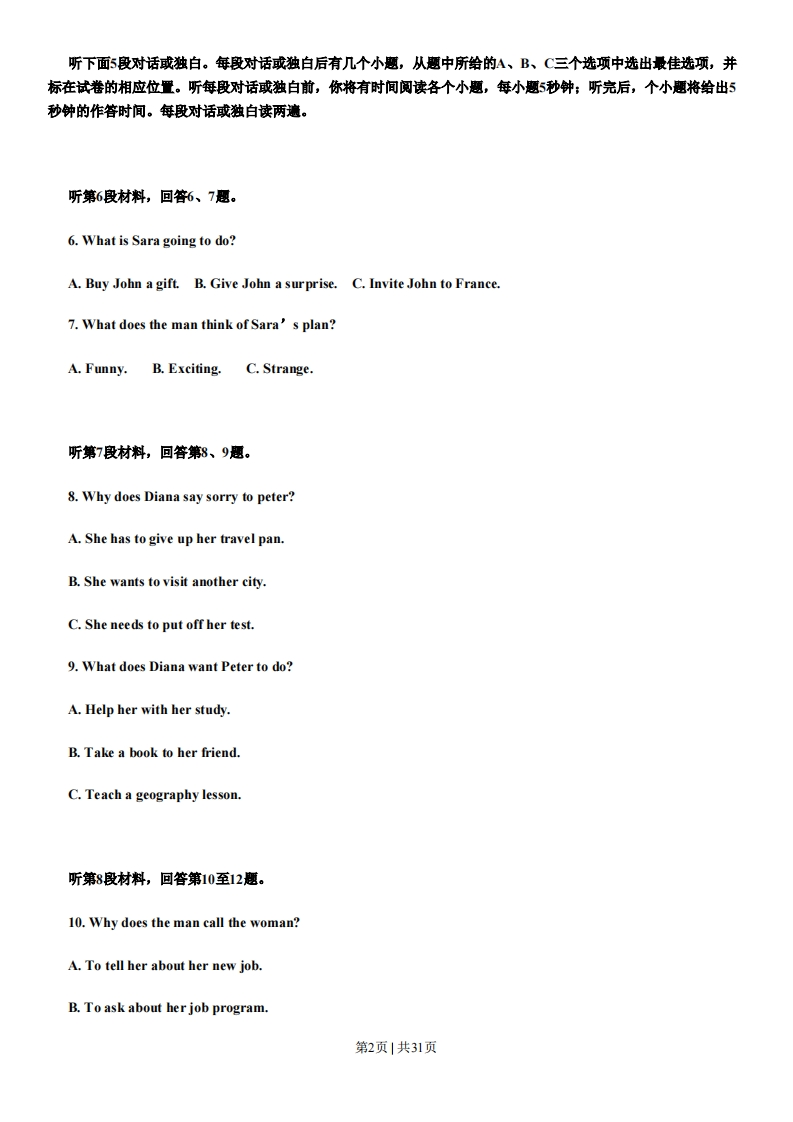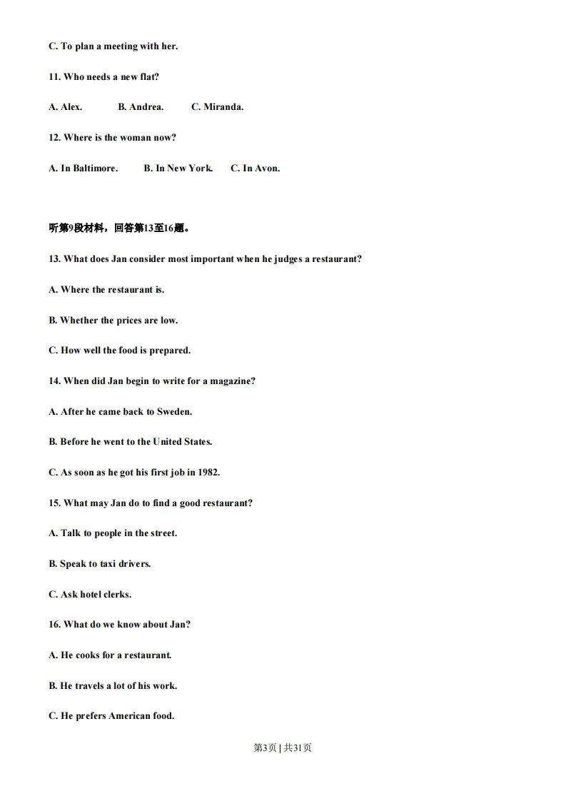 2013年辽宁英语卷(精编版)第一部分听力(共两节,满分30分)做题时,先将答案标在试卷上,录音结束后,你将有两分钟的时间将试卷上的答案转涂到答题卡上。第一节(共5小题,每小题15分,满分7.5分)听下面5段对话。每段对话后有一个小思,从题中所给的A、B、C三个选项中选出最佳答案。听完每段对话后,你都有10秒钟的时间来回答有关小题和阅读下一小题。每段对话仅读一遍。例:How much is the shirt?A.£19.15.B.9.18.C.9.15.答案是C.1.What does the man want to do?A.Take photos.B.Buy a camera.C.Help the woman.2.What are the speakers talking about?A.A noisy night.B.Their life in town.C.A place of living.3.Where is the man now?A.On his way.B.In a restaurant.C.At home4.What will Celia do?A.Find a player.B.Watch a game.C.Play basketball.5.What day is it when the conversation takes place?A.Saturday.B.Sunday.C.Monday.第二节(共15小题:每小题15分,满分22.5分)第1页|共31页听下面5段对话或独白。每段对话或独白后有几个小题,从题中所给的A、B、C三个选项中选出最佳选项,并标在试卷的相应位置。听每段对话或独白前,你将有时间阅读各个小题,每小题5秒钟;听完后,个小题将给出5秒钟的作答时间。每段对话或独白读两遗。听第6段材料,回答6、7思。6.What is Sara going to do?A.Buy John a gift.B.Give John a surprise.C.Invite John to France.7.What does the man think of Sara's plan?A.Funny.B.Exciting.C.Strange.听第7段材料,回答第8、9题。8.Why does Diana say sorry to peter?A.She has to give up her travel pan.B.She wants to visit another city.C.She needs to put off her test.9.What does Diana want Peter to do?A.Help her with her study.B.Take a book to her friend.C.Teach a geography lesson.听第8段材料,回答第10至12题。10.Why does the man call the woman?A.To tell her about her new job.B.To ask about her job program.第2页|共31页C.To plan a meeting with her.11.Who needs a new flat?A.Alex.B.Andrea.C.Miranda.12.Where is the woman now?A.In Baltimore.B.In New York.C.In Avon.听第9段材料,回答第13至16题。13.What does Jan consider most important when he judges a restaurant?A.Where the restaurant is.B.Whether the prices are low.C.How well the food is prepared.14.When did Jan begin to write for a magazine?A.After he came back to SwedenB.Before he went to the United States.C.As soon as he got his first job in 1982.15.What may Jan do to find a good restaurant?A.Talk to people in the street.B.Speak to taxi drivers.C.Ask hotel clerks.16.What do we know about Jan?A.He cooks for a restaurant.B.He travels a lot of his work.C.He prefers American food.第3页1共31页
