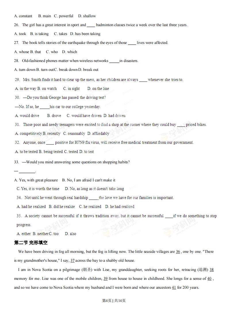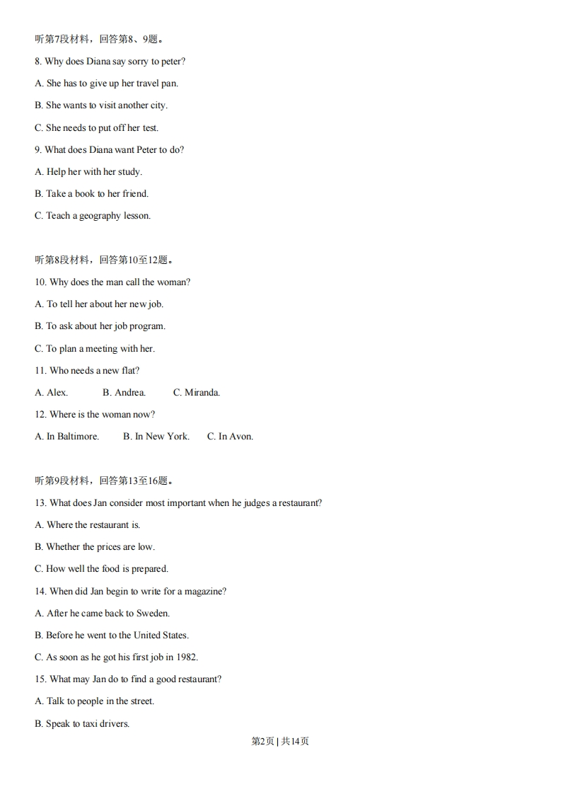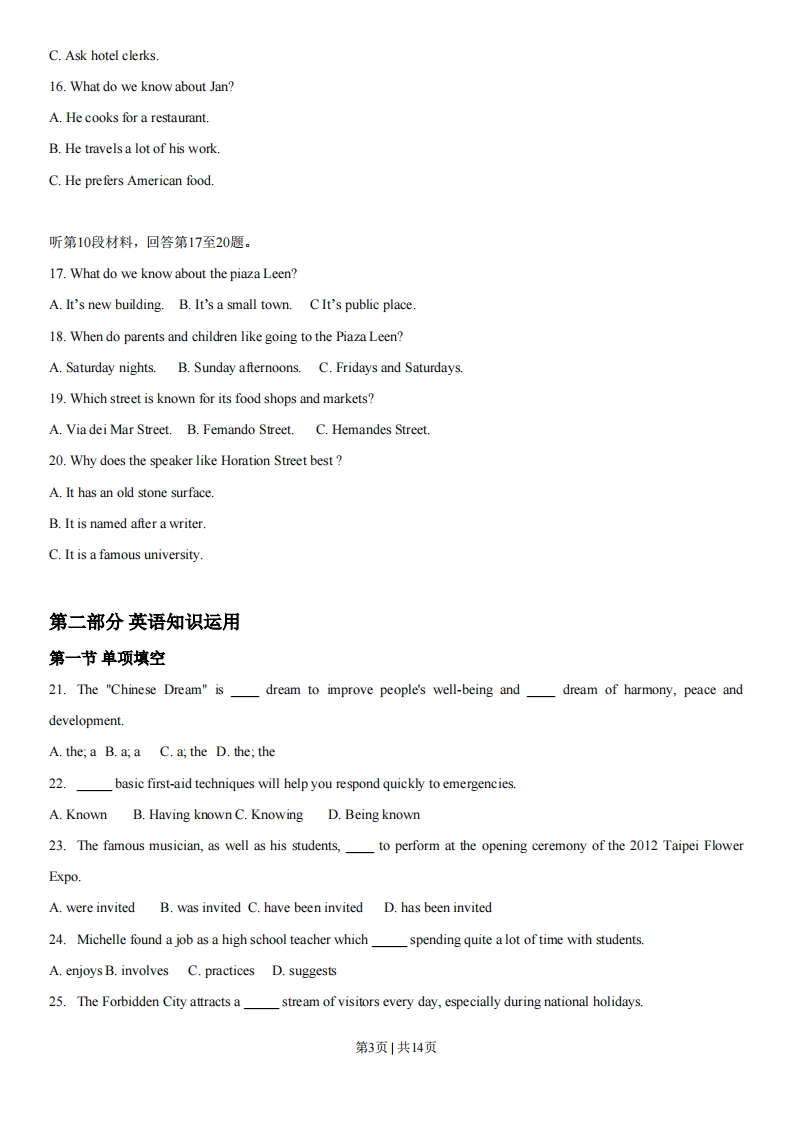 2013年高考福建省英语试题原卷(精编版)第一部分听力(共两节,满分30分)做题时,先将答案标在试卷上,录音结束后,你将有两分钟的时间将试卷上的答案转涂到答题卡上。第一节(共5小题,每小题15分,满分7.5分)听下面5段对话。每段对话后有一个小题,从题中所给的A、B、C三个选项中选出最佳答案。听完每段对话后,你都有10秒钟的时间来回答有关小题和阅读下一小题。每段对话仅读一遍。例:How much is the shirt?A.£19.15.B.f9.18.C.f9.15.答案是C1.What does the man want to do?A.Take photos.B.Buy a camera.C.Help the woman.2.What are the speakers talking about?A.A noisy night.B.Their life in town.C.A place of living.3.Where is the man now?A.On his way.B.In a restaurant.C.At home4.What will Celia do?A.Find a player.B.Watch a game.C.Play basketball.5.What day is it when the conversation takes place?A.SaturdayB.Sunday.C.Monday.第二节(共15小题:每小题15分,满分22.5分)听下面5段对话或独白。每段对话或独白后有几个小题,从题中所给的A、B、C三个选项中选出最佳选项,并标在试卷的相应位置。听每段对话或独白前,你将有时间阅读各个小题,每小题5秒钟:听完后,个小题将给出5秒钟的作答时间。每段对话或独白读两遍。听第6段材料,回答6、7题。6.What is Sara going to do?A.Buy John a gift.B.Give John a surprise.C.Invite John to France.7.What does the man think of Sara's plan?A.Funny.B.Exciting.C.Strange.第1页|共14页听第7段材料,回答第8、9题。8.Why does Diana say sorry to peter?A.She has to give up her travel pan.B.She wants to visit another city.C.She needs to put off her test.9.What does Diana want Peter to do?A.Help her with her study.B.Take a book to her friend.C.Teach a geography lesson.听第8段材料,回答第10至12题。10.Why does the man call the woman?A.To tell her about her new job.B.To ask about her job program.C.To plan a meeting with her.11.Who needs a new flat?A.Alex.B.Andrea.C.Miranda.12.Where is the woman now?A.In Baltimore.B.In New York.C.In Avon.听第9段材料,回答第13至16题。13.What does Jan consider most important when he judges a restaurant?A.Where the restaurant is.B.Whether the prices are low.C.How well the food is prepared.14.When did Jan begin to write for a magazine?A.After he came back to Sweden.B.Before he went to the United States.C.As soon as he got his first job in 198215.What may Jan do to find a good restaurant?A.Talk to people in the street.B.Speak to taxi drivers.第2页|共14页C.Ask hotel clerks.16.What do we know about Jan?A.He cooks for a restaurantB.He travels a lot of his work.C.He prefers American food.听第10段材料,回答第17至20题。17.What do we know about the piaza Leen?A.It's new building.B.It's a small town.C It's public place.18.When do parents and children like going to the Piaza Leen?A.Saturday nights.B.Sunday afternoons.C.Fridays and Saturdays.19.Which street is known for its food shops and markets?A.Via dei Mar Street.B.Femando Street.C.Hemandes Street.20.Why does the speaker like Horation Street best?A.It has an old stone surface.B.It is named after a writer.C.It is a famous university.第二部分英语知识运用第一节单项填空21.The "Chinese Dream"is dream to improve people's well-being and dream of harmony,peace anddevelopment.A.the;a B.a;a C.a;the D.the;the22.basic first-aid techniques will help you respond quickly to emergencies.A.Known B.Having known C.Knowing D.Being known23.The famous musician,as well as his students,to perform at the opening ceremony of the 2012 Taipei FlowerExpo.A.were invited B.was invited C.have been invited D.has been invited24.Mich