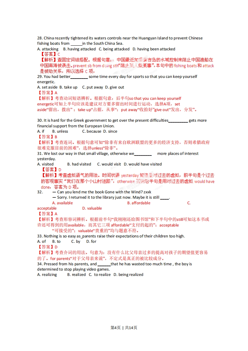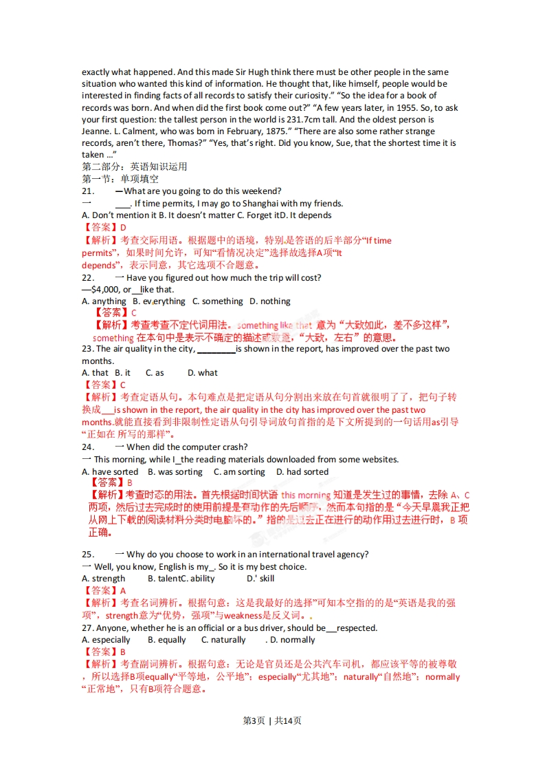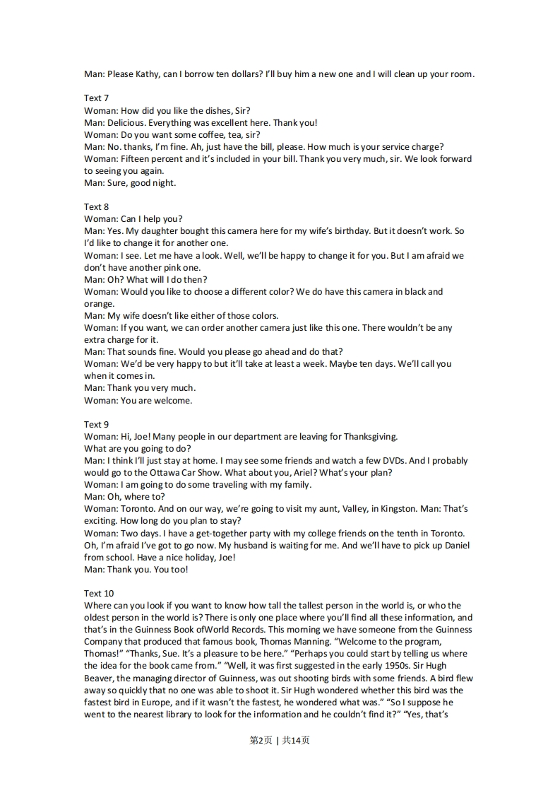 2012年普通高等学校招生全国统一考试(福建卷)英语听力试题答案及原文【答案】1.C2.A3.B4.C5.A6.C7.B8.B9.C10.C11.A12.B13.B14.A15.A16.B17.A18.A19.C20.A听力原文第一节(共5小题,每小题1.5分,满分7.5分)听下面5段对话。每段对话后有一个小题,从题中所给的A、B、C三个选项中选出最佳答案。听完每段对话后,你都有10秒钟的时间来回答有关小题和阅读下一小题。每段对话仅读一遍。Text 1Man:Excuse me,Madam?Woman:Yes?Man:How long can I keep the book?Woman:For one month.Please make sure you retum the book before it's due.Text 2Man:Hurry up,Jenny.It's already seven.We'll be late for the film.Woman:Don't worry dear,we still have twenty minutes.And it takes us only fifteen minutes toget there.We'll be there just in time.Text 3Man:I heard on the radio that it'll be sunny during the holiday weekend.Maybe wecan take a trip to Boston.Woman:That sounds great.I'll call Jean to see if she likes to join us.Text 4Woman:It's nearly eight.If you want to catch the nine o'clock train,you'd better go now.Man:Don't worry.I'll drive to the station.Woman:In that case,let me go with you.And you drop me off at the city center.I'll go to theopen market.Text 5Woman:I'm sorry,the cake is late.We'll do better next time,I promise.Man:Well,I'm sorry too.You have to take it back.The birthday party is over and wedon't need the cake any more.第二节(共15小题:每小题1.5分,满分22.5分)听下面5段对话或独白。每段对话或独白后有几个小题,从题中所给的A、B、C三个选项中选出最佳选项,并标在试卷的相应位置。听每段对话或独白前,你将有时间阅读各个小题,每小题5秒钟:听完后,个小题将给出5秒钟的作答时间。每段对话或独白读两遍。Text 6Woman:Oh,it's broken!Jacky is not going to be happy when he sees this.It's his favorite CD!He'll tell mum.第1页|共14页Man:Please Kathy,can I borrow ten dollars?I'll buy him a new one and I will clean up your roomText 7Woman:How did you like the dishes,Sir?Man:Delicious.Everything was excellent here.Thank you!Woman:Do you want some coffee,tea,sir?Man:No.thanks,I'm fine.Ah,just have the bill,please.How much is your service charge?Woman:Fifteen percent and it's included in your bill.Thank you very much,sir.We look forwardto seeing you again.Man:Sure,good night.Text 8Woman:Can I help you?Man:Yes.My daughter bought this camera here for my wife's birthday.But it doesn't work.SoI'd like to change it for another one.Woman:I see.Let me have a look.Well,we'll be happy to change it for you.But I am afraid wedon't have another pink one.Man:Oh?What will I do then?Woman:Would you like to choose a different color?We do have this camera in black andorange.Man:My wife doesn't like either of those colors.Woman:If you want,we can order another camera just like this one.There wouldn't be anyextra charge for it.Man:That sounds fine.Would you please go ahead and do that?Woman:We'd be very happy to but it'll take at least a week.Maybe ten days.We'll call youwhen it comes in.Man:Thank you very much.Woman:You are welcome.Text 9Woman:Hi,Joe!Many people in our department are leaving for Thanksgiving.What are you going to do?Man:I think I'll just stay at home.I may see some friends and watch a few DVDs.And I probablywould go to the Ottawa Car Show.What about you,Ariel?What's your plan?Woman:I am going to do some traveling with my family.Man:Oh,where to?Woman:Toronto.And on our way,we'