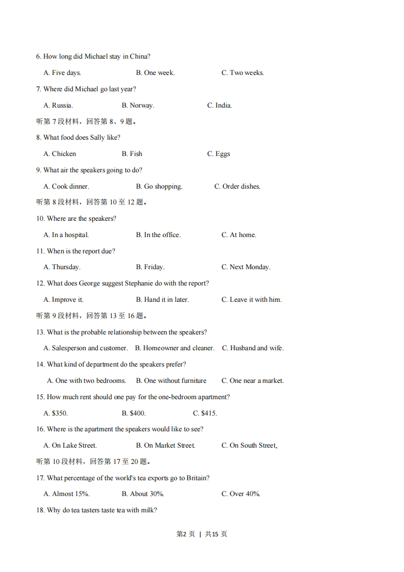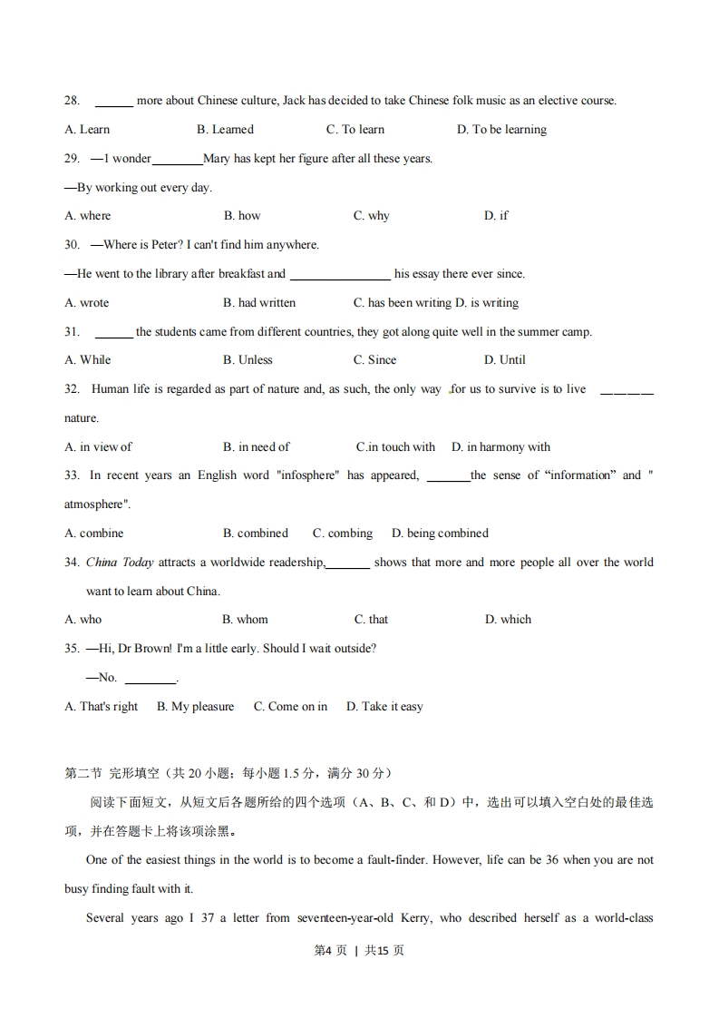 2015年普通高等学校招生全国统一考试〔福建卷)英语本试卷分为四个部分,共12页。时量120分钟。满分150分第卷第一部分听力(共两节,满分30分)回答听力部分时,请先将答案标在试卷上。听力部分结束前,你将有两分钟的时间将你的答案转涂到客观题答题卡上。第一节(共5小题:每小题1.5分,满分7.5分)听下面5段对话。每段对话后有一个小题,从题中所给的A、B、C三个选项中选出最佳选项,并标在试卷的相应位置。听完每段对话后:你都有10秒钟的时间来回答有关小题和阅读下一小题。每段对话仅读一遍。例:How much is the shirt?A.£19.15.B.£9.15.C.£9.18.答案是C。1.What time is it now?A.9:10.B.9:50C.10:002.What does the woman think of the weather?A.It's nice.B.It's warm.C.It's cold.3.What will the man do?A.Attend a meeting.B.Give a lecture.C.Leave his office.4.What is the woman's opinion about the course?A.Too hard.B.Worth taking.C.Very easy.5.What does the woman want the man to do?A.Speak louder.B.Apologize to her.C.Tumn off the radio.第二节(共15小题:每小题1.5分,满分22.5分)听下面5段对话。每段对话后有几个小题,从题中所给的A、B、C三个选项中选出最佳选项,并标在试卷的相应位置。听每段对话前,你将有时间阅读各个小题,每小题5秒钟:听完后,各小题给出5秒钟的作答时间。每段对话读两遍。听第6段材料,回答第6、7题。第1页|共15页6.How long did Michael stay in China?A.Five daysB.One week.C.Two weeks.7.Where did Michael go last year?A.Russia.B.Norway.C.India.听第7段材料,回答第8、9题。8.What food does Sally like?A.ChickenB.FishC.Eggs9.What air the speakers going to do?A.Cook dinner.B.Go shoppingC.Order dishes.听第8段材料,回答第10至12题。10.Where are the speakers?A.In a hospital.B.In the office.C.At home.11.When is the report due?A.Thursday.B.Friday.C.Next Monday.12.What does George suggest Stephanie do with the report?A.Improve it.B.Hand it in laterC.Leave it with him.听第9段材料,回答第13至16题。13.What is the probable relationship between the speakers?A.Salesperson and customer.B.Homeowner and cleaner.C.Husband and wife.14.What kind of department do the speakers prefer?A.One with two bedrooms.B.One without furnitureC.One near a market.15.How much rent should one pay for the one-bedroom apartment?A.$350.B.$400.C.$415.16.Where is the apartment the speakers would like to see?A.On Lake StreetB.On Market Street.C.On South Street,听第10段材料,回答第17至20题。17.What percentage of the world's tea exports go to Britain?A.Almost 15%B.About 30%.C.Over 40%.18.Why do tea tasters taste tea with milk?第2页|共15页A.Most British people drink tea that way.B.Tea tastes much better with milk.C.Tea with milk is healthy19.Who suggests a price for each tea?A.Tea tasters.B.Tea exporters.C.Tea companies.20.What is the speaker talking about?A.The life of tea tasters.B.Afternoon tea in Britain.C.The London Tea Trade Centre.第二部分英语知识运用(共两节,满分45分)第一节单项填空(共15小题:每小题1分,满分15分)从A、B、C、D四个选项中,选出可以填入空白处的最佳选项,并在答题卡上将该项涂黑。It is generally considered unwise to give a childhe or she wants.A.howeverB.whateverC.whicheverD.whenever答案是B21.The research group produced two reports based on the survey,butcontainedanyusefulsuggestions.A.allB.noneC.eitherD.neither22.A common memory they all havetheir school days is the school uniform.A.ofB.onC.toD.with23.It wasof Michael to inform us of his delay in case we got worried.A.carelessB.considerateC.patientD.generous24.The failure was a bigto him,but he wasn't discouraged and soon got as enthusiastic as ever.A.blowB.issueC.excuseD.factor25.It is said that body language55 per cent of a first impression while wh