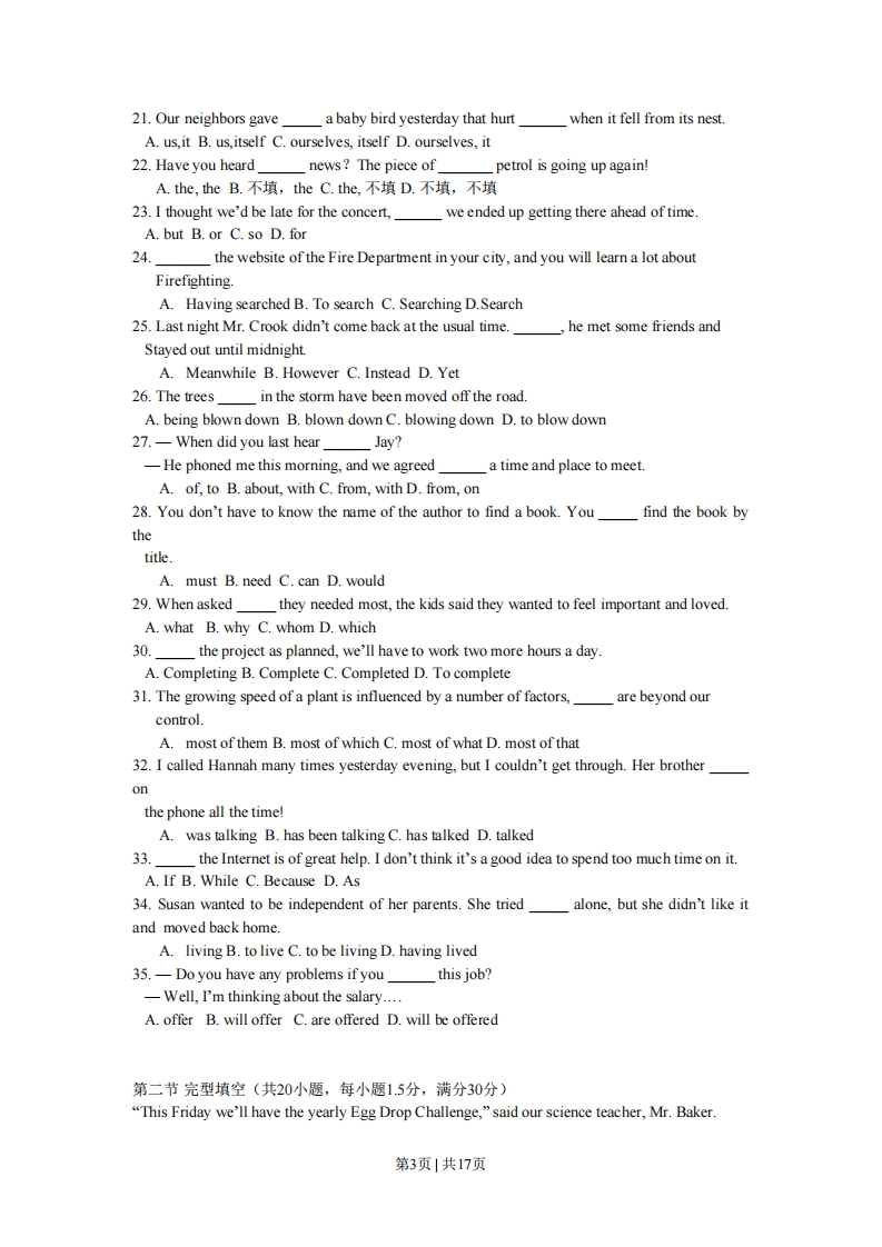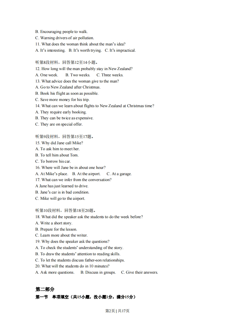2008年普通高校招生统一考试(湖南卷)第一部分听力(共两节,满分30分)做题时,先将答案标在试卷上,录音结束后,你将有两分钟的时间将试卷上的答案转涂到答题卡上。第一节(共5小题,每小题1.5分,满分7.5分)听下面5段对话。每段对话后有一个小题,从题中所给的A、B、C三个选项中选出最佳答案。听完每段对话后,你都有10秒钟的时间来回答有关小题和阅读下一小题。每段对话仅读一遍。例:How much is the shirt?A.£19.15B.f9.18C.f9.15答案是C.1.What is the weather like?A.It's raining.B.It's cloudy.C.It's sunny.2.Who will go to China next month?A.Lucy.B.Alice.C.Richard3.What are the speakers talking about?A.The man's sister.B.A film.C.An actor.4.Where will the speakers meet?A.In Room 340.B.In Room 314.C.In Room 2235.Where does the conversation most probably take place?A.In a restaurant.B.In an office.C.At home.第二节(共15小题:每小题1.5分,满分22.5分)听下面5段对话或独白,每段对话或独白后面有几个小题,从题中所给的A、B、C三个选项中选出最佳选项,并标在试卷的相应位置。听每段对话或独白前,你将有时间阅读各小题,每小题5秒钟:听完后,各小题将给出5秒钟的作答时间。每段对话或独白读两遍。听第6段材料,回答第6至8题。6.Why did the woman go to New York?A.To spend some time with the baby.B.To look after her sister.C.To find a new job.7.How old was the baby when the woman left New York?A.Two months.B.Five months.C.Seven months.8.What did the woman like doing most with the baby?A.Holding him.B.Playing with him.C.Feeding him.听第7段材料,回答第9至11题。9.What are the speakers talking about?A.A way to improve air quality.B.A problem with traffic rules.C.A suggestion for city planning.10.What does the man suggest?A.Limiting the use of cars.第1页1共17页B.Encouraging people to walk.C.Warning drivers of air pollution.11.What does the woman think about the man's idea?A.It's interesting.B.It's worth trying.C.It's impractical.听第8段材料,回答第12至14小题。12.How long will the man probably stay in New Zealand?A.One week.B.Two weeks.C.Three weeks.13.What advice does the woman give to the man?A.Go to New Zealand after Christmas.B.Book his flight as soon as possible.C.Save more money for his trip.14.What can we learn about flights to New Zealand at Christmas time?A.They require early booking.B.They can be twice as expensive.C.They are on special offer听第9段材料,回答第15至17题。15.Why did Jane call Mike?A.To ask him to meet her.B.To tell him about Tom.C.To borrow his car.16.Where will Jane be in about one hour?A.At Mike's place.B.At the airport.C.At a garage.17.What can we infer from the conversation?A Jane has just learned to drive.B.Jane's car is in bad condition.C.Mike will go to the airport.听第10段材料,回答第18至20题。18.What did the speaker ask the students to do the week before?A.Write a short story.B.Prepare for the lesson.C.Leam more about the writer.19.Why does the speaker ask the questions?A.To check the students'understanding of the story.B.To draw the students'attention to reading skills.C.To let the students discuss father-son relationships.20.What will the students do in 10 minutes?A.Ask more questions.B.Discuss in groups.C.Give their answers.第二部分第一节单项填空(共15小题,没小题1分,满分15分)第2页|共17页21.Our neighbors gave a baby bird yesterday that hurt when it fell from its nest.A.us,it B.us,itself C.ourselves,itself D.ourselves,it22.Have you heard news?The piece of petrol is going up again!A.the,theB.不填,theC.the,不填D.不填,不填23.I thought we'd be late for the concert,we ended