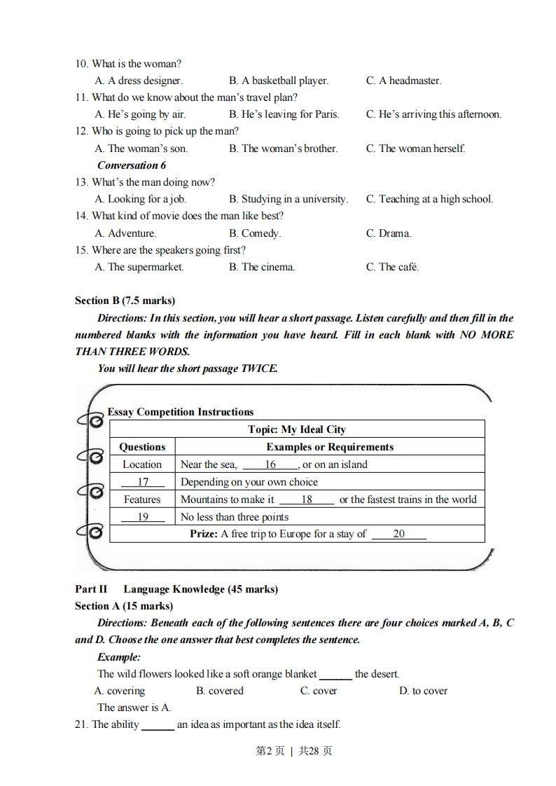 2011年高考·湖南卷英语Part I Listening Comprehension(30 marks)Section A(22.5 marks)Directions:In this section,you will hear six conversations between two speakers.For eachconversation,there are several questions and each question is followed by three choices markedA,B and C.Listen carefully and then choose the best answer for each question.You will hear each conversation TWICE.Example:When will the magazine probably arrive?A.Wednesday.B.Thursday.C.Friday.The answer is B.Conversation I1.Who used the car this morning?A.The son.B.The aunt.C.The mother.2.Where are the keys found?A.In the purse.B.In the pocket.C.In the drawer.Conversation 23.Which of the following is true about the man?A.He borrowed some moneyB.He is caught in the traffic.C.He will meet his teacher.4.How is the man going home?A.By train.B.By bus.C.By taxi.Conversation 35.When was the party held?A.In the morningB.In the afternoonC.In the evening.6.Why didn't the woman go to the party?A.She didn't feel well.B.She didn't have the time.C.She didn't get an invitation.Conversation 47.What does the man want to buy?A.A camera.B.A mobile phone.C.A music player.8.Which of the following does the man choose?A.The PE310.B.The RT230.C.The FG1609.How much does the man pay?A.$300.B.$270.C.$100Conversation 5第1页|共28页10.What is the woman?A.A dress designer.B.A basketball player.C.A headmaster.11.What do we know about the man's travel plan?A.He's going by air.B.He's leaving for Paris.C.He's arriving this afternoon.12.Who is going to pick up the man?A.The woman's son.B.The woman's brother.C.The woman herself.Conversation 613.What's the man doing now?A.Looking for a job.B.Studying in a universityC.Teaching at a high school14.What kind of movie does the man like best?A.AdventureB.ComedyC.Drama.15.Where are the speakers going first?A.The supermarket.B.The cinema.C.The cafeě.Section B(7.5 marks)Directions:In this section,you will hear a short passage.Listen carefully and then fill in thenumbered blanks with the information you have heard.Fill in each blank with NO MORETHAN THREE WORDS.You will hear the short passage TWICE.Essay Competition InstructionsTopic:My Ideal CityQuestionsExamples or RequirementsLocationNear the sea,16,or on an island17Depending on your own choiceFeaturesMountains to make it18or the fastest trains in the world19No less than three pointsPrize:A free trip to Europe for a stay of20Part II Language Knowledge(45 marks)Section A(15 marks)Directions:Beneath each of the following sentences there are four choices marked A,B,Cand D.Choose the one answer that best completes the sentence.Example:The wild flowers looked like a soft orange blanketthe desert.A.coveringB.coveredC.coverD.to coverThe answer is A.21.The ability an idea as important as the idea itself.第2页|共28页A.expressingB.expressedC.to expressD.to be expressed22.-Joan,whatin your hand?-Look!It's a birthday gift for my grandma.A.had you heldB.are you holdingC.do you holdD.will you hold23.The playersfrom the whole country are expected to bring us h