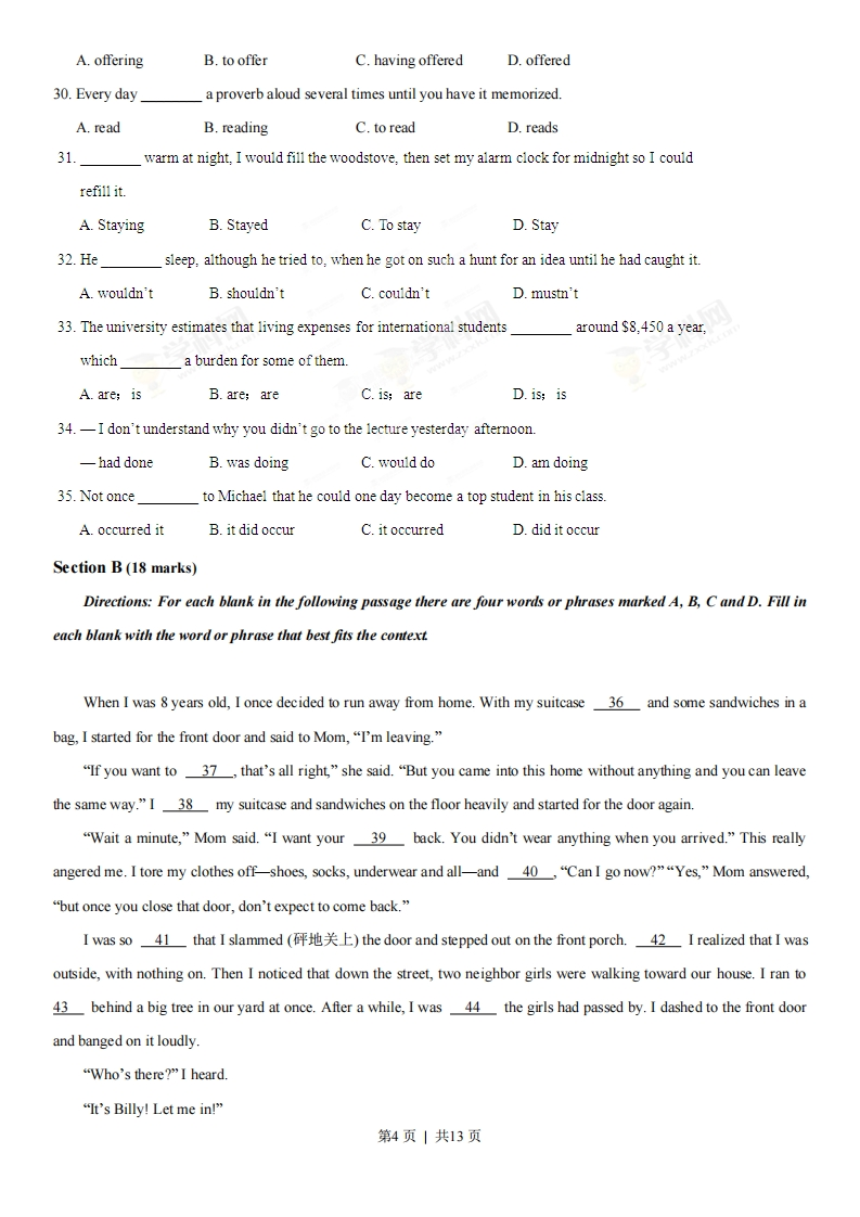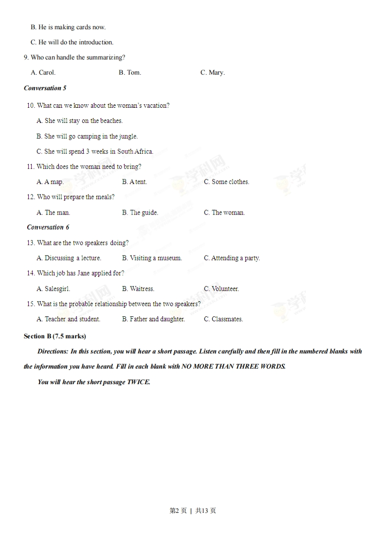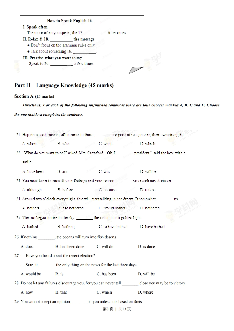 2013年普通高等学校招生全国统一考试(湖南卷)英语Part I Listening Comprehension (30 marks)Section A (22.5 marks)Directions:In this section,yat will hear six conversations between two speakers.For each conversation,there areseveral questions and each question is followed by three choices marked A,B and C.Listen carefully and then choosethe best answer for each question.You will hear each conversation TWICE.Conversation 11.Where is the man going?A.Kennedy.B.London.C.New York.2.When should the man arrive at the airport?A.By8:15.B.By900.C.By9:25.Conversation 23.What is the woman doing?A.Taking a taxi.B.Doing shopping.C.Waiting for the man.4.Where are the two speakers going to meet?A.At home.B.In a shopC.In a restaurantConversation 35.What is the woman looking for?A.Apan.B.Carrots.C.Tomatoes.6.What will the speakers probably have tonight?A.French fries.B.Noodles.C.Fried chicken.Conversation 47.What will the project focus on?A.A dog.B.A fish.C.A cat8.What can we know about John?A.He has conducted the survey.第1页|共13页B.He is making cards now.C.He will do the introduction.9.Who can handle the summarizing?A.Carol.B.Tom.C.Mary.Conversation 510.What can we know about the woman's vacation?A.She will stay on the beaches.B.She will go camping in the jungleC.She will spend 3 weeks in South Africa.11.Which does the woman need to bring?A.A map.B.Atent.C.Some clothes.学12.Who will prepare the meals?A.The manB.The guide.C.The woman.Conversation 613.What are the two speakers doing?A.Discussing a lecture.B.Visiting a museumC.Attending a party.14.Which job has Jane applied for?A.Salesgirl.B.Waitress.C.Volunteer.15.What is the probable relationship between the two speakers?A.Teacher and student.B.Father and daughter.C.Classmates.Section B(7.5 marks)Directions:In this section,you will hear a short passage.Listen carefully and then fill in the numbered blanks withthe information you have heard.Fill in each blank with NO MORE THAN THREE WORDS.You will hear the short passage TWICE.第2页|共13页How to Speak English 16.I.Speak oftenThe more often you speak,the 17it becomesⅡ.Relax&18.the messageDon't focus on the grammar rules only.Talk about something 19.III.Practise what you want to saySpeak to 20.a few times.Part II Language Knowledge(45 marks)Section A (15 marks)Directions:For each of the following unfinished sentences there are four choices marked A,B,C and D.Choosethe one that best completes the sentence.21.Happiness and success often come to thoseare good at recognizing their own strengths.A.whomB.whoC.whatD.which22."What do you want to be?"asked Mrs.Crawford."Oh,Ipresident,"said the boy,with asmile.A.have beenB.amC.wasD.will be23.You must learn to consult your feelings and your reasonyou reach any decision.A.althoughB.beforeC.becauseD.unless24.Around two o'clock every night,Sue will start talking in her dream.It somewhat11s.A.bothersB.had botheredC.would botherD.bothered25.The sun began to rise in the sky,the mountain in golden light.A.bathedB.bathingC.to have bathedD.have bathed26.If nothingthe o