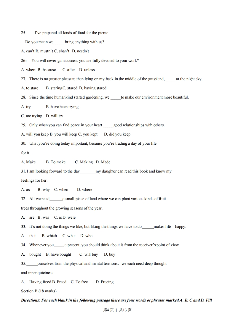 绝密★启用前2014年普通高等学校招生全国统一考试(湖南卷)英谱本试题卷分四个部分,共12页。时量120分钟。满分150分。Part I Listening Comprehension (30 marks)Section A (22.5 marks)Directions:In this section,you will hear six conversations between two speakers.For each conversation,there areseveral questions and each question is followed by three choices marked A,B and C.Listen carefully and thenchoose the best answer for each question.You will hear each conversation TWICEExample:When will the magazine probably arrive?A.Wednesday.B.Thursday.C.Friday.The answer is B.Conversation 11.What will the woman do first?A.Take a shower.B.Go camping.C.Set up a time.2.When will the man probably call the woman?A.Thursday.B.Friday.C.Sunday.Conversation 23.What is the man going to do?A,Have a coffee break.B.See a doctor.C.Buy a pet.4.What happened to the man?A.He fell ill.B.He lost his dog.C.He slept badly.Conversation 35.What is the woman?A.A bus driver.B.A waitress.C.A tour guide.6.What does the man want to get?A.Some gifts.B.A menu.C.A bus schedule.第1页|共13页Conversation 47.What did the man do yesterday?A.He saw a movie.B.He watched TV.C.He visited some friends.英语试题第1页(共12页)8.What time will the speakers probably meet this Saturday evening?A.At6:30.B.At7:00.C.At7:309.Which of the following will the man buy?A.Some drinks.B.A birthday cake.G.Concert tickets.Conversation 510.What is the woman doine aow?独家制作侵权必究一学网2014A.She is serving a customer.B.She is conducting an interview.C.She is doing some resording.11.When does the man go te the nursing home?A.Tuesdays.B.Thursdays.C Sundays.12.Where will the man probabiy be working next Monday?侵权必究A.At the airport nearby.B.In the studio next doos,C.At the store downtown.Conversation 613.Why does the woman call the man?A.The oven doesn't work.B.The heater won't start.C.The plug is broken.14.Who will handle the problem first tomorrow evening?A.The woman.B.The man.C A worker.15.Who is the woman speaking to?A.Her husband.B.Her house owner.C.Her boss.第2页|共13页Section B(7.5 marks)Directions:In this section,you will hear a short passage.Listen carefully and then Jill in the numbered blanks withthe information you have heard.Fill in each blank with NO MORE THAN THREE WORDS.You will hear the short passage TWICE.Voice Mail from Kelly Black1.Call Mr.Brown to 16the appointment time.2.E-mail the staff members about next week's 173.Ask the repairman to fix the broken 18 in the office.4.Give a list of all the employees to the 19 owner.5.Take 20 on the desk to the post office.Part II Language Knowledge(45 marks)Section A (15 marks)Directions:For each of the following unfinished sentences there are four choices marked A,B.C and IXChoose the one that best completes the sentence.ZXXKExample:The wild flowers looked like a soft orange blanket the desert,A.covering B.covered C.cover D.to coverThe answer is A.21.Children,whenby their parents,are allowed to enter the stadium.A.to be accompanied B.to accompanyC.accompanying D.accompanied22.If Mr.Deweypresent,he would have offered any possible assistance