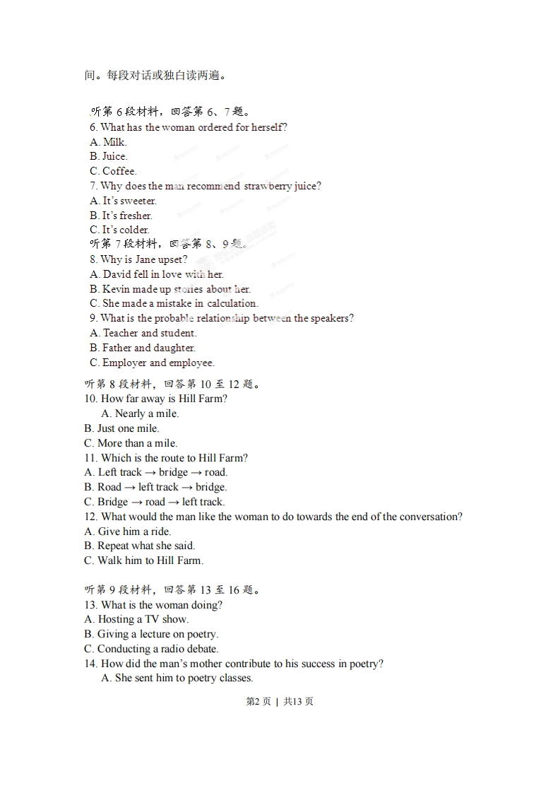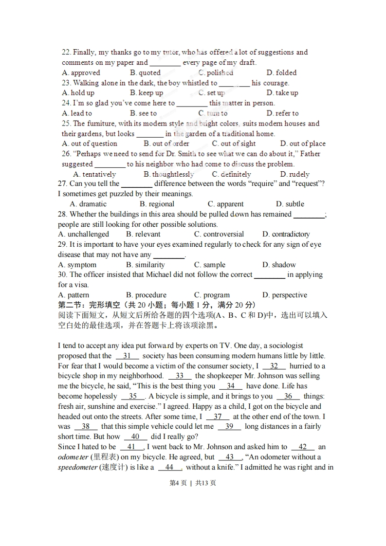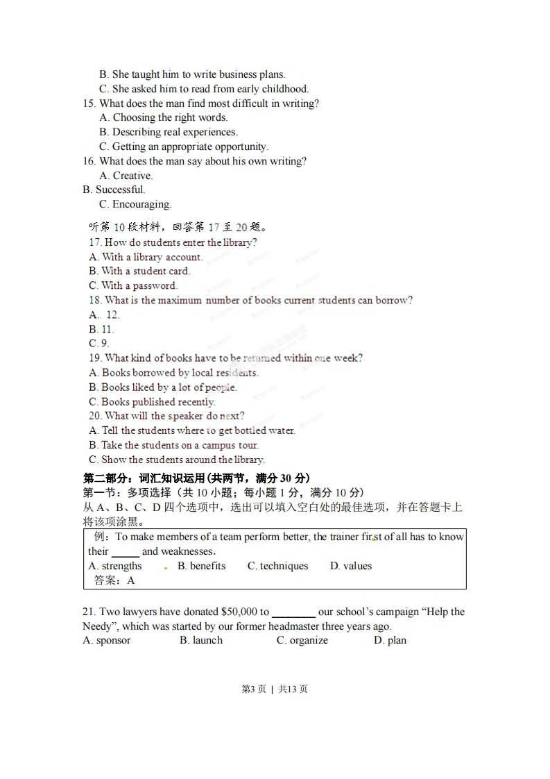 2012年普通高等学校招生全国统一考试(湖北卷)英语第一部分:听力(共两节,满分30分)做题时,先将答案划在试卷上。录音内容结束后,你将有两分钟的时间将试卷上的答案转涂到答题卡上。第一节(共5小题;每小题1.5分,满分7.5分)听下面5段对话。每段对话后有一个小题,从题中所给的A、B、C三个选项中选出最佳选项,并标在试卷的相应位置。听完每段对话后,你都有10秒钟的时间来回答有关小题和阅读下一小题。每段对话仅读一遍。例:How much is the shirt?A.£19.15.B.£9.15.C.£9.18.答案:B1.What is the problem for the man?A.He has to meet many people.B.He has toleave his friends.C.He has to travel a lot.2.How does the man think of the book?A.Humorous.B.Scientific.C.Popular.3.What's the matter with the woman?A.She has caught a bad coldB.She stayed online toolong.C.She is allergic to paint smell4.What does the man suggest the woman do?A.Consult a repair shopB.Purchase another car.C.Fix the car herseif.5.In which year is the man in college now?A.The first year.B.The second yearC.The third year.第二节(共15小题;每小题1.5分,满分22.5分)听下面5段对话或独白。每段对话或独白后有几个小题,从题中所给的A、B、C三个选项中选出最佳选项,并标在试卷的相应位置。听每段对话或独白前,你将有时间阅读各个小题,每小题5秒钟听完后,各小题将给出5秒钟的作答时第1页|共13页间。每段对话或独白读两遍。听第6段材料,回答第6、7题。6.What has the woman ordered for herself?A.Milk.B.Juice.C.Coffee.7.Why does the man recommend strawberry juice?A.It's sweeter.B.It's fresherC.It's colder.听第7段材料,回答第8、9题。8.Why is Jane upset?A.David fell in love with her.B.Kevin made up stories about her.C.She made a mistake in calculation.9.What is the probable relationship between the speakers?A.Teacher and student.B.Father and daughter.C.Employer and employee.听第8段材料,回答第10至12题。10.How far away is Hill Farm?A.Nearly a mile.B.Just one mile.C.More than a mile.11.Which is the route to Hill Farm?A.Left track→bridge→road.B.Road→left track→bridge.C.Bridge→road→left track12.What would the man like the woman to do towards the end of the conversation?A.Give him a ride.B.Repeat what she said.C.Walk him to Hill Farm.听第9段材料,回答第13至16题。13.What is the woman doing?A.Hosting a TV show.B.Giving a lecture on poetry.C.Conducting a radio debate.14.How did the man's mother contribute to his success in poetry?A.She sent him to poetry classes.第2页|共13页B.She taught him to write business plans.C.She asked him to read from early childhood.15.What does the man find most difficult in writing?A.Choosing the right words.B.Describing real experiences.C.Getting an appropriate opportunity16.What does the man say about his own writing?A.CreativeB.Successful.C.Encouraging听第10段材料,回答第17至20题。17.How do students enter the library?A.With a library account.B.With a student card.C.With a password.18.What is the maximum number of books current students can borrow?A.12B.11.c.9.19.What kind of books have to be retured within one week?A.Books borrowed by local residents.B.Books liked by a lot of peopleC.Books published recentiy.20.What will the speaker do next?A.Tell the students where to get bottled water.B.Take the students on a campus tourC.Show the students around the library.第二部分:词汇知识运用(共两节,满分30分)第一节:多项选择(共10小题;每小题1分,满分10分)从A、B、C、D四个选项中,选出可以填入空白处的最佳选项,并在答题卡上将该项涂黑。To make members of a team perform better,the trainer first of all has to knowtheir and weaknesses.A.strengths.B.benefitsC.techniquesD.values答案:A21.Two lawyers