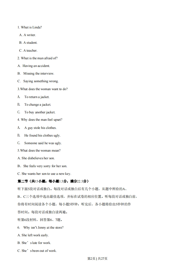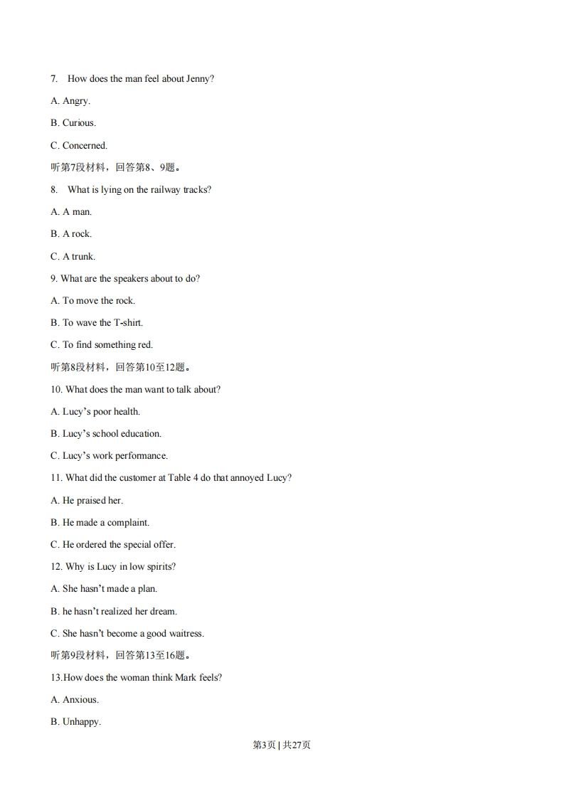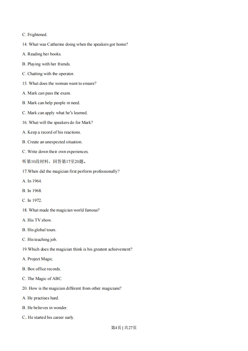 绝密★启用前2014年普通高等学校招生全国统-考试(湖北卷)英语本试题卷共16页,81题。全卷满分150分。考试用时120分钟。★祝考试顺利★【试题总评】试题总体难度不大,单项填空以单词的记忆与辨析为主,主要集中于名词、动词、形容词、副词以及介词短语;完型填空较为简单为故事型的记叙文,选项基本上可根据上下文获得,词汇为考纲中常见单词为主较易区分,阅读理解以时嘉英、新偏类和生活百科类的记叙文为主,题目设置上主要是细节题,也包括文章主旨大意、标题等推理判断题,总体上难废都不大:完成句子部分主要是单词在语境中的语法运用,涉及到了时态语态、定语从句、览句。情态动词以及固定句型等常见语法知识点,考查相对较广,有一定难度;书面表达给的是英文捍示任务,要求考生弄清主旨要求举一事例,只要能理清主旨要求应该可以完成相对较易的写作任务。注意事项:1.答卷前,先将自己的姓名、准考证号填写在试题卷和答题卡上,并将准考证号条形码粘贴在答题卡上的指定位置。用统一提供的2B铅笔将答题卡上试卷类型A后的方框涂黑。2.选择题的作答:每小题选出答案后,用统一提供的2B铅笔把答题卡上对应题目的答案标号涂黑。写在试题卷、草稿纸和答题卡上的非答题区域均无效。3.完成句子和短文写作题的作答:用统一提供的签字笔直接答在答题卡上对应的答题区域内。写在试题卷、草稿纸和答题卡上的非答题区域均无效。4.考试结束后,请将本试题卷和答题卡一并上交。第一部分:听力(共两节,满分30分)做题时,先将答案划在试卷上。录音内容结束后,你将有两分钟的时间将试卷上的答案转涂到答题卡上。第一节(共5小题;年小题1.5分,满分7.5分)听下面5段对话。每段对话后有一个小题,从题中所给的A、B、C三个选项中选出最佳选项,并标在试卷的相应位置。听完每段对话后,你都有10秒钟的时间来回答有关小题和阅读下一小题。每段对话仅读一遍。例:How much is the shirt?A.£19.15.B.f9.15.C.f9.18第1页1共27页1.What is Linda?A.A writerB.A student.C.Ateacher.2.What is the man afraid of?A.Having an accident.B.Missing the interview.C.Saying something wrong.3.What does the woman want to do?A.To return a jacket.B.To change a jacket.C.To buy another jacket.4.Why does the man feel upset?A.A guy stole his clothes.B.He found his clothes ugly.C.Someone said he was ugly.5.What does the woman mean?A.She disbelieves her son.B.She feels very sorry for her son.C.She wants her son to use a new key.第二节(共15小题;每小题1.5分,满分22.5分)听下面5段对话或独白。每段对话或独白后有几个小题,从题中所给的A、B、C三个选项中选出最佳选项,并标在试卷的相应位置。听每段对话或独白前,你将有时间阅读各个小题,每小题5秒钟:听完后,各小题将给出5秒钟的作答时间。每段对话或独白读两遍。听第6段材料,回答第6、7题。6.Why isn't Jenny at the store?A.She left work early.B.She's late for workC.She's been out of work.第2页1共27页7.How does the man feel about Jenny?A.Angry.B.Curious.C.Concerned.听第7段材料,回答第8、9题。8.What is lying on the railway tracks?A.A man.B.A rockC.A trunk.9.What are the speakers about to do?A.To move the rock.B.To wave the T-shirt.C.To find something red.听第8段材料,回答第10至12题。10.What does the man want to talk about?A.Lucy's poor health.B.Lucy's school education.C.Lucy's work performance.11.What did the customer at Table 4 do that annoyed Lucy?A.He praised her.B.He made a complaint.C.He ordered the special offer12.Why is Lucy in low spirits?A.She hasn't made a plan.B.he hasn't realized her dream.C.She hasn't become a good waitress.听第9段材料,回答第13至16题。13.How does the woman think Mark feels?A.Anxious.B.Unhappy.第3页1共27页