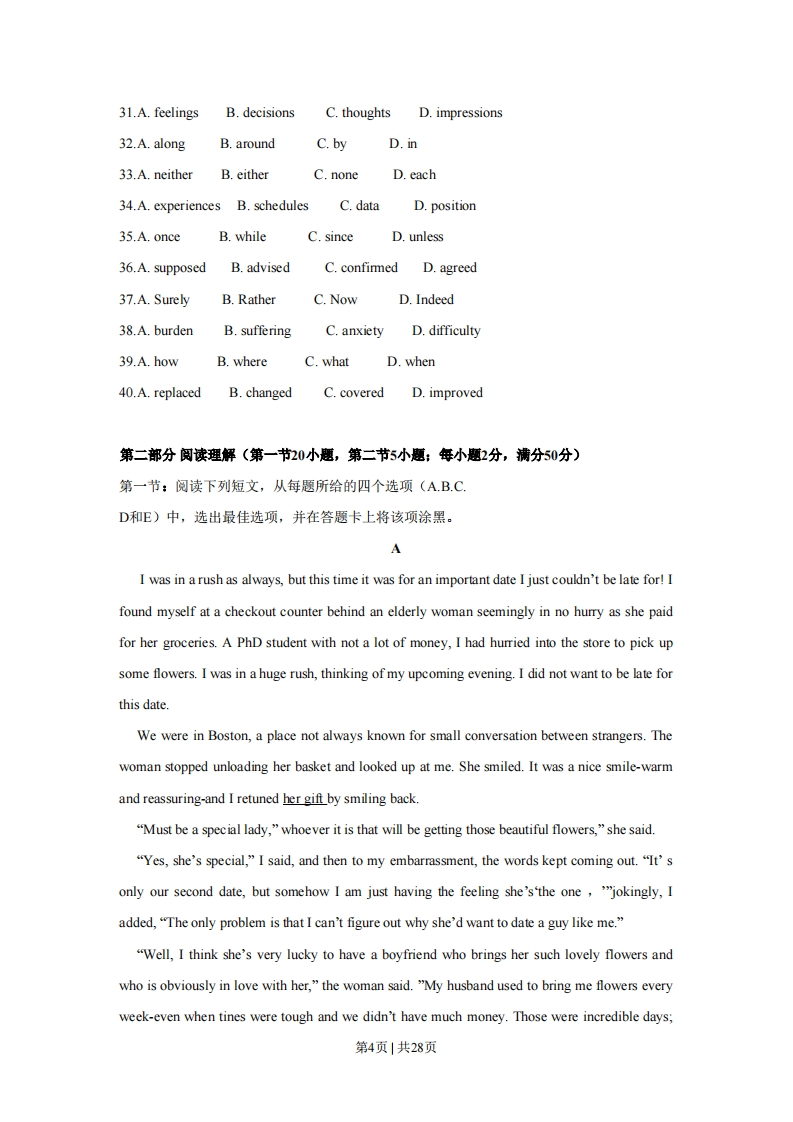 2009年普通高等学校招生全国统一考试(浙江卷)英语第一部分:英语知识运用(共两节,满分30分)第一节单项填空(共20小题:每小题0.5分,满分10分)从AB.C.D四个选项中,选出可以填入空白处的最佳选项,并在答题卡上将该项标号涂黑。1.-Hey,you haven't been acting like yourself.Everything OKA.I'm fine,thanks B Sure,it is C.That's good D It's OK2.I don't understand what the engineer means,but I've gotrough idea ofProject planA.the;aB.不填:theC.the:不填D.a;he3.and short of breath,Andy and Ruby were the first to reach the top of Mount Tai.A.To be tried B.Tired C.Tiring D.Being tired4.-I've read another book this week-Well,maybe is not how much you read but what you read that counts.A .this B.that C.there D.it5.The incomes of skilled workers went up.,unskilled workers saw their earnings fall.A.Moreover B.ThereforeC.MeanwhileD.Otherwise6.The system has been designed to give students quick and easyto the digital resources ofthe library.A.accessB.passage C.way D.approach7.There is a great deal ofevidencethat music activities engage different parts of the brain.A.indicate B.indicating C.to indicate D.to be indicating8.The medicine works more effectivelyyou drink some hot water after taking it.A as B until C although D if9.Over the past decades,sea ice in the Arctic as a result of global warming.A.had decreased B decreased C has been decreasing D is decreasing10.It took building supplies to construct these energy-saving houses.It took brains,too.第1页1共28页A other than B more than C rather than D less than11.The good thing about children is that they very easily to new environments.A adapt B appeal Cattach Dapply12.-Is there any possibilityyou could pick me up at the airport-No problemA when B that C whether Dwhat13.The doctor recommended that youswim after eating a large meal.A wouldn't B couldn't C needn't D shouldn't14.I have reached a point in my life I am supposed to make decisions of my own.A which B where Chow D why15.John is very-if he promises to do something he'll do it.A independent B confident C reliable D flexible16.Practising Chinese kung fu can not only one's strength,but also develop one's character.A bring up B take up C build up D pull up17.-Do you want another drinkA I don't think so B No way C Not at all D I wouldn't say no18.,the pay isn't attractive enough,though the job itself is quite interesting.A Generally speakingB On the contraryC In particularD To be honest19.In the good care of the nurses,the boy isrecovering from his heart operationA quietly B actually C practically D gradually20.-What do you think of the movie-It's fantastic.The only pity is that Ithe beginning of it.A missedB had missed Cmiss D would miss第二节:完形填空(共20小题:每小题1分,满分20分)阅读下面短文,掌握其大意,然后从21~40各题所给的四个选项(A.B.C和D)中,选出最佳选项,并在答题纸上将该选项标号涂黑。第2页1共28页The trip to that city was eye-opening for everyone,and near its end,all the young people inour group began to reflect on what it had meant.We 21 the first night we had arrived.Wehad all gone into the markets of the city 22 the young people could experience its energy.But what we actually saw simply 23 us all---the rundown houses,the children in ra