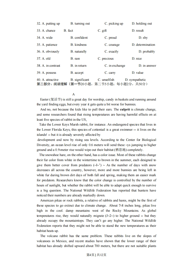 2012年浙江高考英语试题选择题部分,(共80分)第一部分:英语知识运用(共两节,满分30分)第一节:(共20小题:每小题0.5分,满分10分)1.-----Is there anything else to discuss?I guessA.Not at all B.No ,that's all C.Yes,I'm sure D.Yes,of course2.The development of industry has been_gradual process throughouthuman existence from stone tools to modern technologyA,/,the B,the,a C,a,/D,a,a3.No matter how bright a talker you are,there are times when it's bettersilentA,remain B,be remaining C,having remained D,to remain4.I made a promise to myself this year,my first year in high school,wouldbe different.A,whether B,what C,that D,how5.Studying Wendy's menu,I found that many of the items are similar to ofMcDonald'sA,those B,ones C,any D,all6.all the animals I 've ever had ,those two dogs are the most sensitive tospoken word.A.From B.Of C.For D.With7.Youras a student will be excellent if you develop a habit of reflecting onhow you learn.A,opinion B,growth C,performance D,character8.I think Tom,as the head of a big department,should either study regualrly orhis job.A,quits B,to quit C,quitting D,quit9.We live in an agemore information is available with great ease than everbefore.A,why B,when C,to whom D.on which10.The research lacks_evidence ,and therefore,its conclusions are doubtful.A,solid B,fierce C,severe D,potential11."It's such a nice place,"Mother said as she sat at the table for customers.第1页1共12页A,to be reserved B,having reserved C,reserving D,reserved12.According to scientists,our mental abilities begin tofrom the age of 27 afterreaching the highest level at 22.A,differ B,shrink C,fail D,decline13.Peter had intended to take a job in business,butthat plan after theunpleasant experience in Canada in 2010.A,had abandoned B,abandoned C,abandon D,will abandon14.Brown said he was by no means annoyed;he was glad to be able makehimself clearly understood.A,all in all B,for one thing C,on the contrary D,by the way15.Armed with the information you have gathered,you canpreparing yourbusiness plan.A,set out B,set about C,set off D,set up16.---Alvin,are you coming with us?------I'd love to,but something unexpectedA,has come up B,was coming up C,had come up D,would come up17.Ellen was a painter of birds and nature,for some reason,had withdrawnfrom all human society.A,which B,who C,where D,whom18.Mike was usually so careful,this time he made a small mistake.A,yet B,still C,even D,thus19.Had they known what was coming next,theysecond thoughts.A,may have B,could have C,must have had D,might have had20.----I'm going to San Francisco for a couple of days.,I wish I could get away for a while.A.It doesn't matter B.Forget it.C.I really envy you D.I can't agree more第二节:完形填空(共20小题:每小题1分,满分20分)"Just sign here,sir,"the deliveryman said as he handed Oscar Reyna a packageThe package consisted of a long,narrow box21wrapped in brown paper22the box,Oscar saw an umbrella inside-a very old one with a beautifullycarved handle.23He had not seen it in more than 20 years,he recognized it24第2页|共12页Oscar was 16 when he first saw the 25 umbrella.H