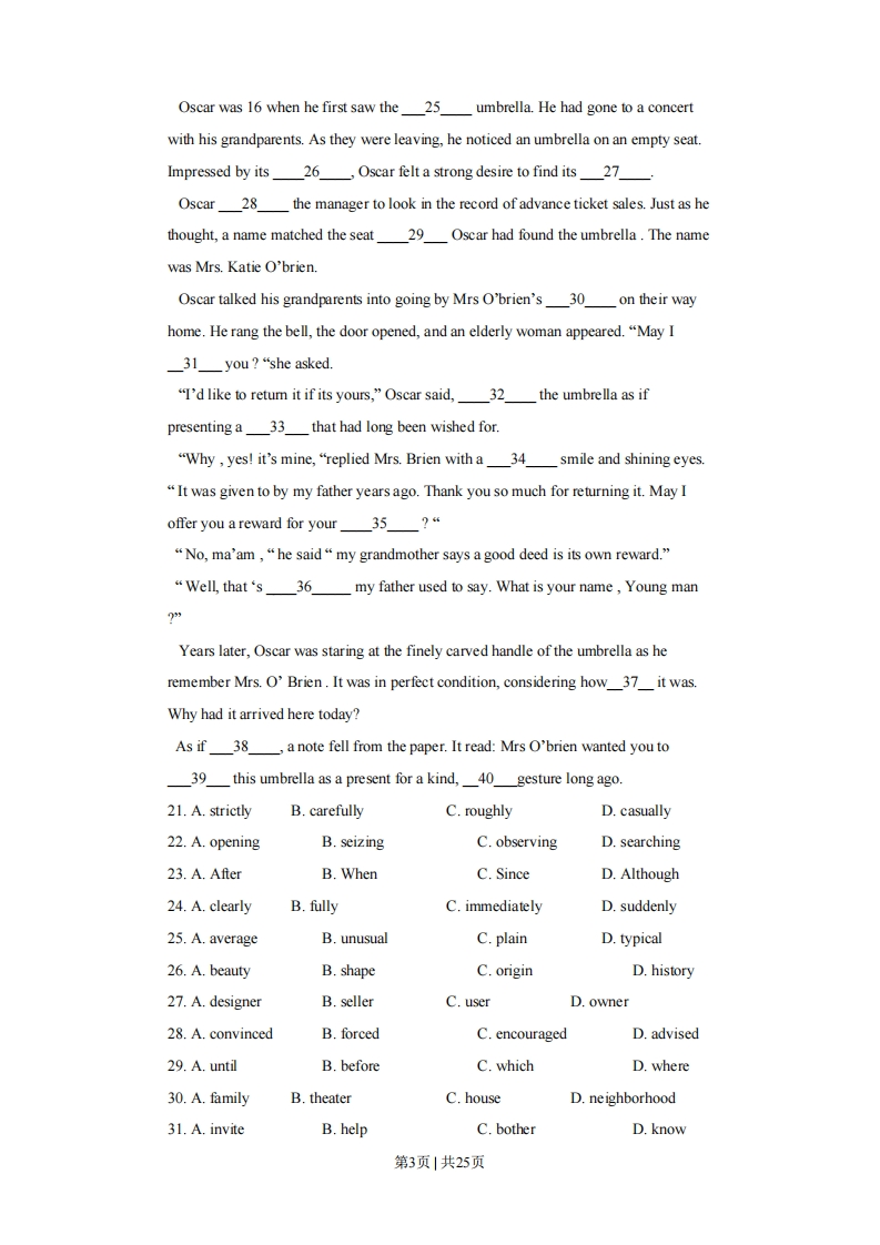 2012年浙江高考英语试题选择题部分,(共80分)第一部分:英语知识运用(共两节,满分30分)第一节:(共20小题:每小题0.5分,满分10分)1.-----Is there anything else to discuss?I guessA.Not at all B.No ,that's all C.Yes,I'm sure D.Yes,of course2.The development of industry has been_gradual process throughouthuman existence from stone tools to modern technologyA,/,the B,the,a C,a,/D,a,a3.No matter how bright a talker you are,there are times when it's bettersilentA,remain B,be remaining C,having remained D,to remain4.I made a promise to myself this year,my first year in high school,wouldbe different.A,whether B,what C,that D,how5.Studying Wendy's menu,I found that many of the items are similar to ofMcDonald'sA,those B,ones C,any D,all6.all the animals I 've ever had ,those two dogs are the most sensitive tospoken word.A.From B.Of C.For D.With7.Youras a student will be excellent if you develop a habit of reflecting onhow you learn.A,opinion B,growth C,performance D,character8.I think Tom,as the head of a big department,should either study regualrly orhis job.A,quits B,to quit C,quitting D,quit9.We live in an agemore information is available with great ease than everbefore.A,why B,when C,to whom D.on which10.The research lacks_evidence ,and therefore,its conclusions are doubtful.A,solid B,fierce C,severe D,potential11."It's such a nice place,"Mother said as she sat at the table for customers.第1页1共25页A,to be reserved B,having reserved C,reserving D,reserved12.According to scientists,our mental abilities begin tofrom the age of 27 afterreaching the highest level at 22.A,differ B,shrink C,fail D,decline13.Peter had intended to take a job in business,butthat plan after theunpleasant experience in Canada in 2010.A,had abandoned B,abandoned C,abandon D,will abandon14.Brown said he was by no means annoyed;he was glad to be able makehimself clearly understood.A,all in all B,for one thing C,on the contrary D,by the way15.Armed with the information you have gathered,you canpreparing yourbusiness plan.A,set out B,set about C,set off D,set up16.---Alvin,are you coming with us?------I'd love to,but something unexpectedA,has come up B,was coming up C,had come up D,would come up17.Ellen was a painter of birds and nature,for some reason,had withdrawnfrom all human society.A,which B,who C,where D,whom18.Mike was usually so careful,this time he made a small mistake.A,yet B,still C,even D,thus19.Had they known what was coming next,theysecond thoughts.A,may have B,could have C,must have had D,might have had20.----I'm going to San Francisco for a couple of days.,I wish I could get away for a while.A.It doesn't matter B.Forget it.C.I really envy you D.I can't agree more第二节:完形填空(共20小题:每小题1分,满分20分)"Just sign here,sir,"the deliveryman said as he handed Oscar Reyna a packageThe package consisted of a long,narrow box21wrapped in brown paper22the box,Oscar saw an umbrella inside-a very old one with a beautifullycarved handle.23He had not seen it in more than 20 years,he recognized it24第2页|共25页Oscar was 16 when he first saw the 25 umbrella.H